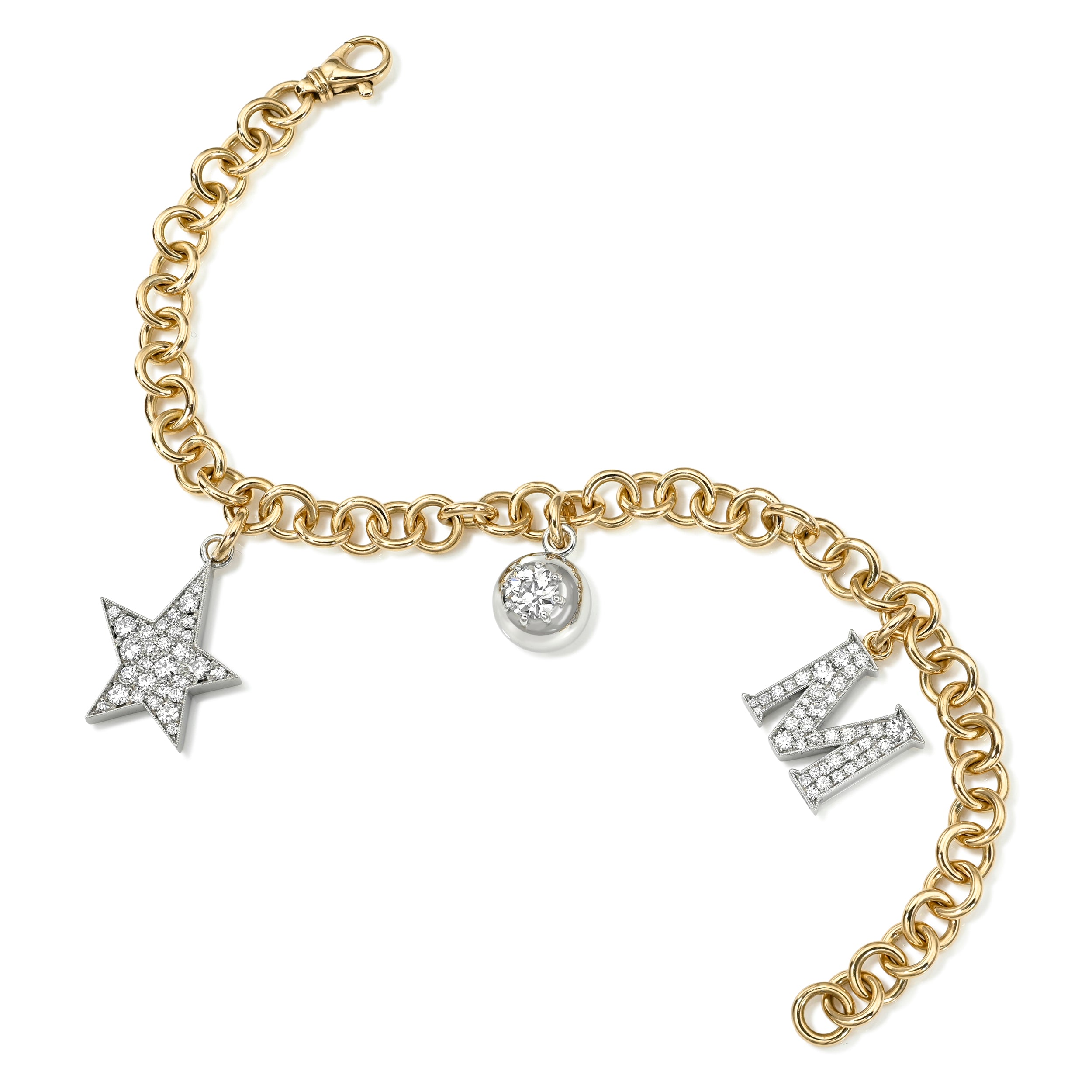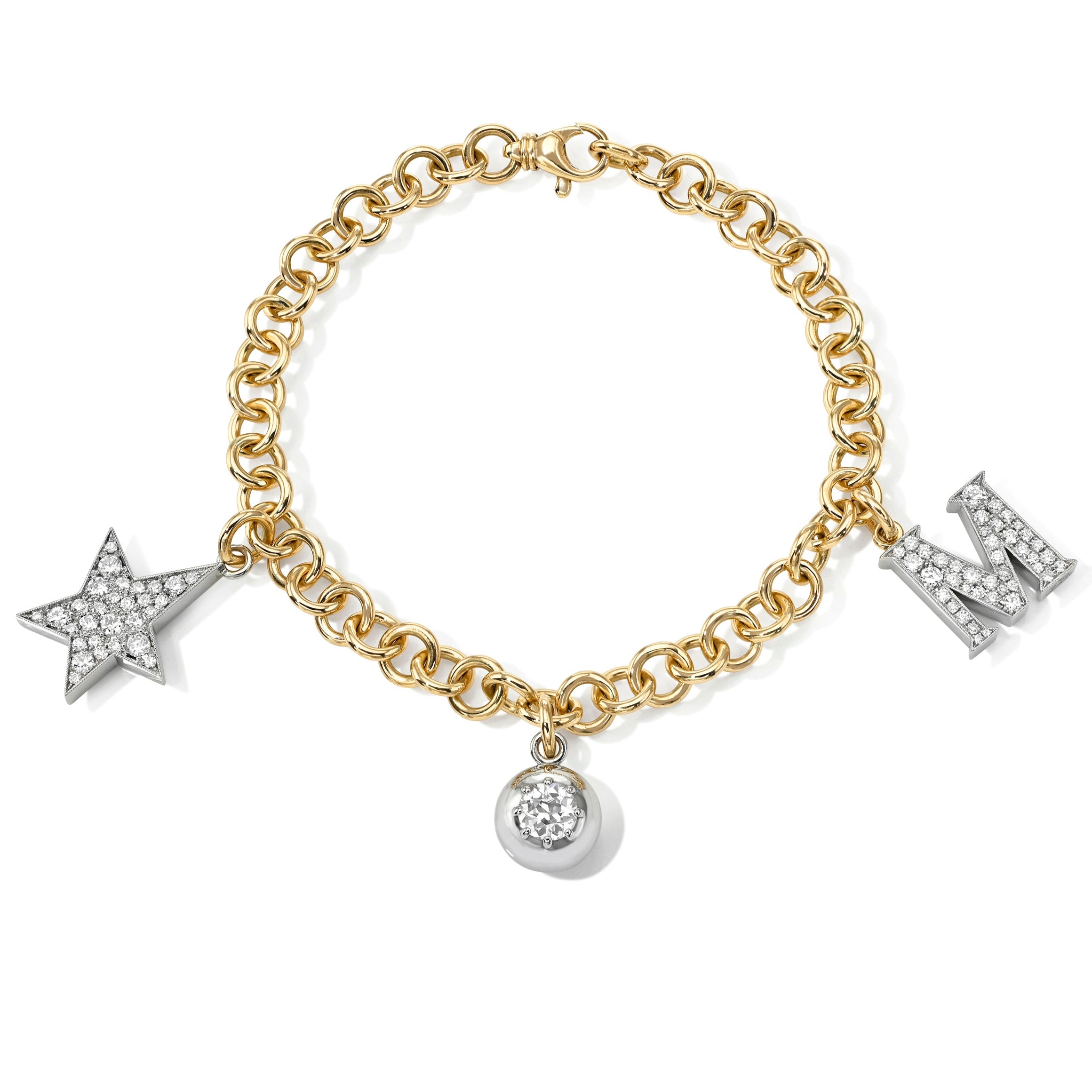 Our handcrafted 18K yellow gold Mini Club bracelet featuring three of our classic charms: a Small Two-Tone Cobblestone Letter M, a small platinum Cobblestone Kinsley with 1.16ctw varying old cut and round brilliant cut diamonds, and our sphere shaped Luna, in platinum, with a prong set 0.57ct J/SI2 GIA certified old European cut diamond.