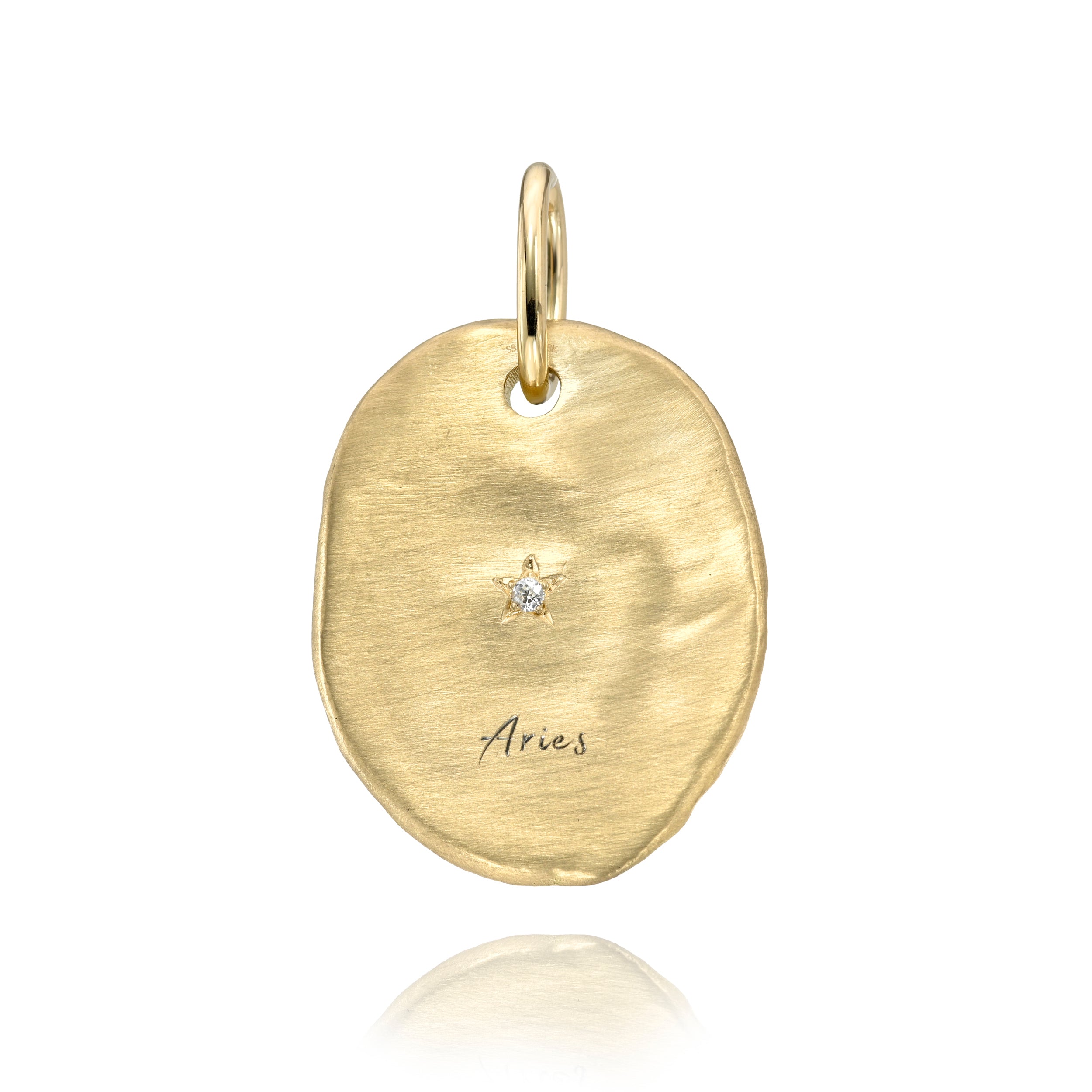 0.61ctw various old cut and round brilliant cut diamonds cobblestone set in a handcrafted, engraved hammer finished 18K yellow gold Aries zodiac themed oval shape pendant. Shown on our Kai chain