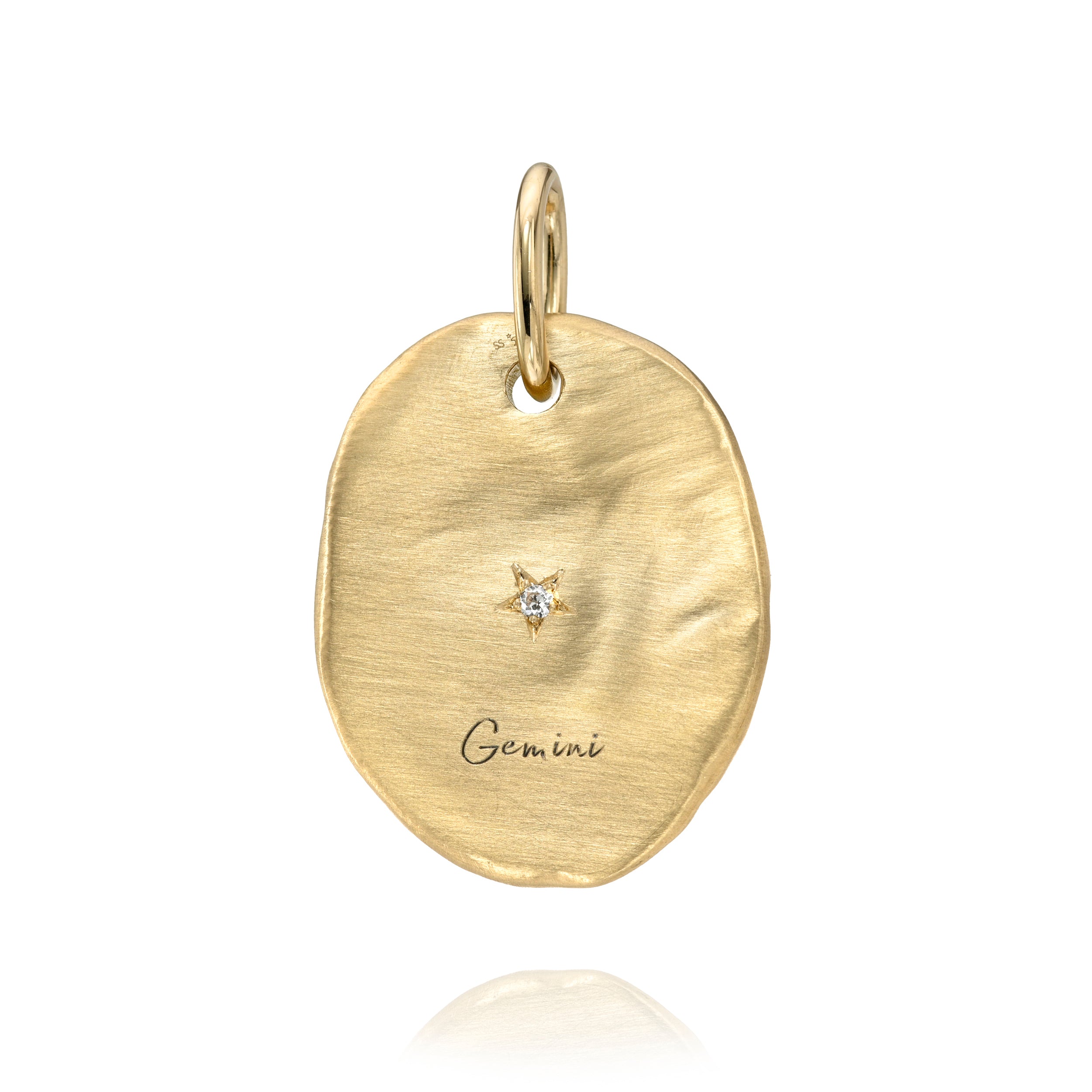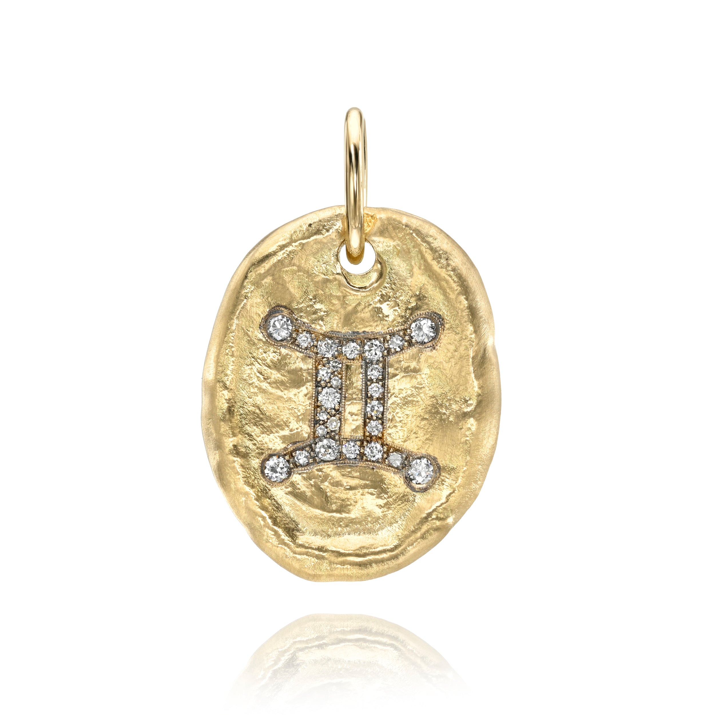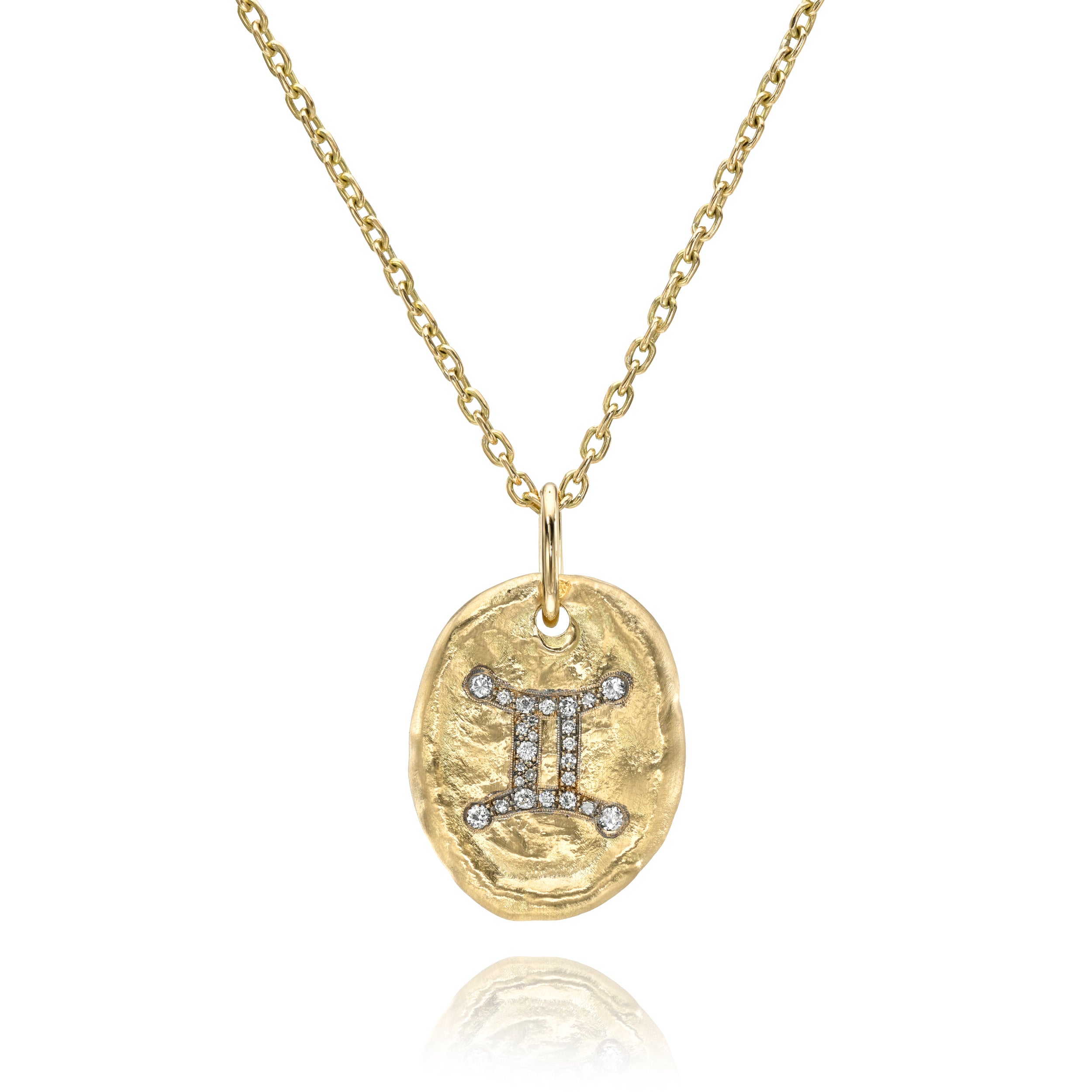 0.58ctw various old cut and round brilliant cut diamonds cobblestone set in a handcrafted, engraved hammer finished 18K yellow gold Gemini zodiac themed oval shape pendant. Shown on our Kai chain