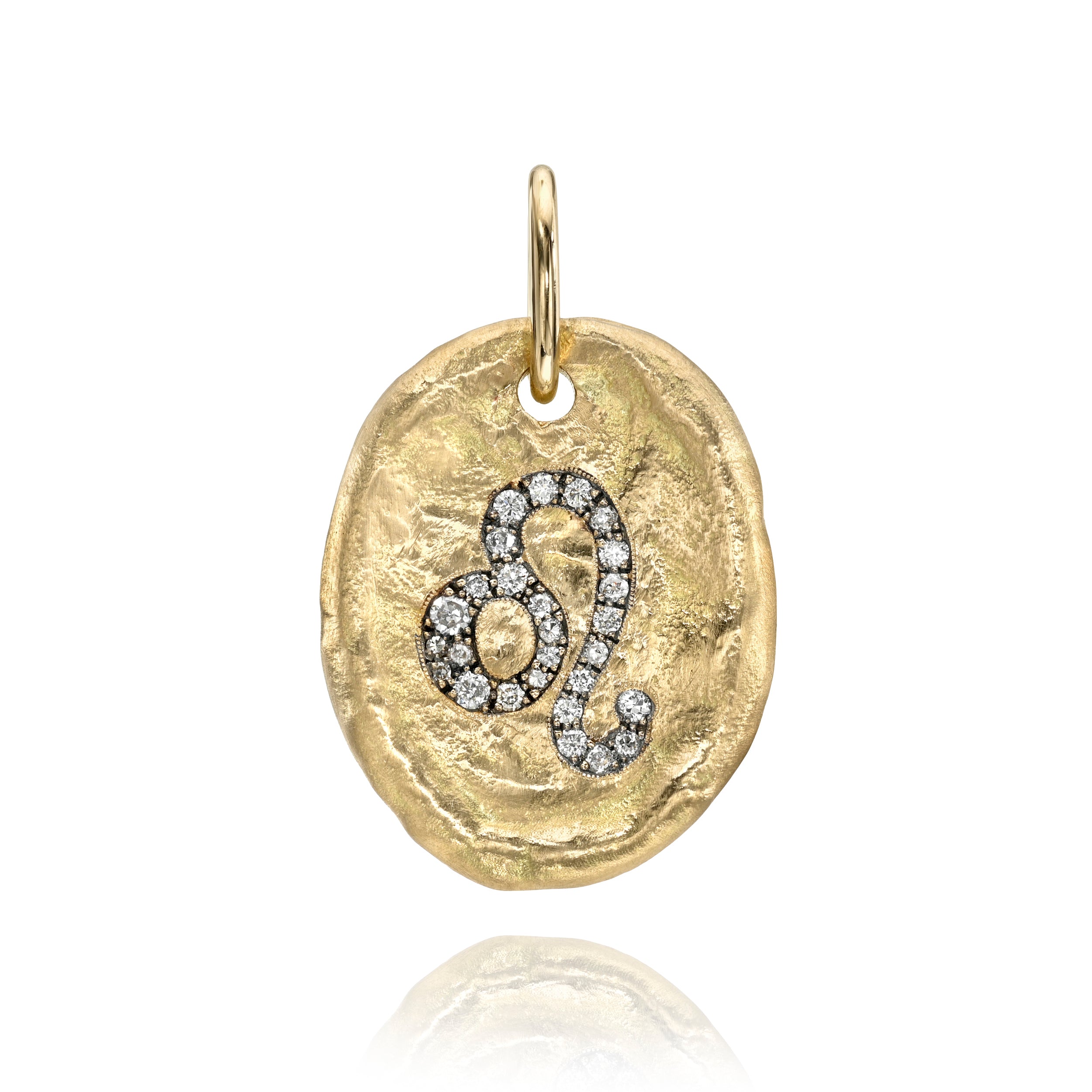 0.61ctw various old cut and round brilliant cut diamonds cobblestone set in a handcrafted, engraved hammer finished 18K yellow gold Leo zodiac themed oval shape pendant. Shown on our Kai chain