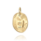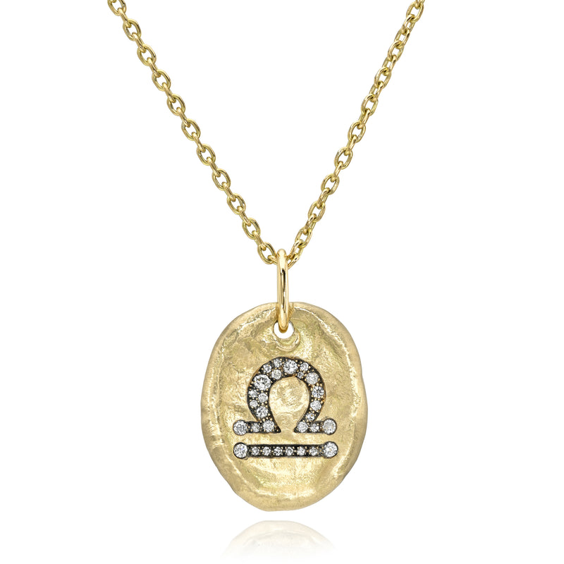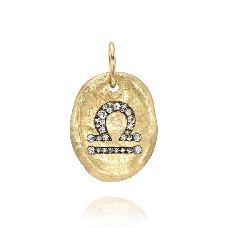0.82ctw various old cut and round brilliant cut diamonds cobblestone set in a handcrafted, engraved hammer finished 18K yellow gold Libra zodiac themed oval shape pendant.