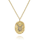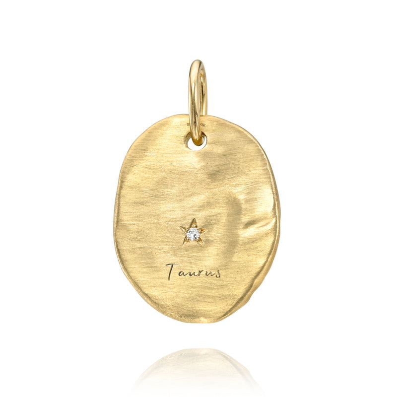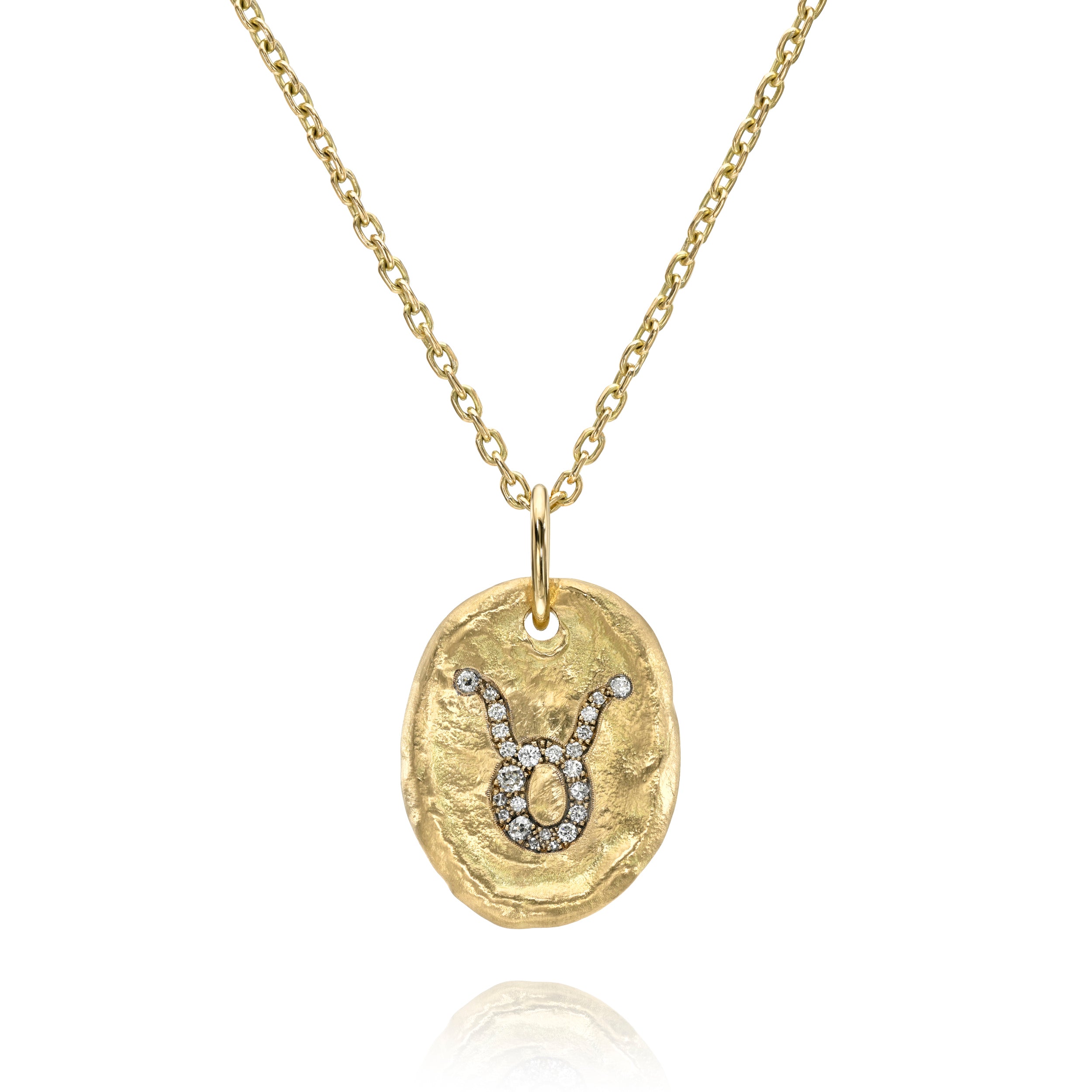 0.67ctw various old cut and round brilliant cut diamonds cobblestone set in a handcrafted, engraved, hammer finished 18K yellow gold Taurus zodiac themed pendant. Shown on our Kai chain