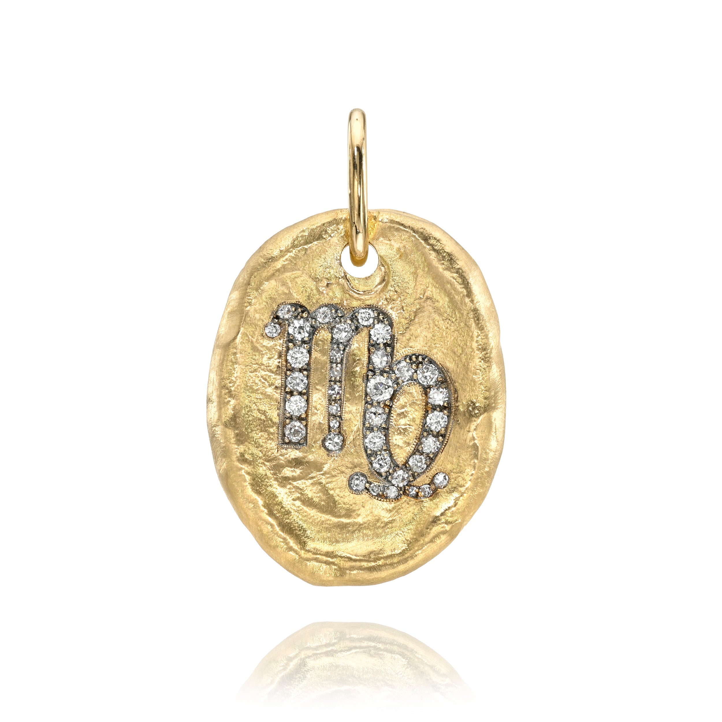 0.77ctw various old cut and round brilliant cut diamonds cobblestone set in a handcrafted, engraved hammer finished 18K yellow gold Virgo zodiac themed oval shape pendant. Shown on our Kai chain