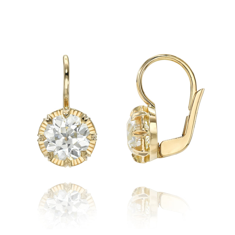 2.34ctw M/VVS2 GIA certified old European cut diamonds prong set in handcrafted 18K yellow gold leverback drop earrings.