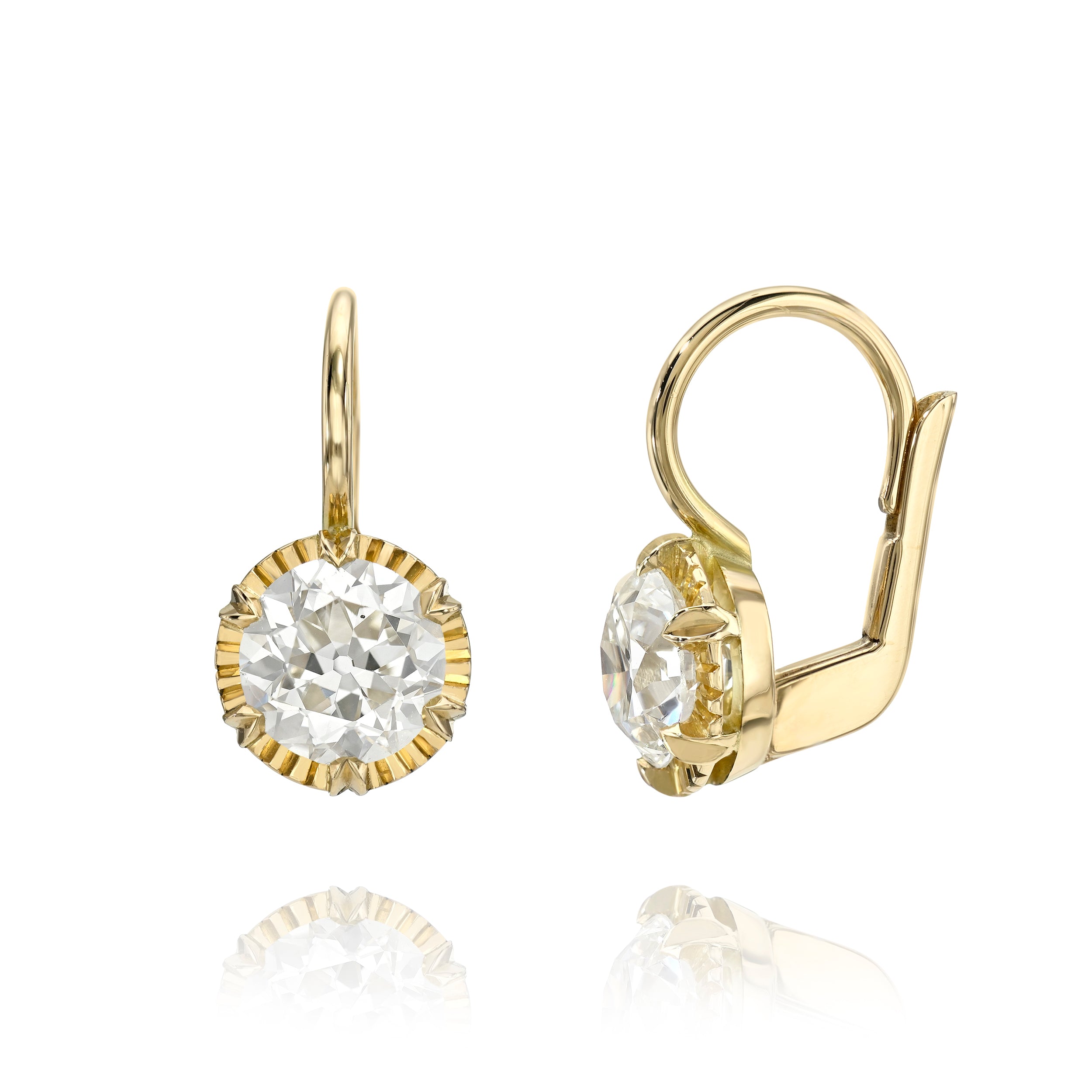 1.48ctw L/VVS2-VS1 GIA certified old European cut diamonds prong set in handcrafted 18K yellow gold leverback drop earrings.