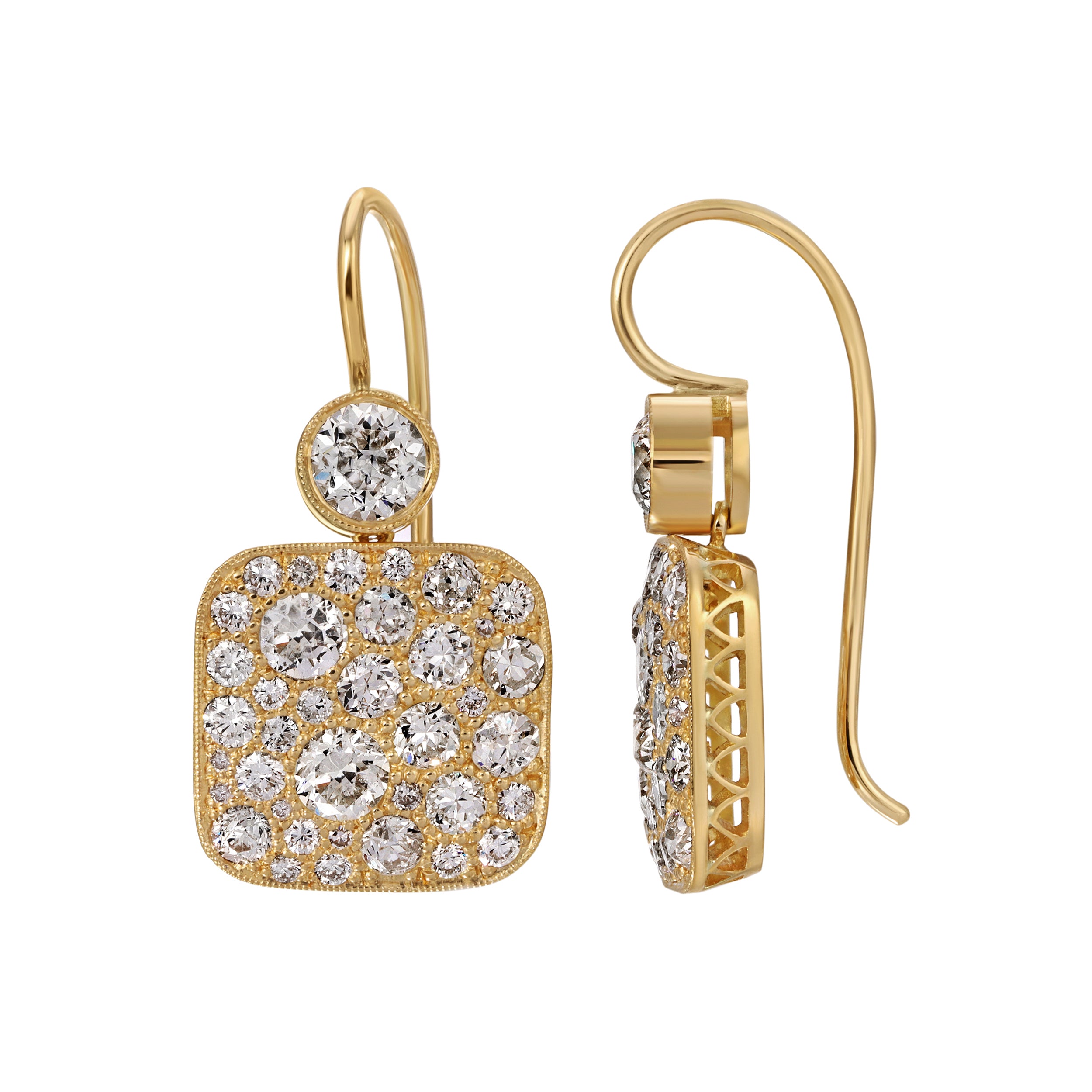 Approximately 3.70-3.90ctw various old cut and round brilliant cut diamonds set in set in handcrafted oxidized 18K yellow gold mountings. Price may vary according to total diamond weight. Measurements 14mm x 14mm.