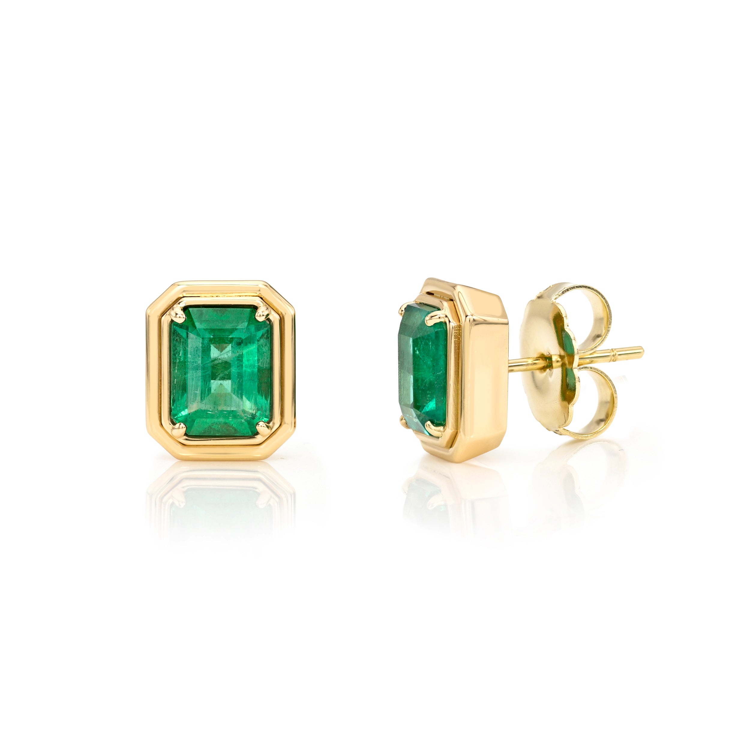 3.26ctw GIA certified Zambian emerald cut green emeralds prong set in handcrafted 18K yellow gold stud earrings.