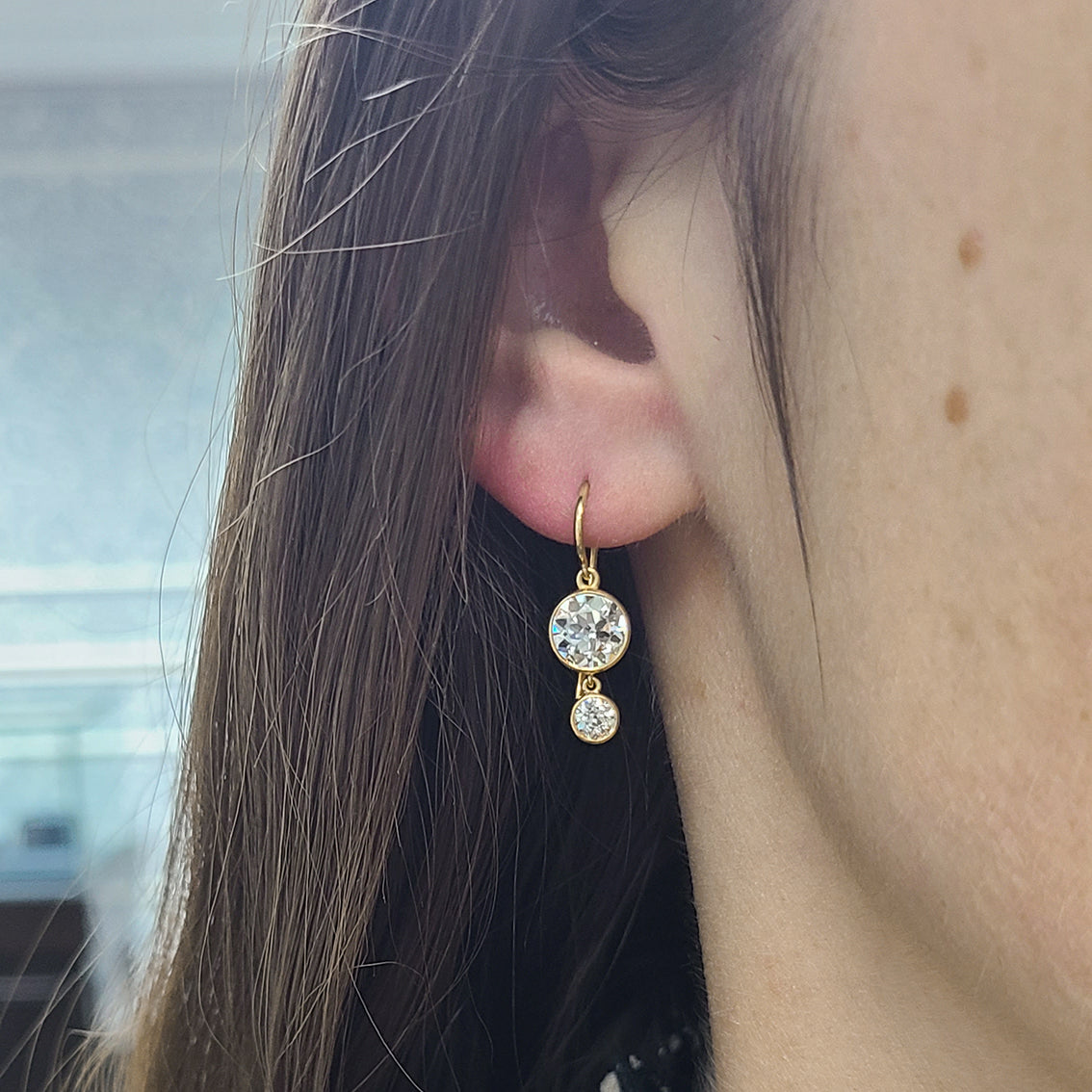 2.47ctw J-K/VS1-SI2 old European cut diamonds with 0.45ctw H-I/VS old European cut accent diamonds bezel set in handcrafted 18K yellow gold double drop earrings.