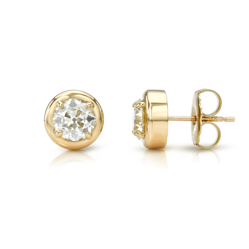 2.18ctw O,P,Q,R/VS1-SI1 GIA certified old European cut diamonds prong set in handcrafted 18K yellow gold stud earrings.
