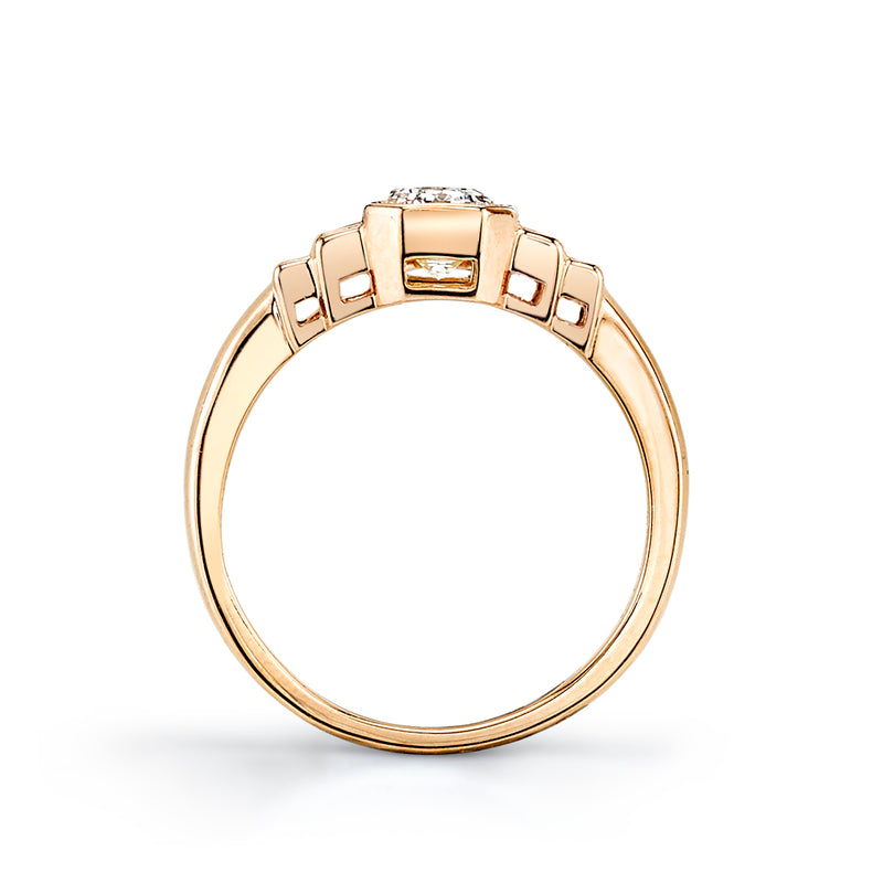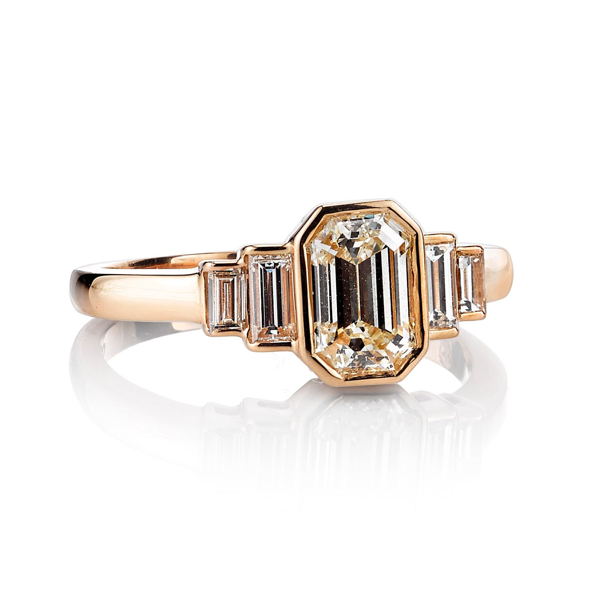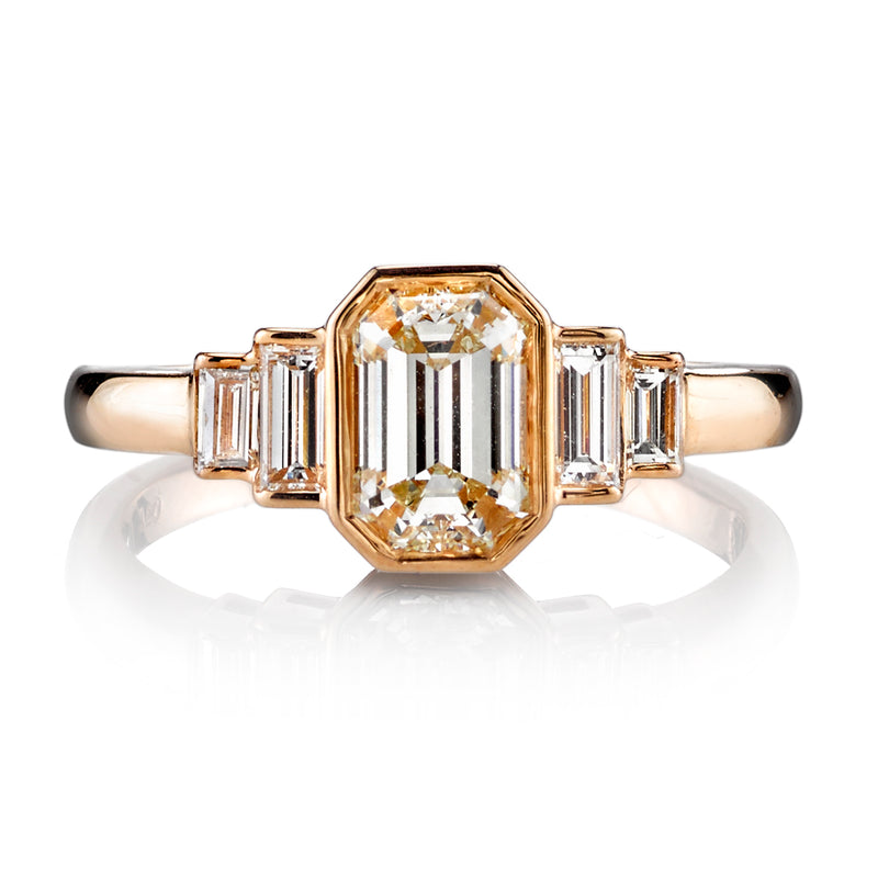 1.02ct L/VS2 GIA certified emerald cut diamond with 0.32ctw baguette cut accent diamonds bezel set in a handcrafted 18K rose gold mounting.