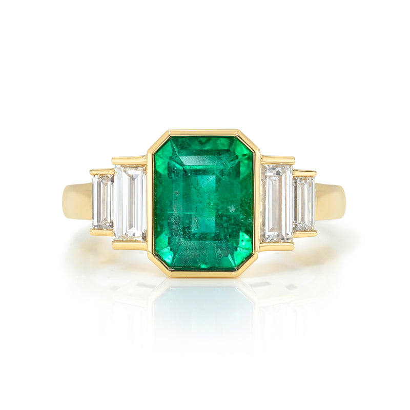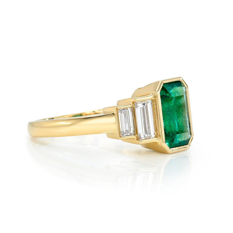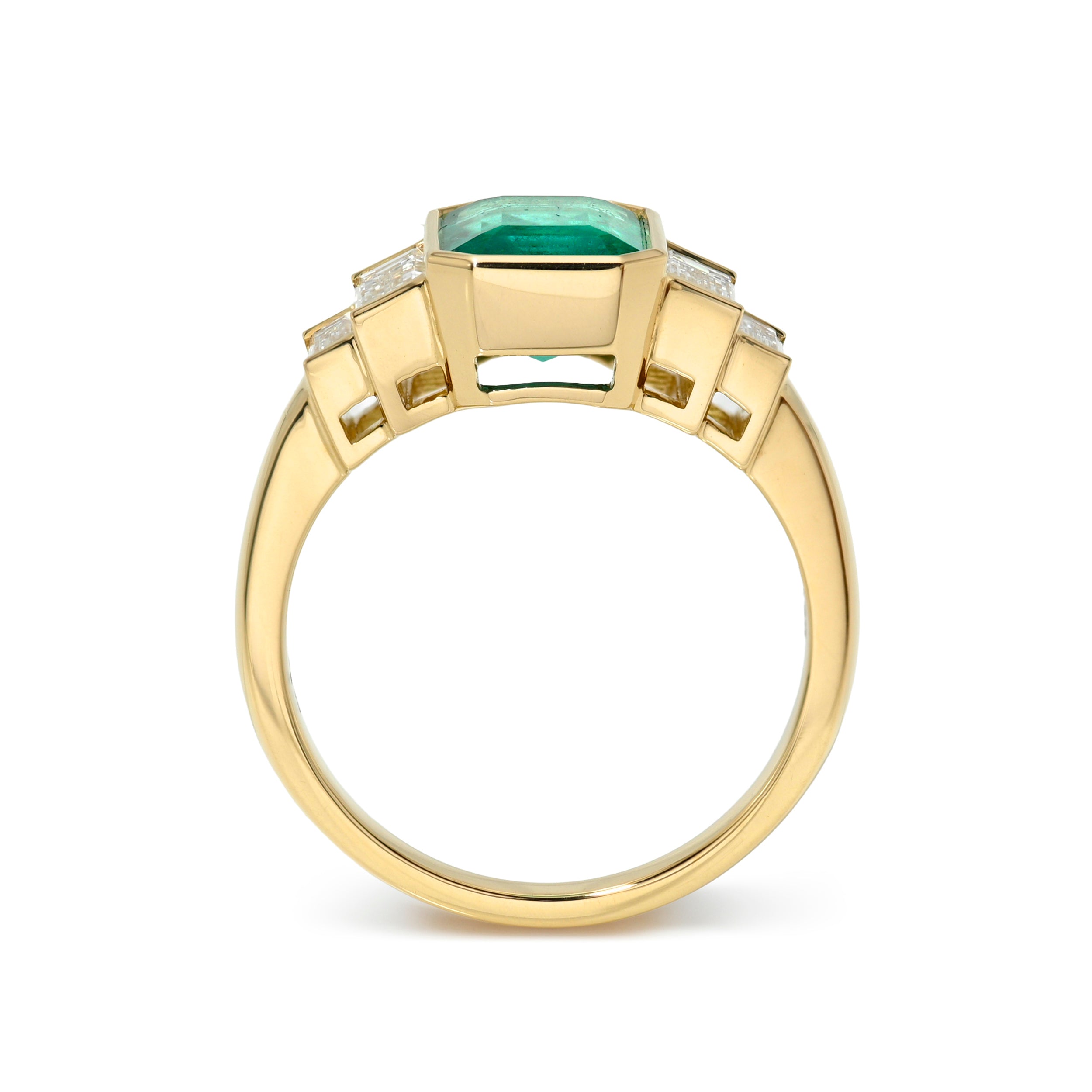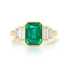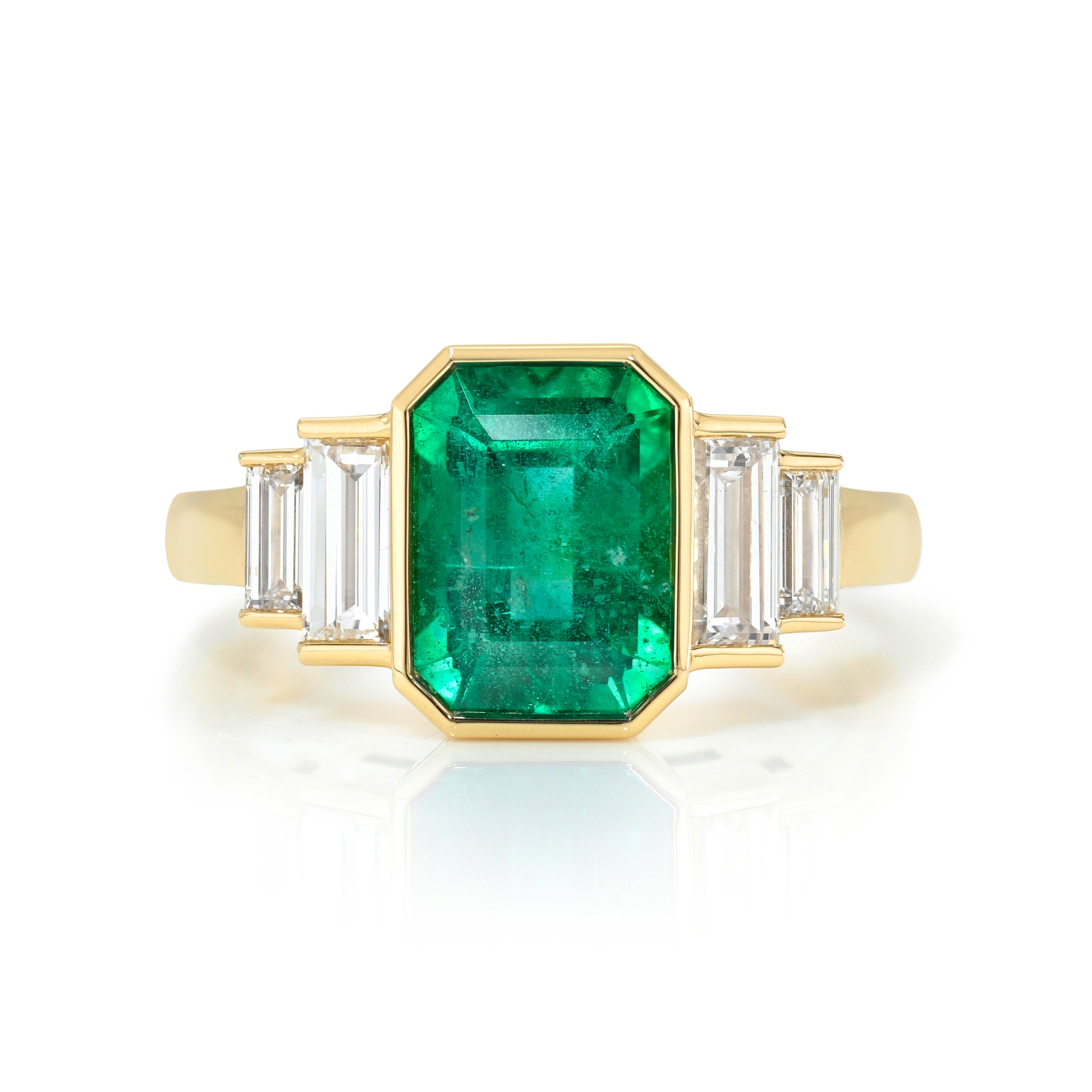 2.10ct GIA certified Zambian emerald cut green emerald with 0.74ctw baguette cut accent diamonds bezel set in a handcrafted 18K yellow gold mounting.