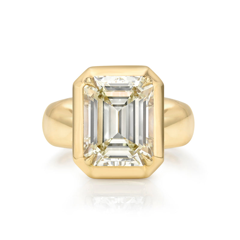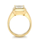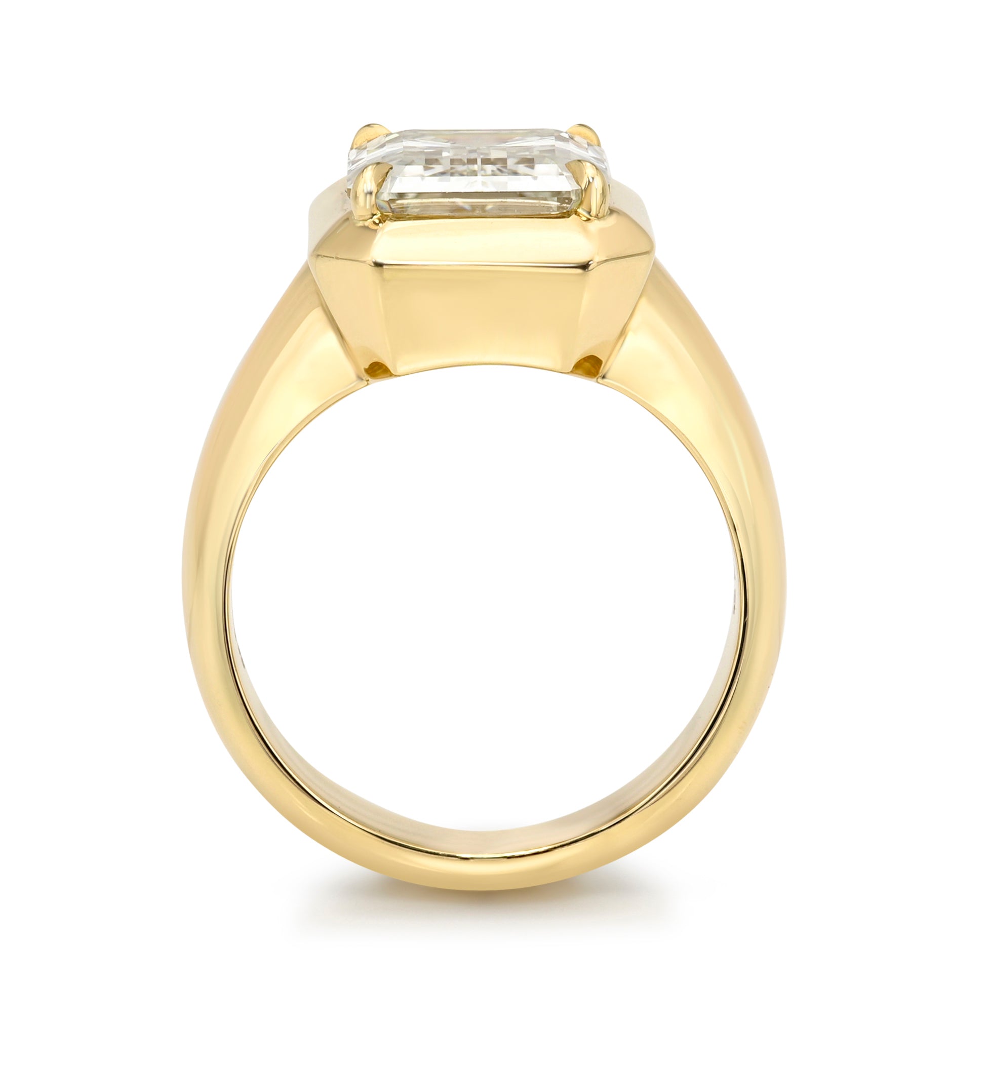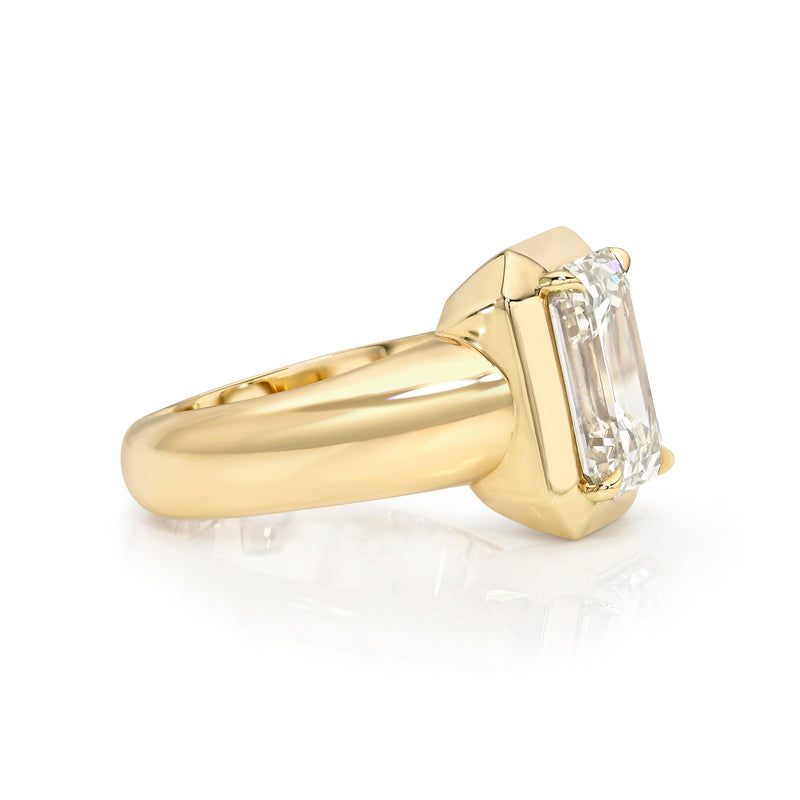 4.30ct M/SI1 GIA certified emerald cut diamond prong set in a handcrafted 18K yellow gold mounting.