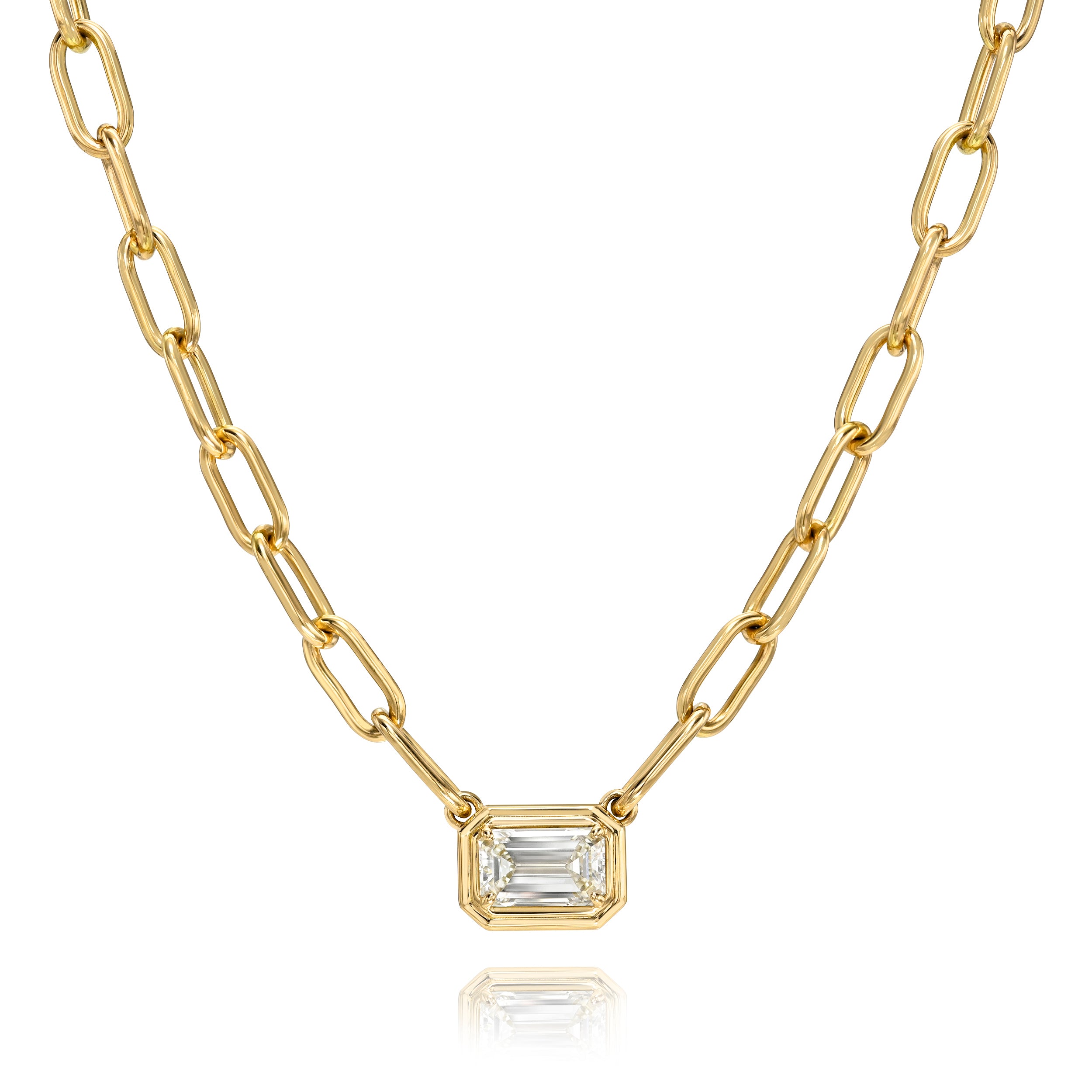 1.53ct L/IF GIA certified emerald cut diamond bezel set on our handcrafted 18K yellow gold Bond Luxe chain.