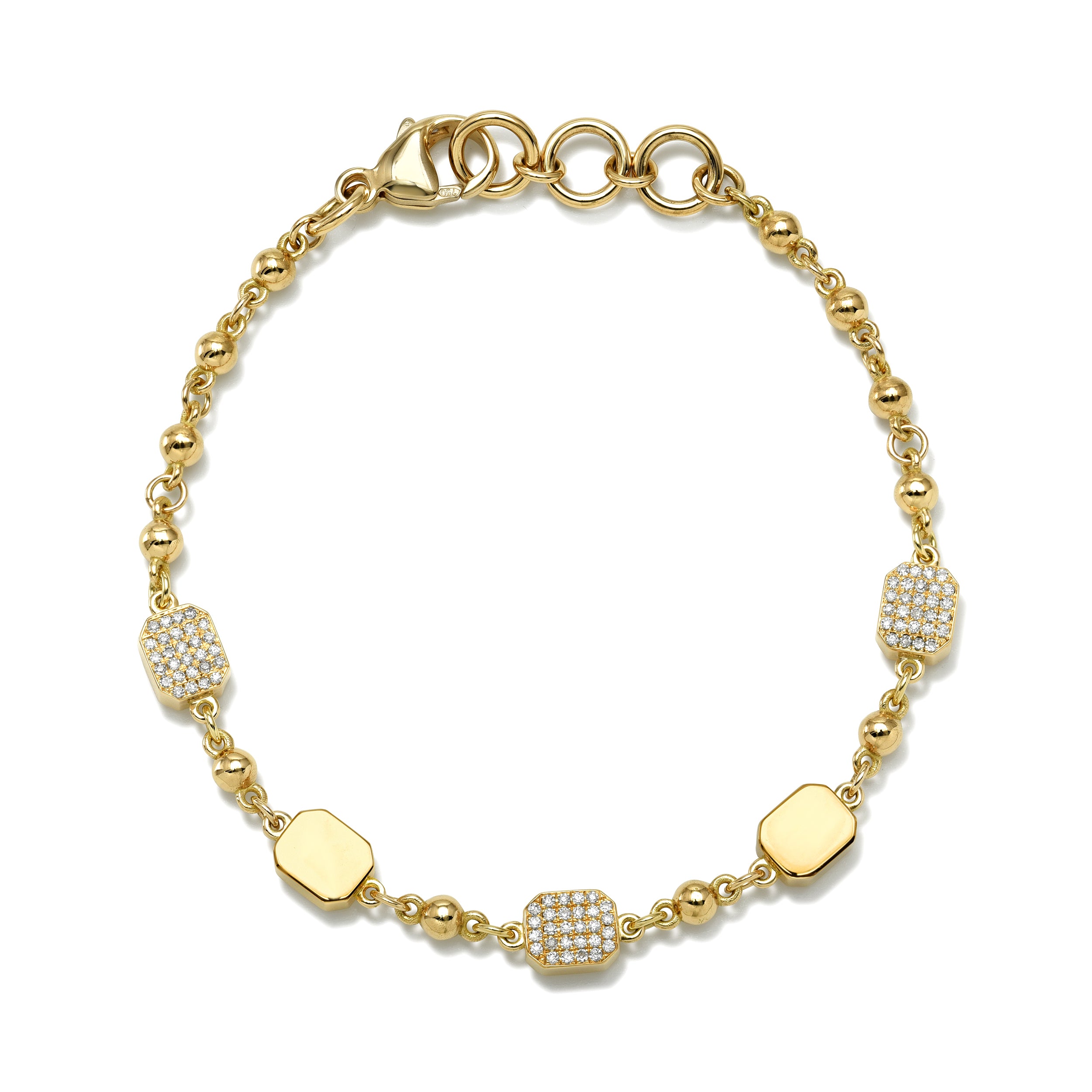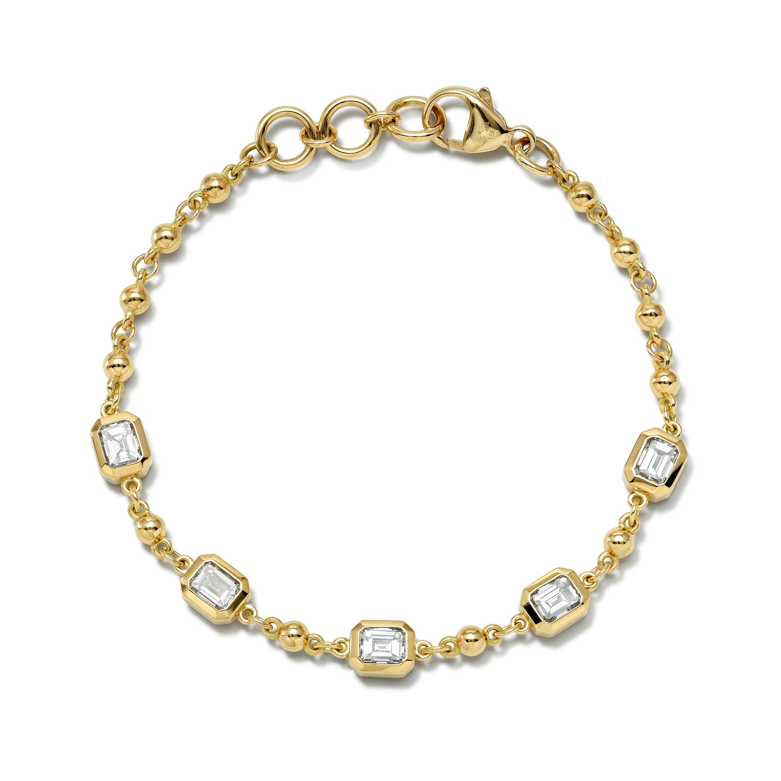 Approximately 2.50ctw J-K/VS bezel set emerald cut diamonds featuring approximately 0.30ctw pavé set old European cut accent diamonds on our handcrafted 18K yellow gold Rosary bracelet
