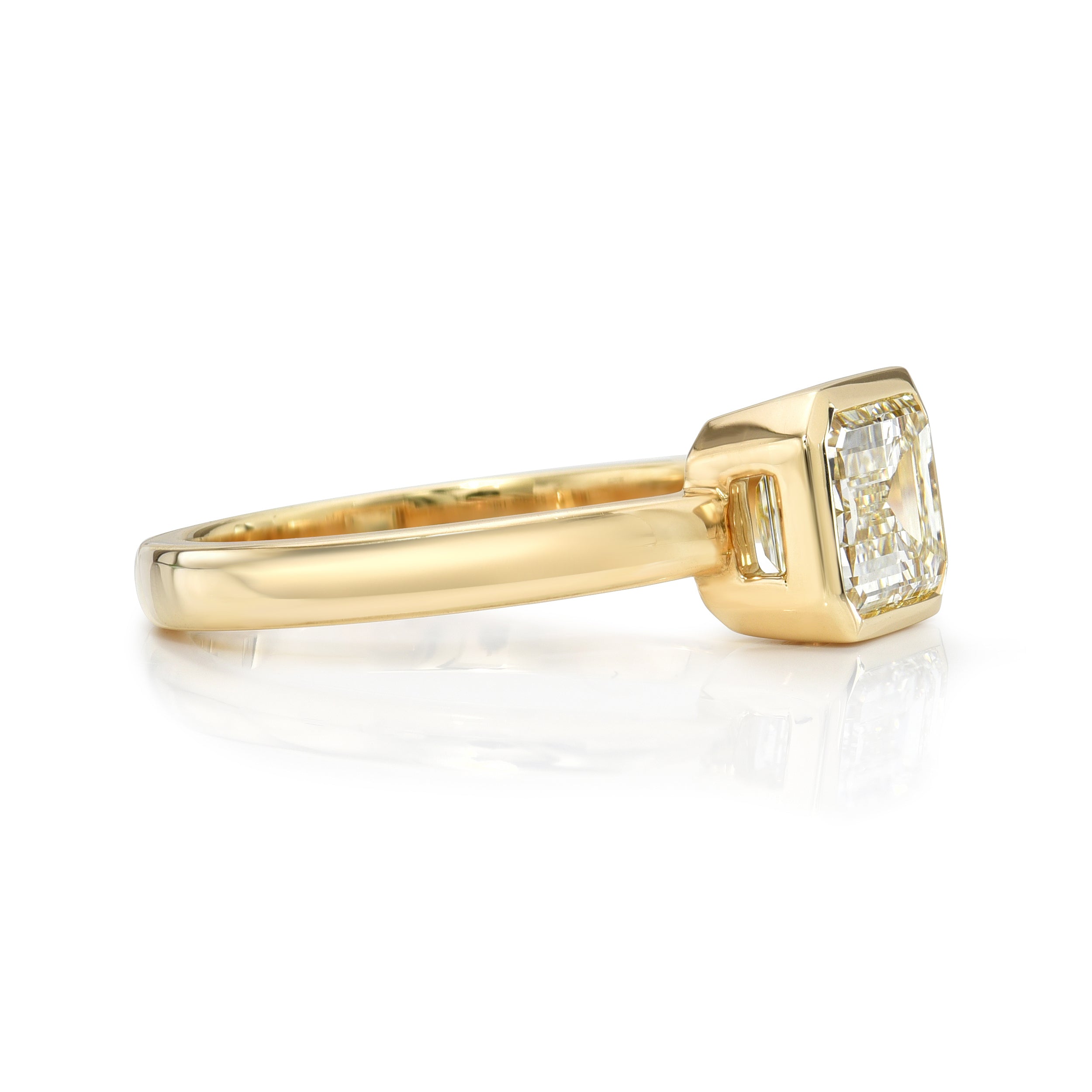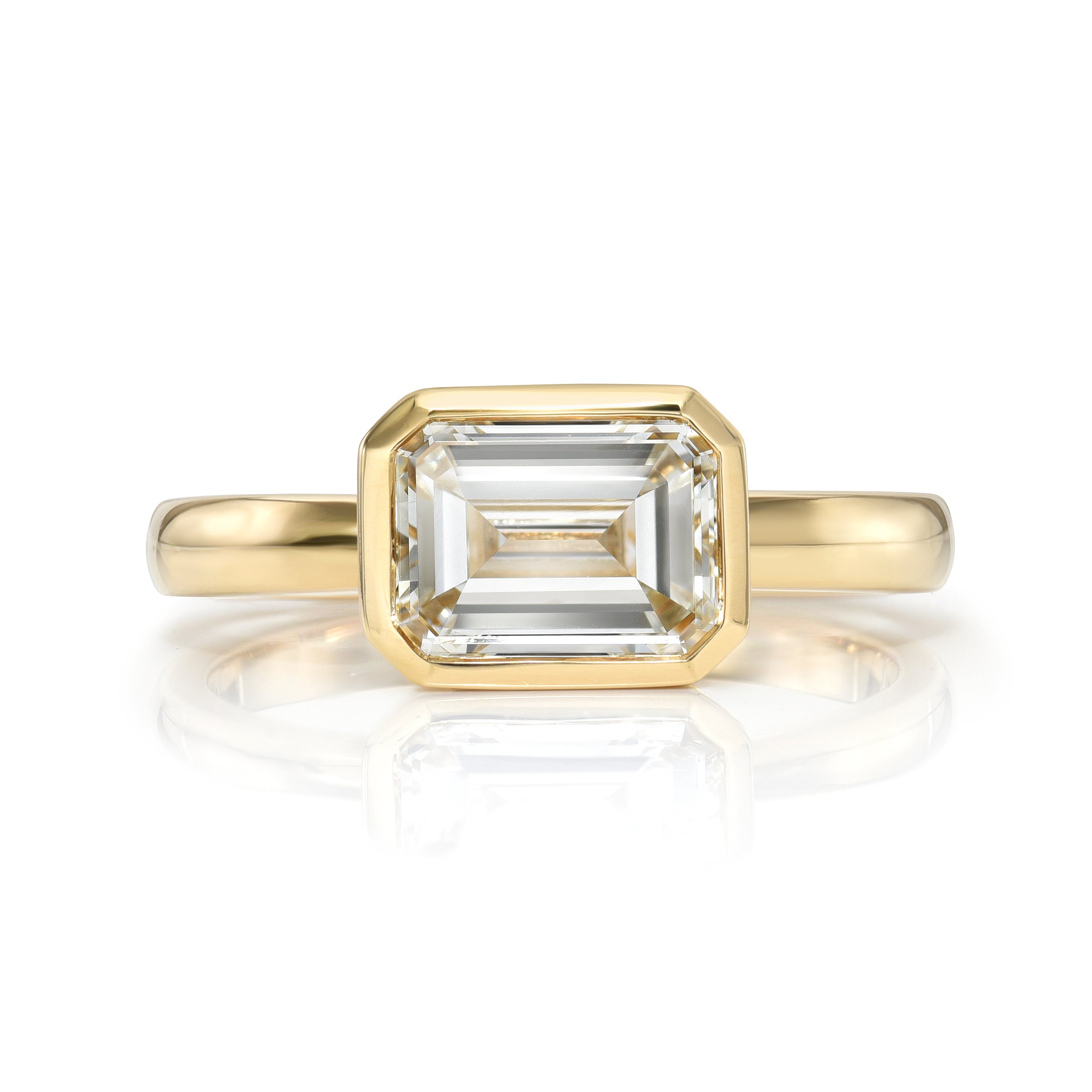 1.58ct J/VVS2 GIA certified emerald cut diamond bezel set in a handcrafted 18K yellow gold mounting.