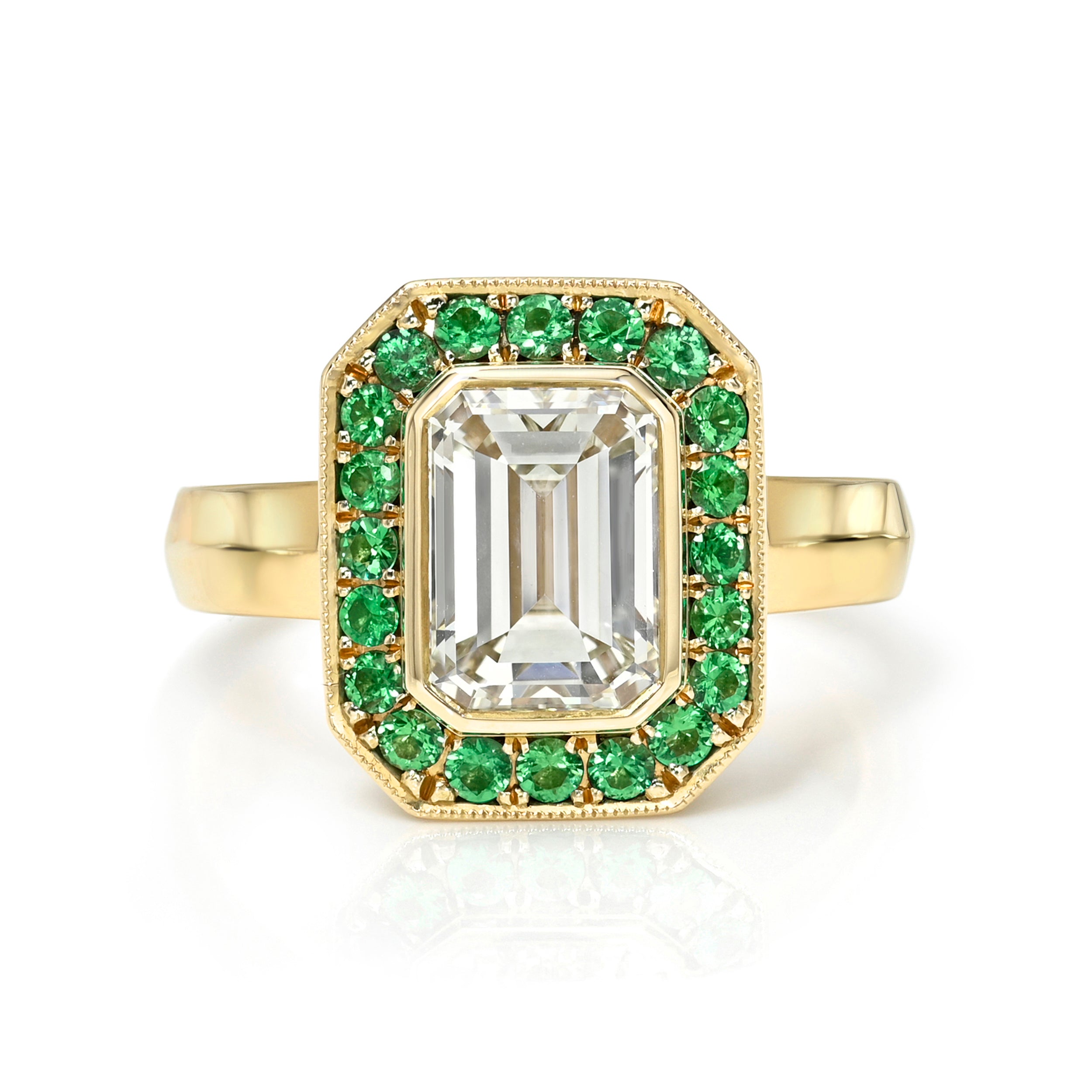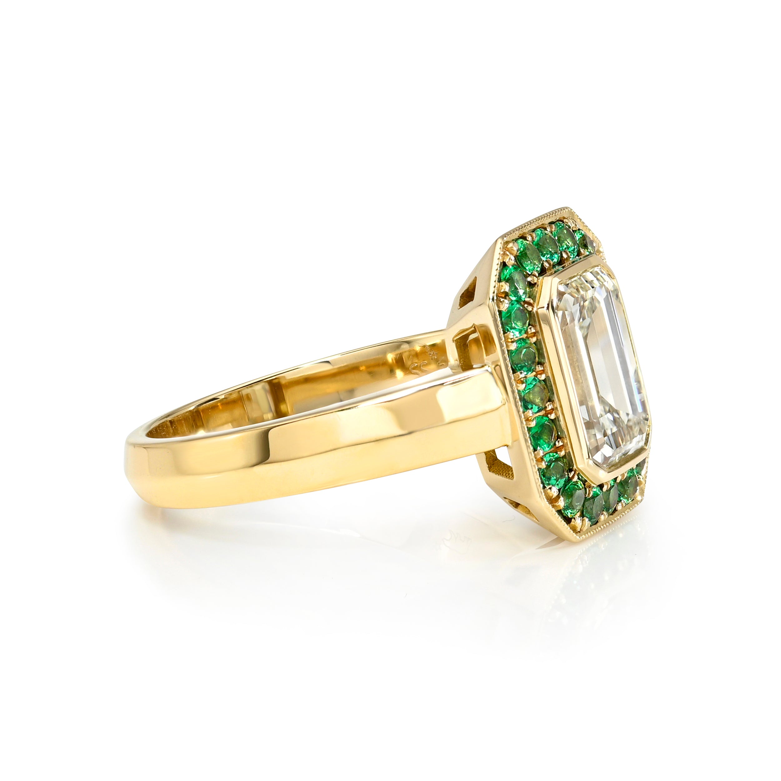 2.02ct M/VVS1 GIA certified bezel set emerald cut diamond surrounded by 0.30ctw pavé set round cut green emeralds in a handcrafted 18K yellow gold mounting.