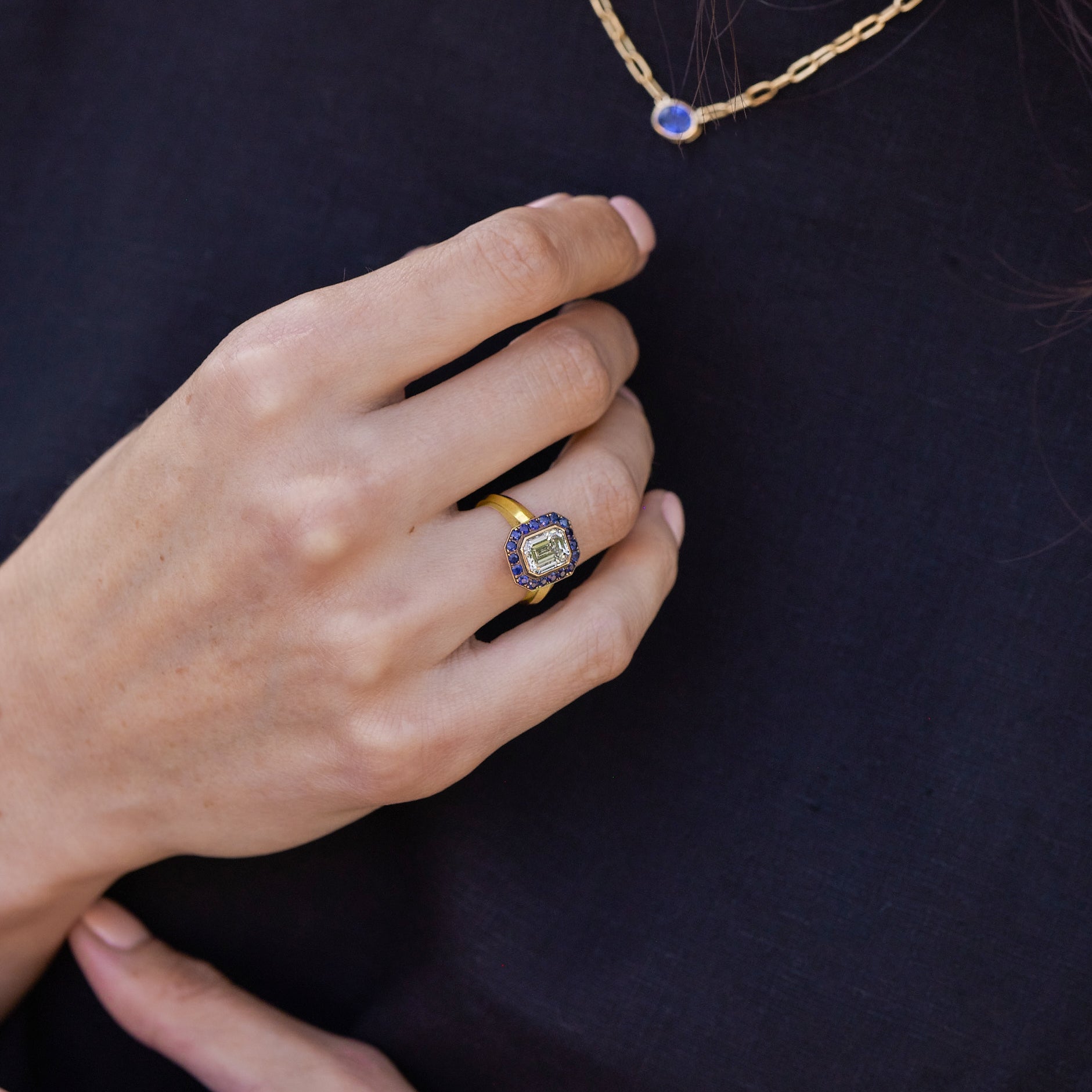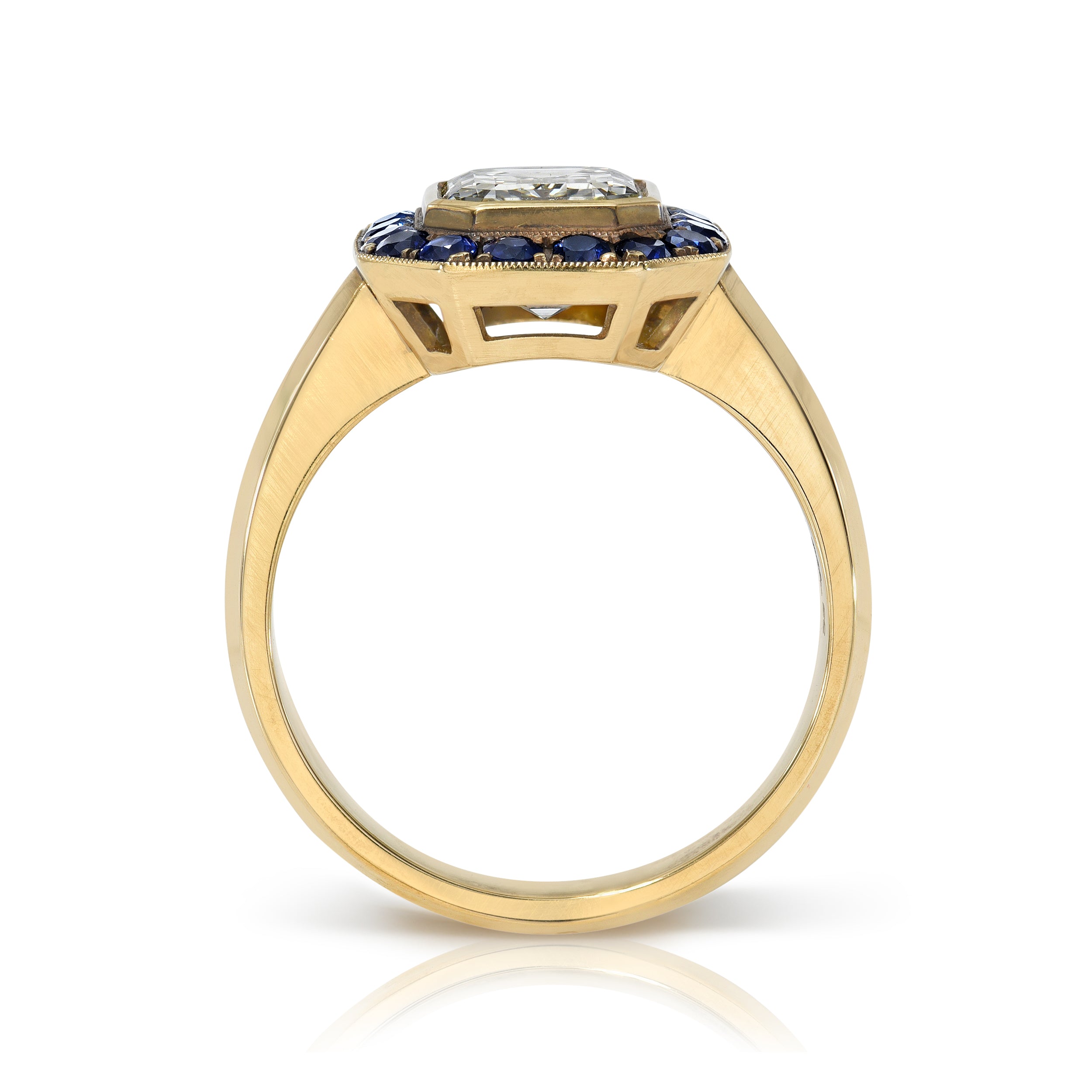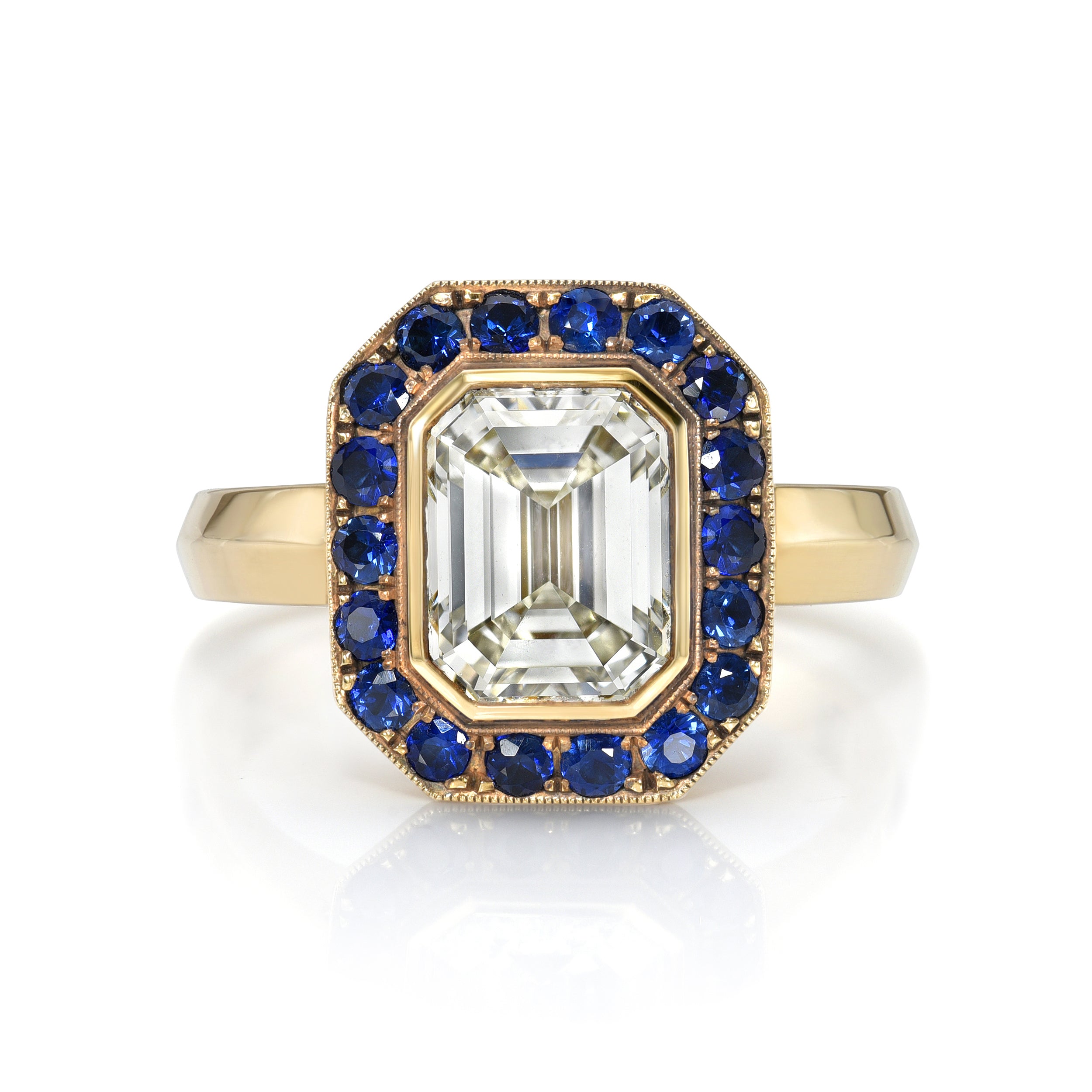 2.00ct M/VS1 GIA certified bezel set emerald cut diamond surrounded by 0.55ctw pavé set round cut blue sapphires in a handcrafted, lightly oxidized 18K yellow gold mounting.