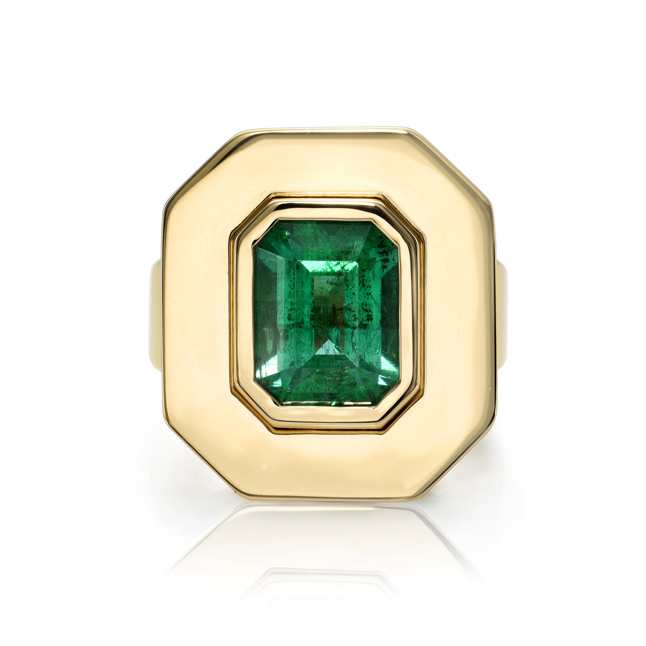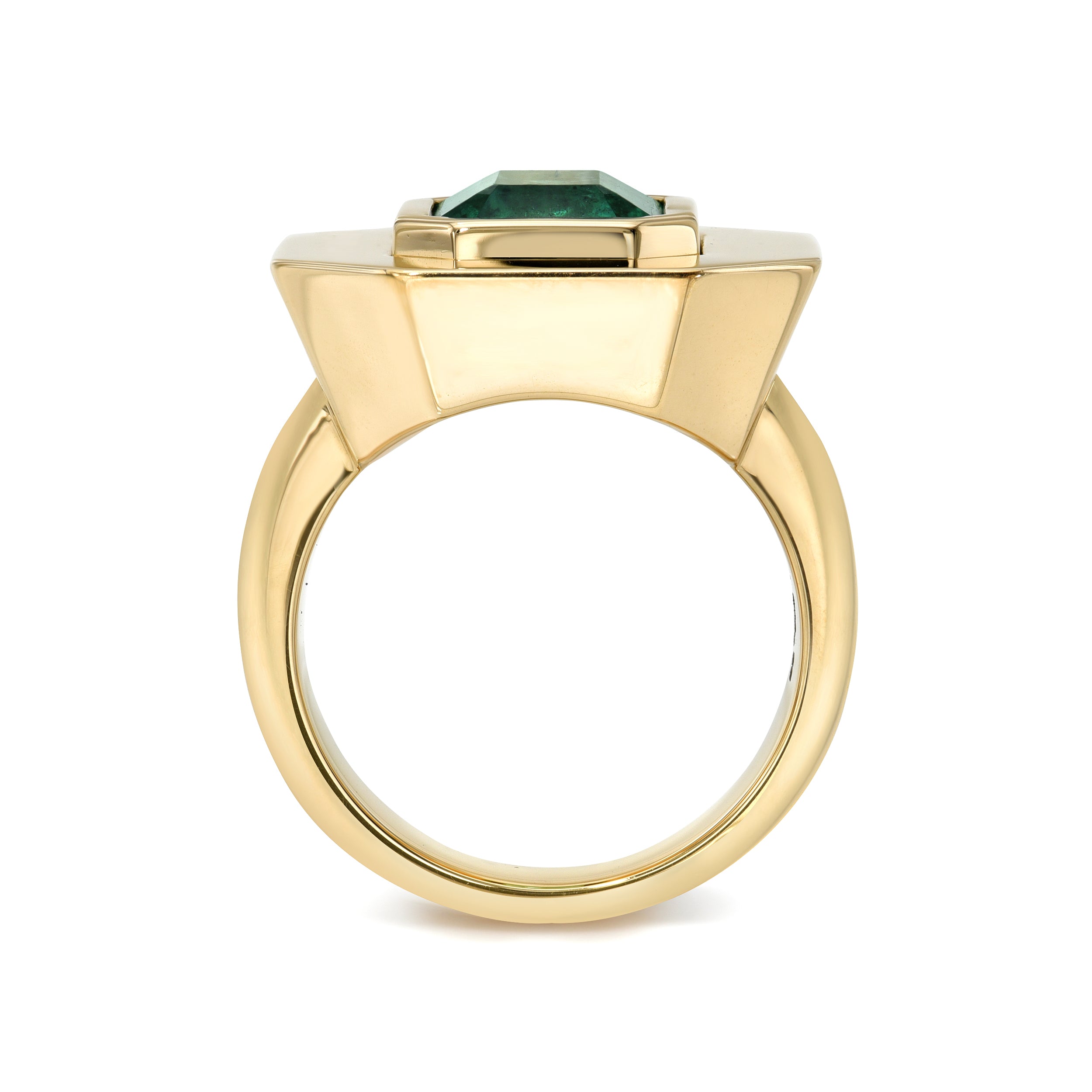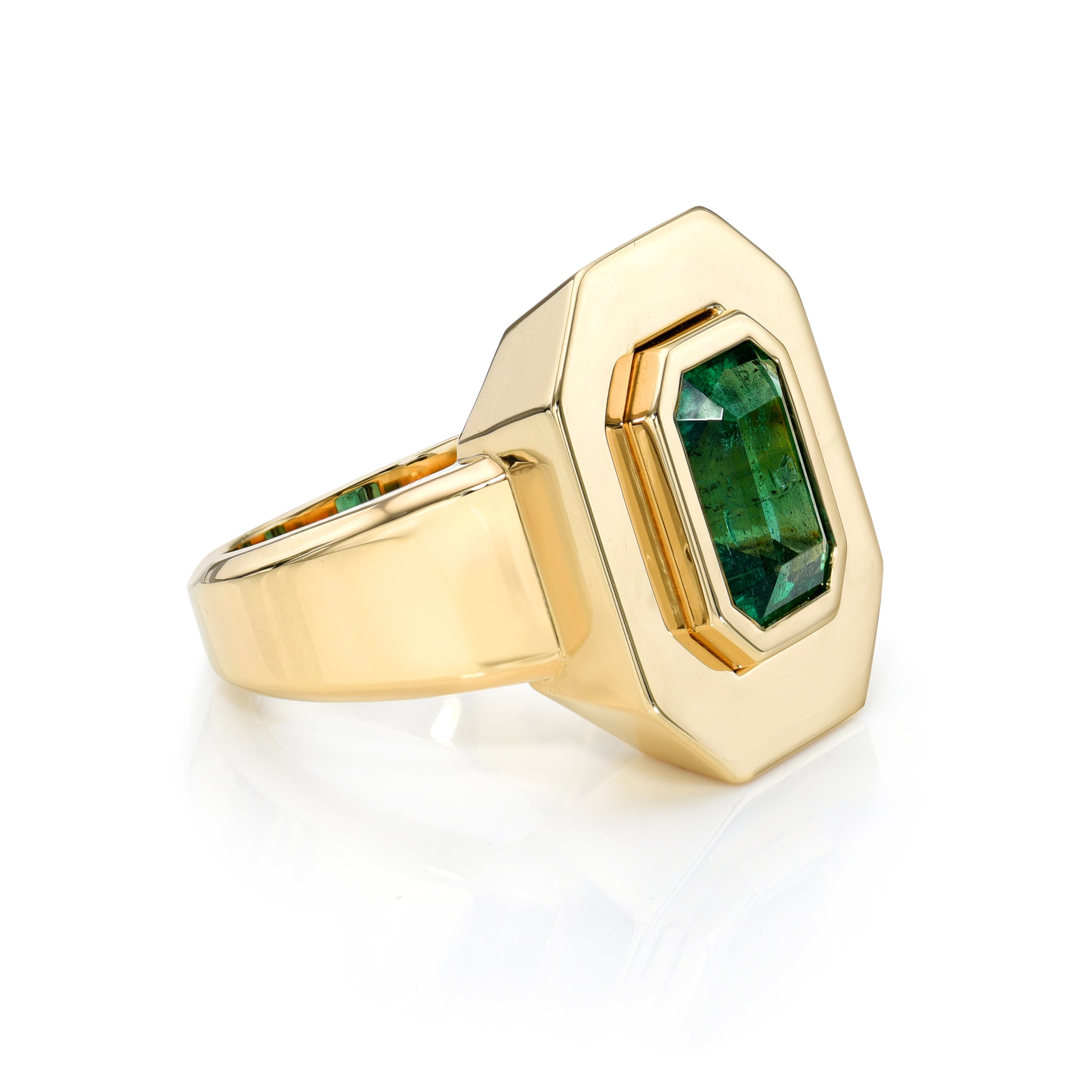 3.14ct GIA certified emerald cut green emerald bezel set in a handcrafted 18K yellow gold mounting.
