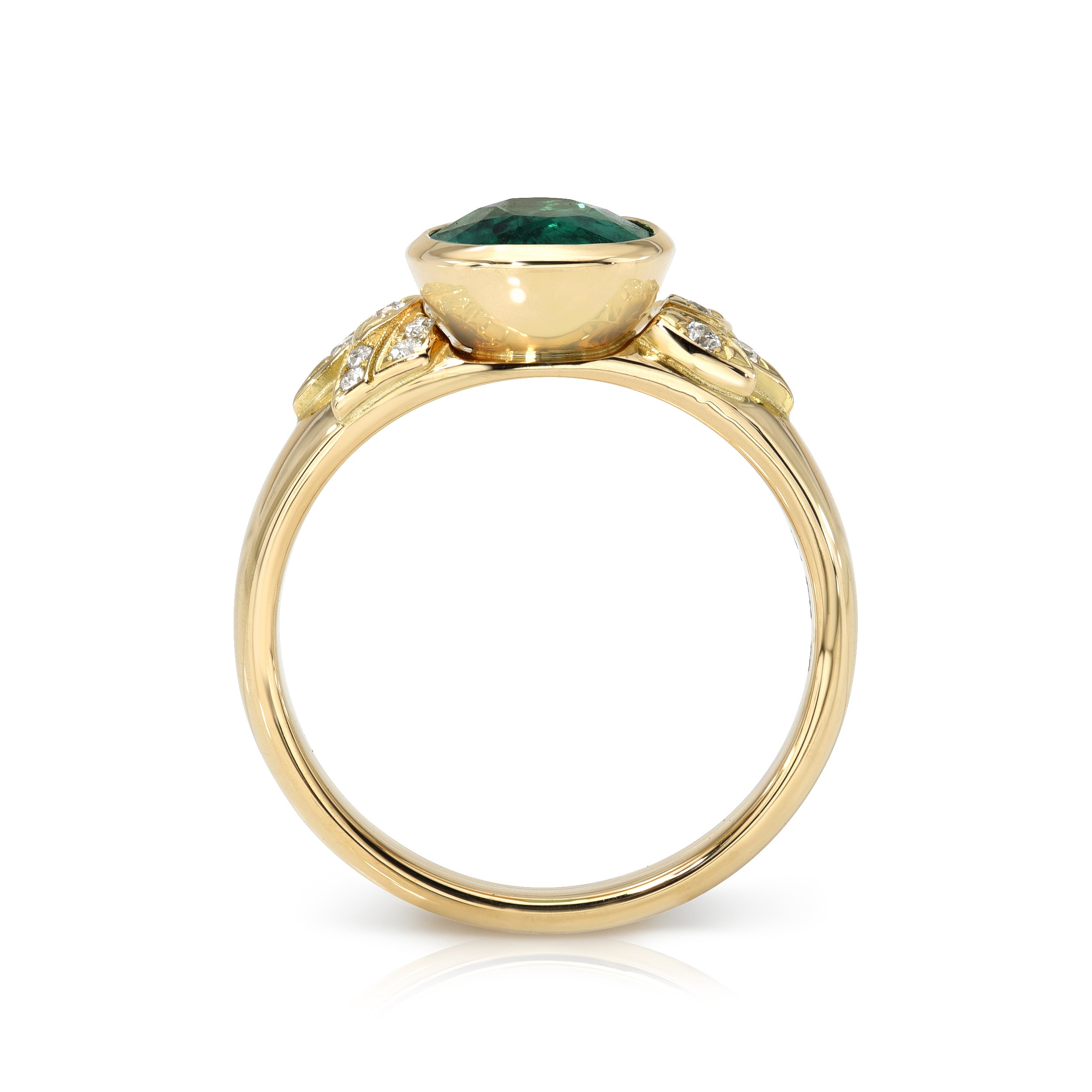1.68ct GIA certified oval cut green emerald with 0.17ctw old European cut accent diamonds bezel set in a handcrafted 18K yellow gold mounting with a tapered shank.