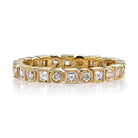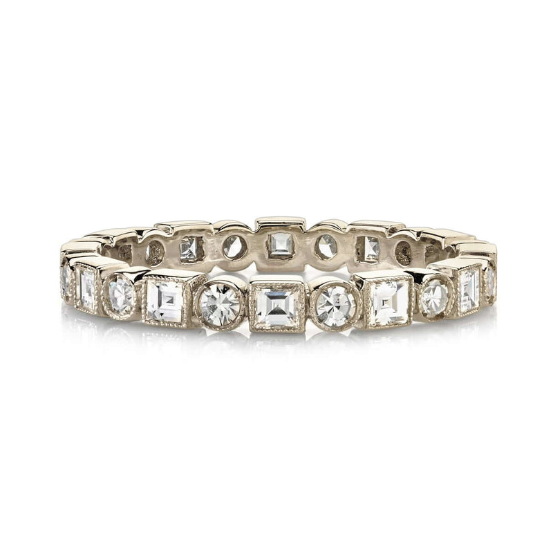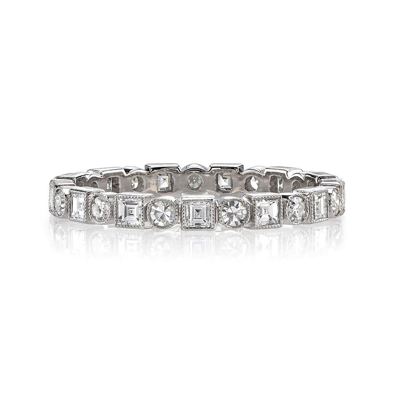 Approximately 0.95ctw G-H/VS carré cut and old European cut diamonds bezel set in a handcrafted eternity band.