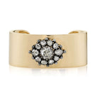 2.50ct rose cut diamond surrounded by a halo of 2.25ctw rose cut accent diamonds in a handcrafted oxidized sterling silver and 18K yellow gold cuff.
