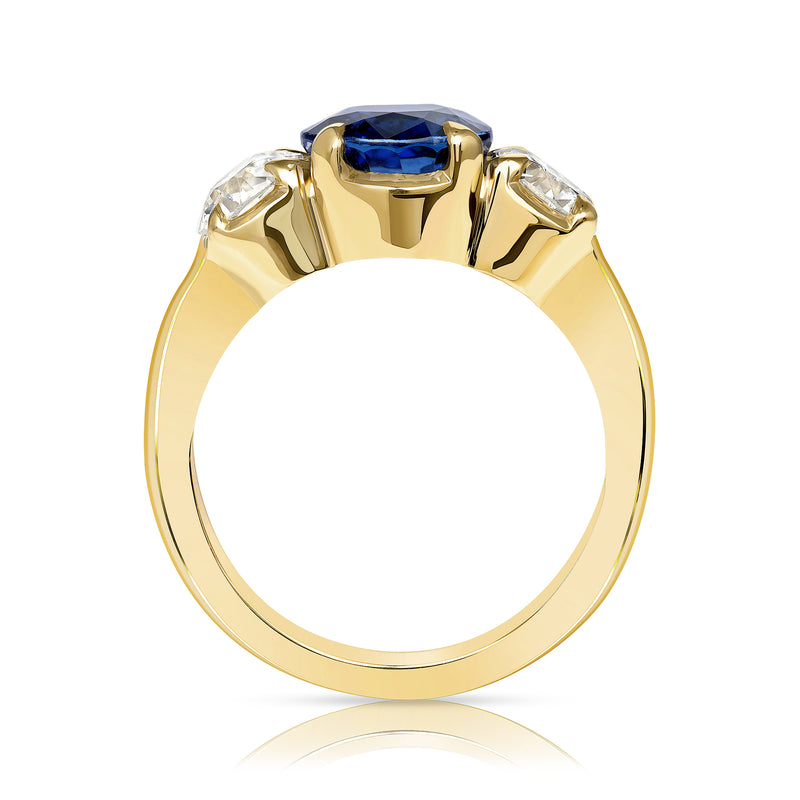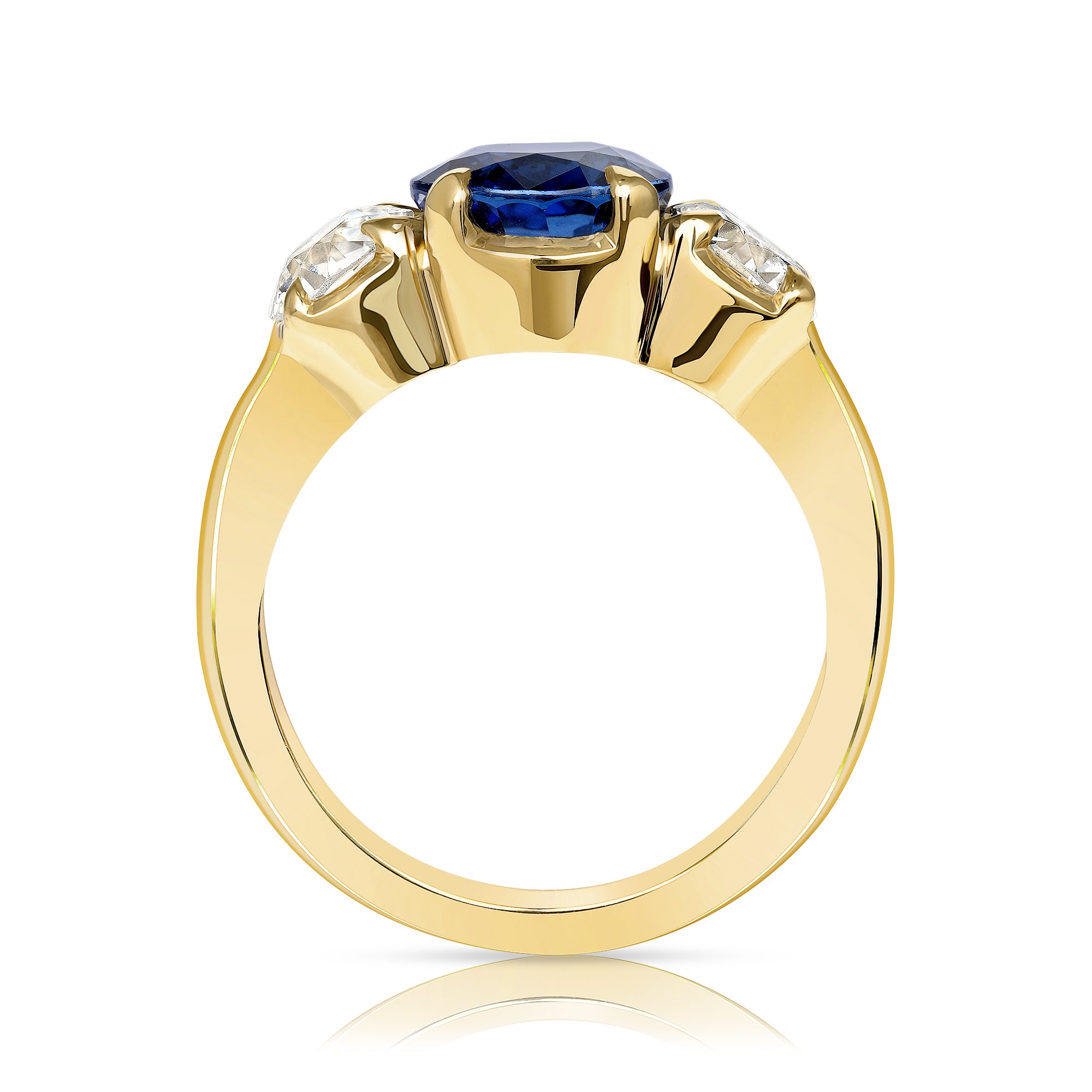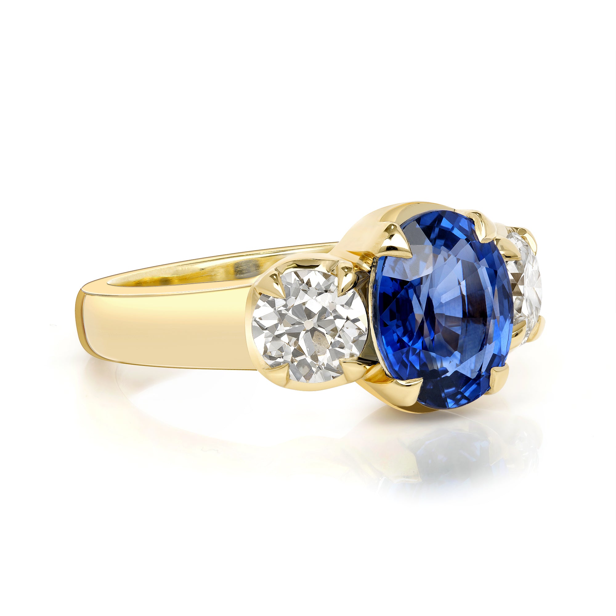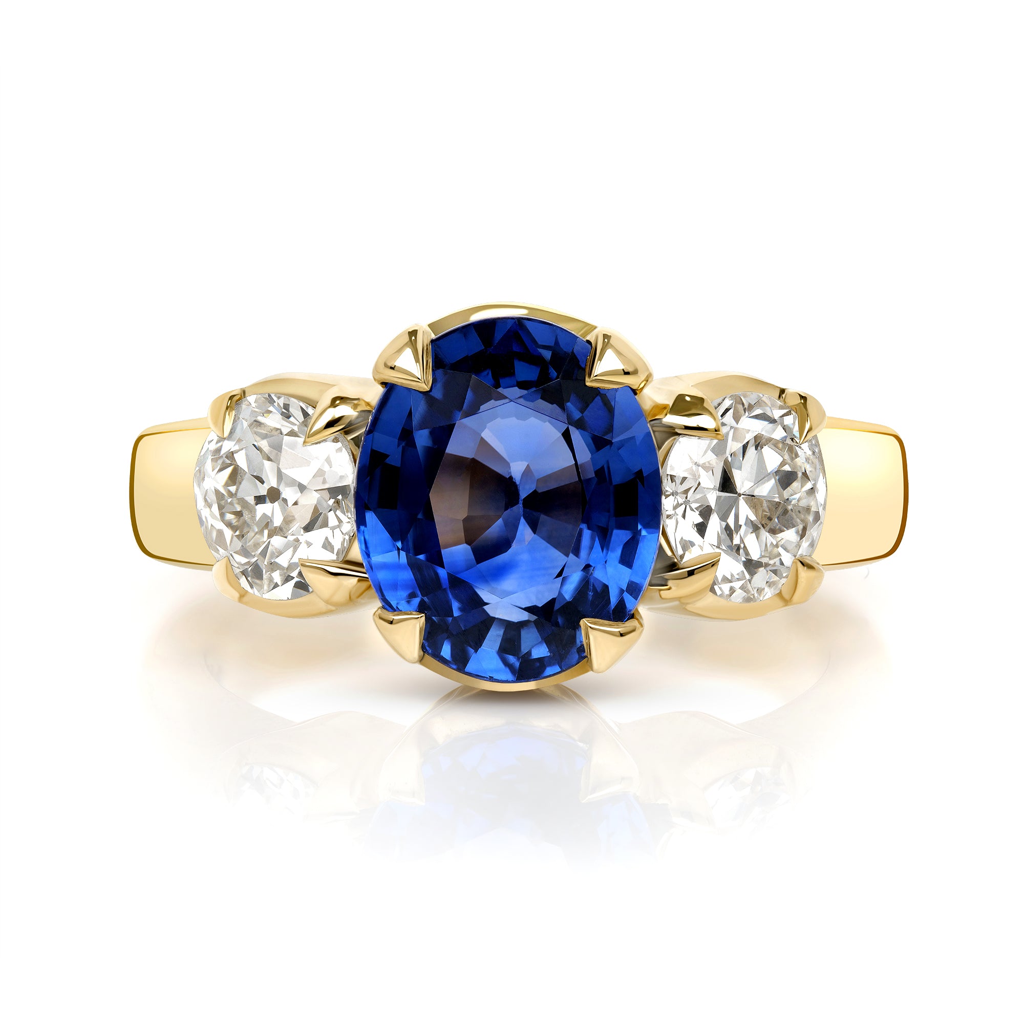 3.10ct GIA certified oval cut blue sapphire with 1.12ctw I-J/VS2-SI1 GIA certified old European cut accent diamonds prong set in a handcrafted 18K yellow gold mounting.