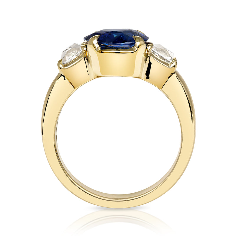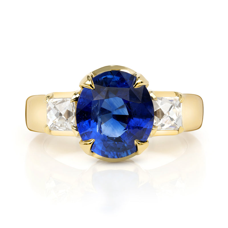3.24ct GIA certified Sri Lankan oval cut blue sapphire with 0.88ctw French cut accent diamonds prong set in a handcrafted 18K yellow gold mounting.