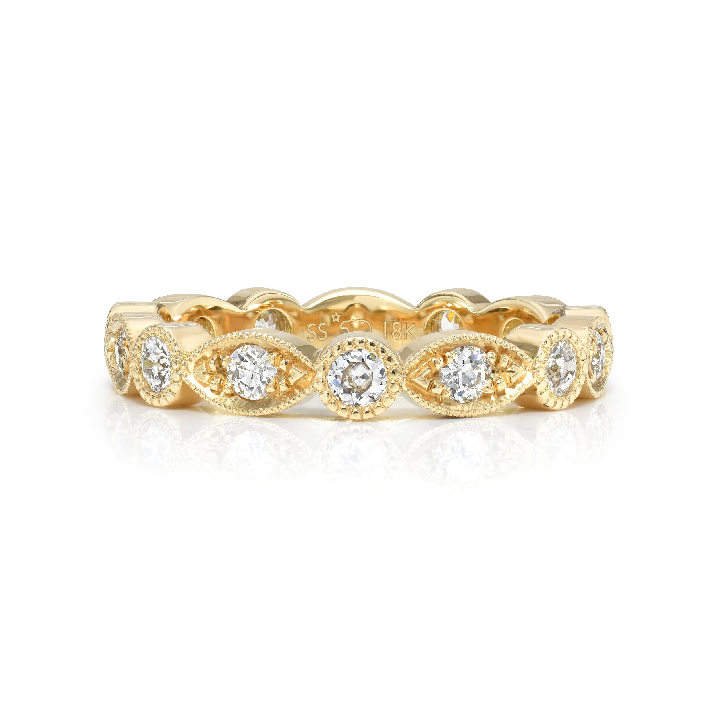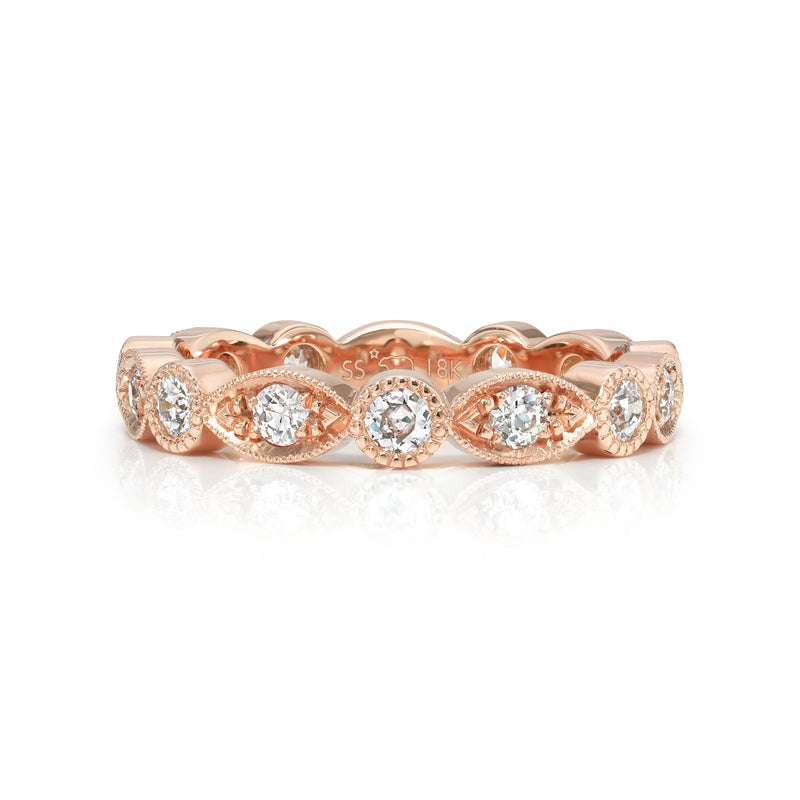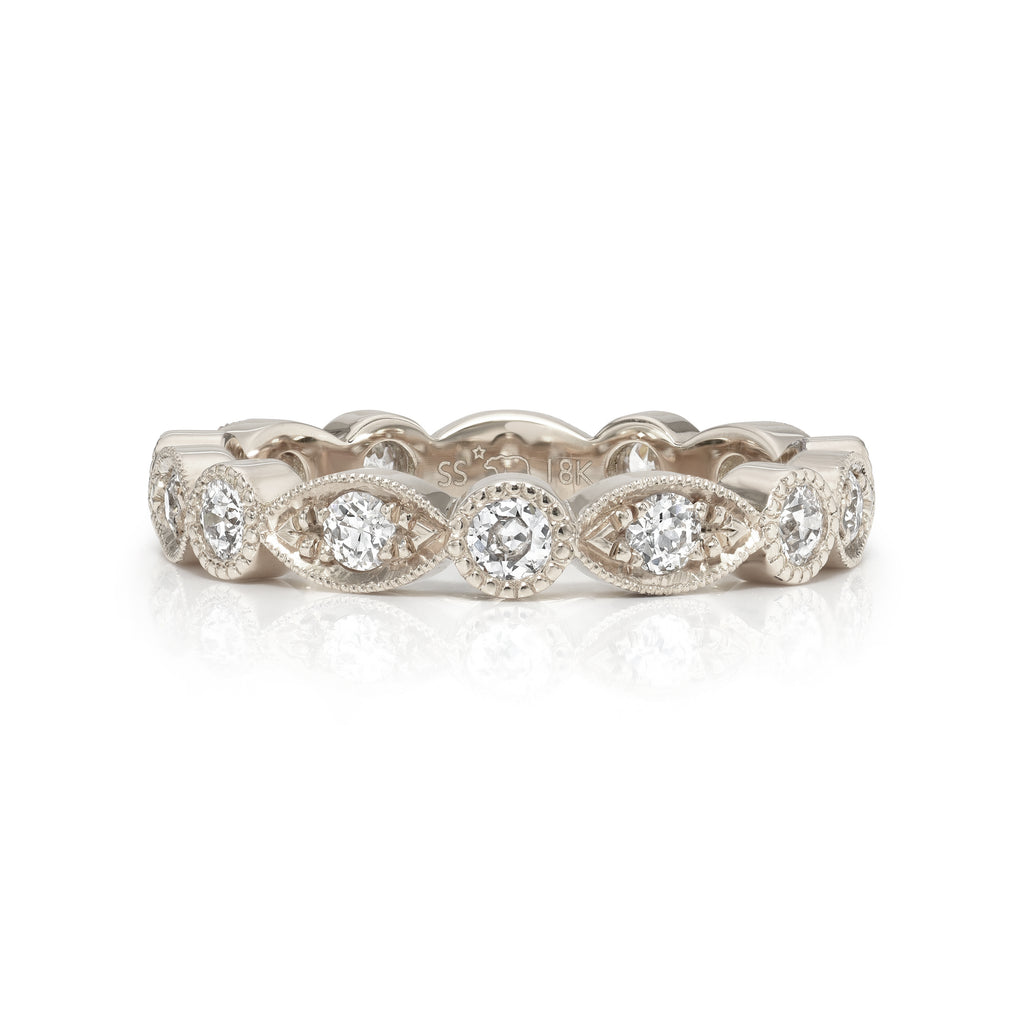The 19th century brought about techniques that advanced the diamond cutting industry and thus, the old European cut diamond was born. With 58 facets, a small table, high crown angle, circular shape, and open culet, the old European cut diamond became the precursor to the modern round diamonds that we see today. Our vintage old European cut diamonds, cut primarily in the 1920s and 1930s, are used in many of our designs, from larger center stones to small, pave set diamonds.