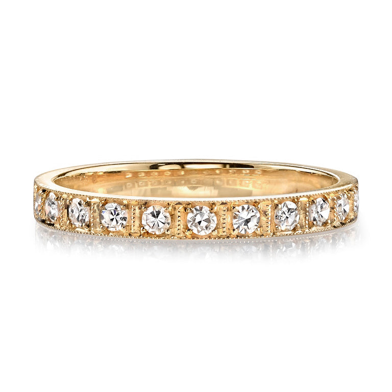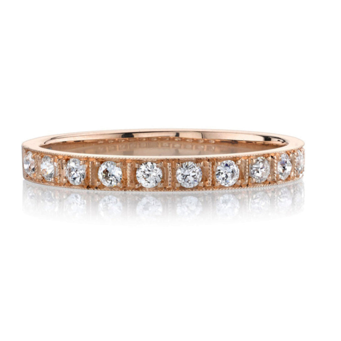 The 19th century brought about techniques that advanced the diamond cutting industry and thus, the old European cut diamond was born. With 58 facets, a small table, high crown angle, circular shape, and open culet, the old European cut diamond became the precursor to the modern round diamonds that we see today. Our vintage old European cut diamonds, cut primarily in the 1920s and 1930s, are used in many of our designs, from larger center stones to small, pave set diamonds.