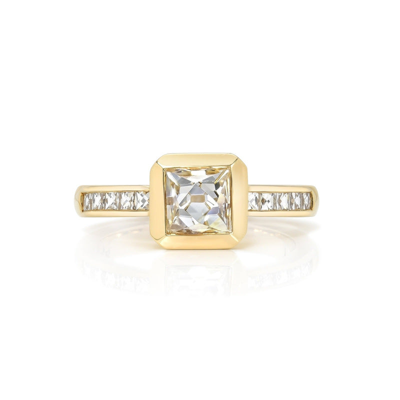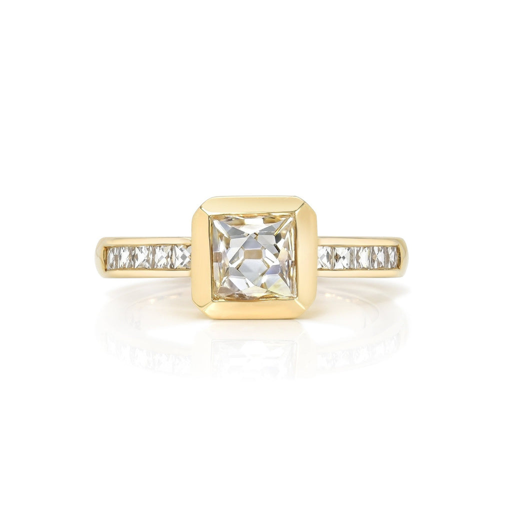 1.24ct G/I1 GIA certified French cut diamond with 0.25ctw French cut accent diamonds set in a handcrafted 18K yellow gold mounting.