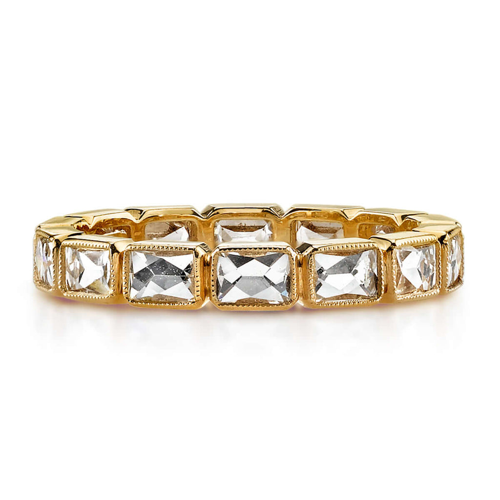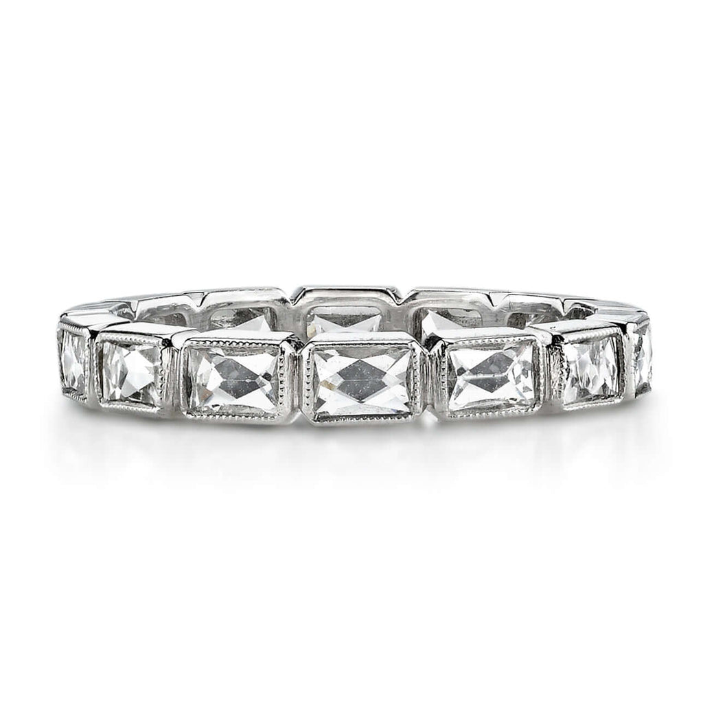 With their geometric lines, French cut diamonds reached their height of popularity in the Art Deco period. Square or rectangular in shape, French cuts feature a mix of step and triangular faceting, resulting in mirror-like flashes of brilliance. Our French cut diamonds are painstakingly hand-cut to order so that they fit seamlessly into our French cut diamond bands, or any of our other bespoke jewelry designs.