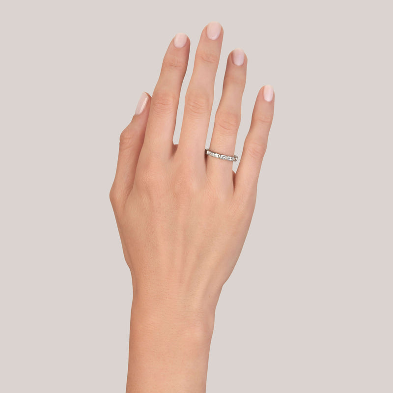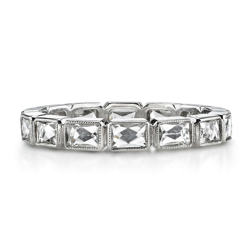 Approximately 1.30-1.60ctw G-H/VS French cut diamonds bezel set in a handcrafted eternity band.