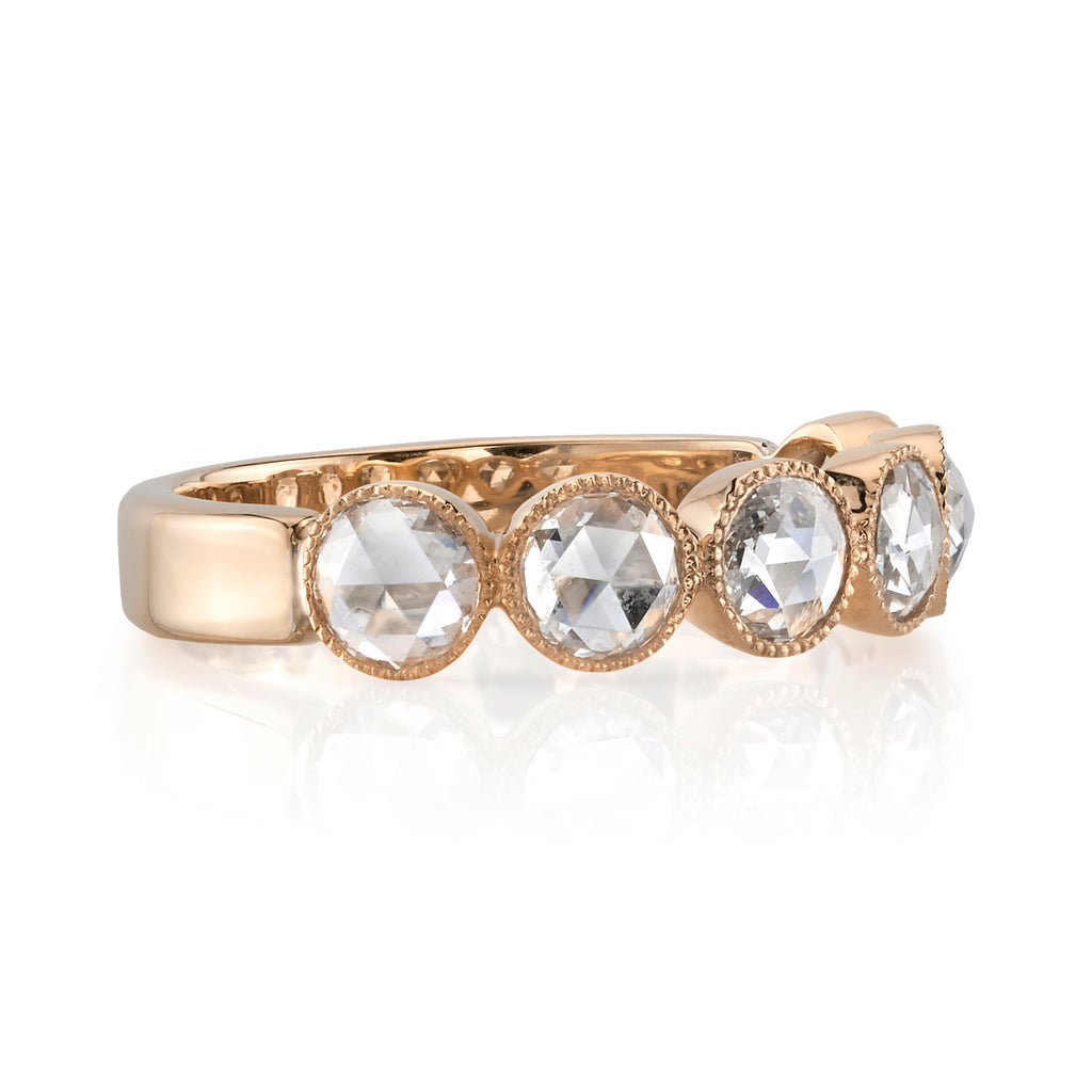 Approximately 0.90ctw rose cut diamonds bezel set in a handcrafted half-eternity band.