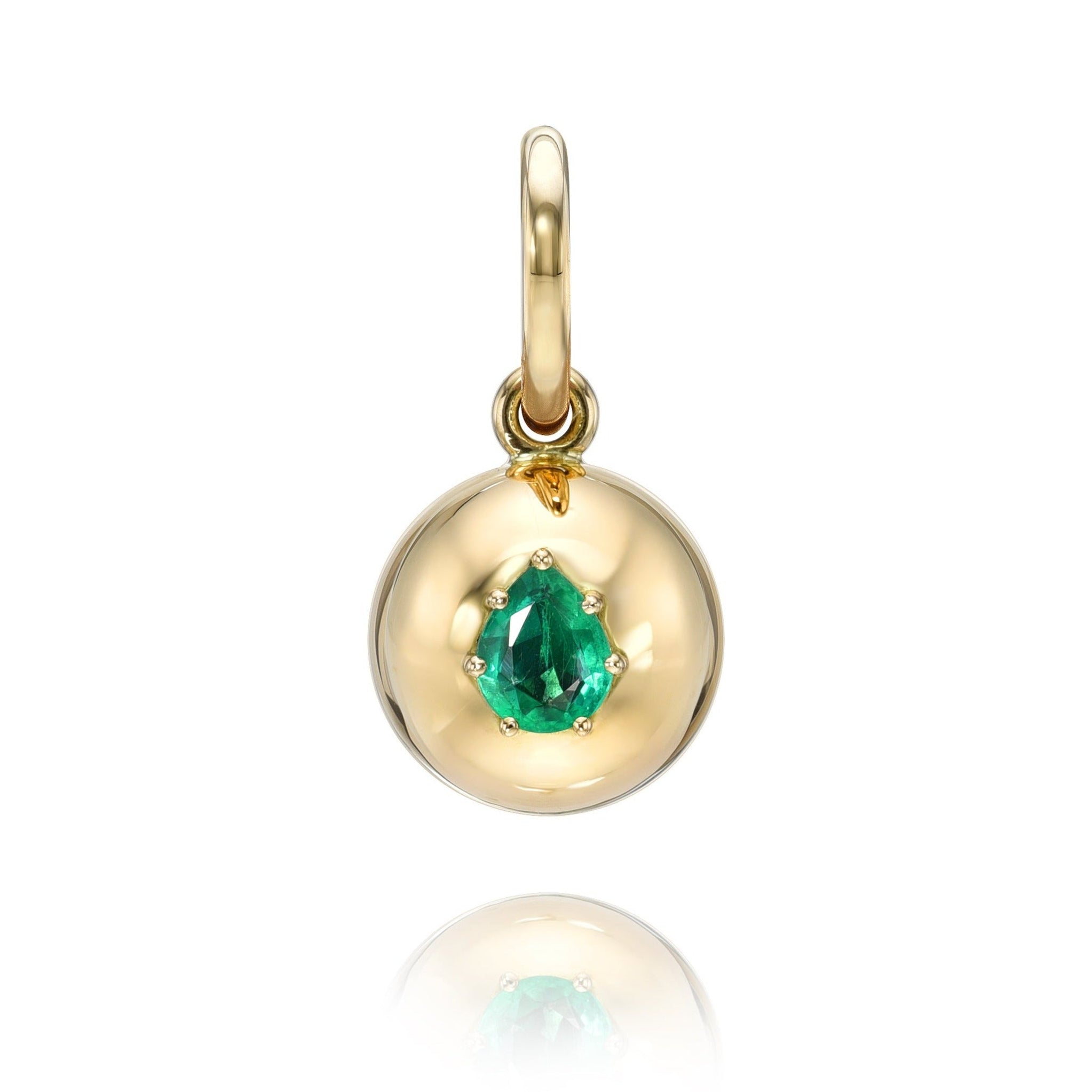 Approximately 0.30-0.40ct pear shape green emerald prong set in a handcrafted 18K yellow gold sphere shaped pendant.