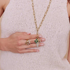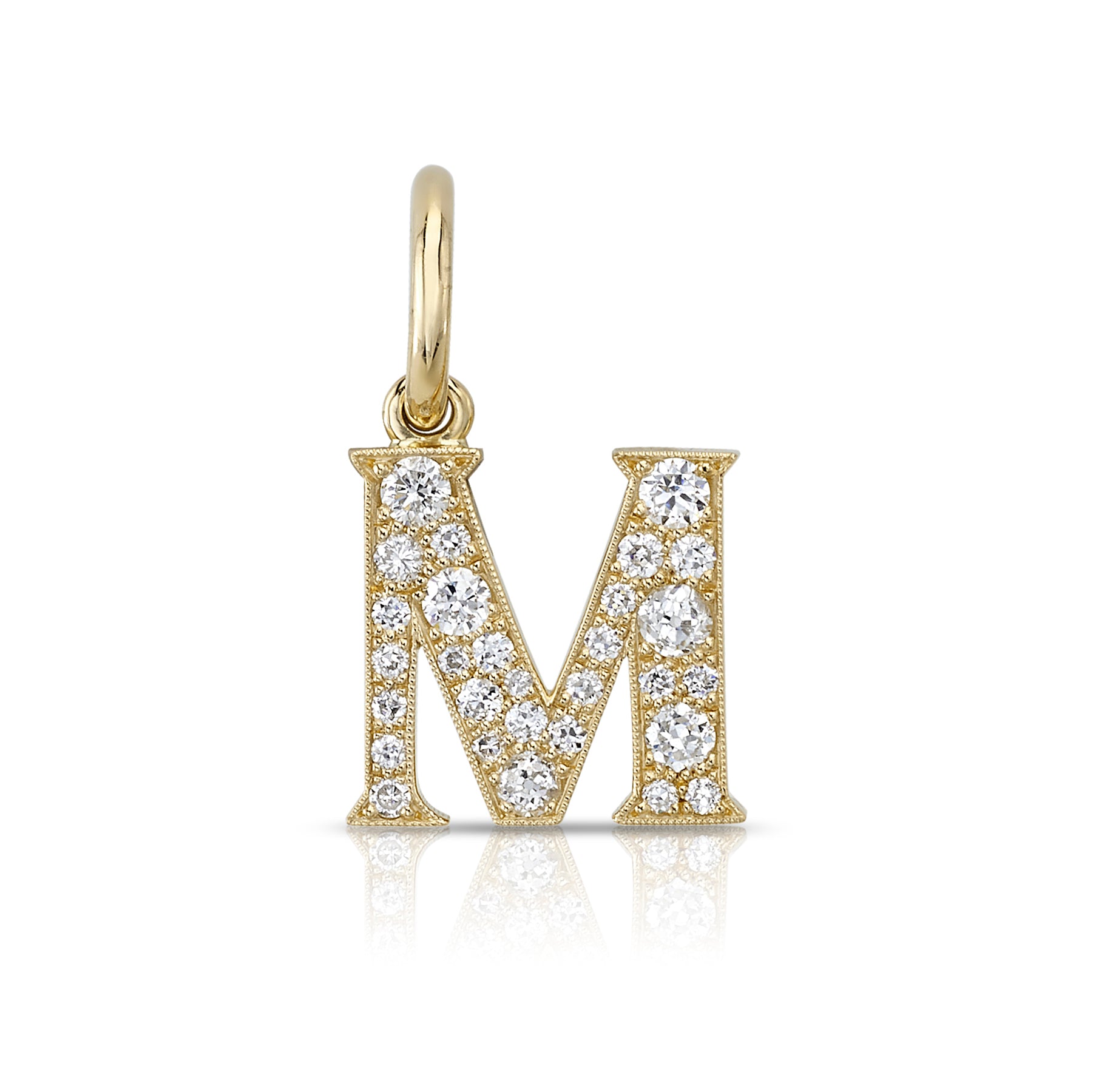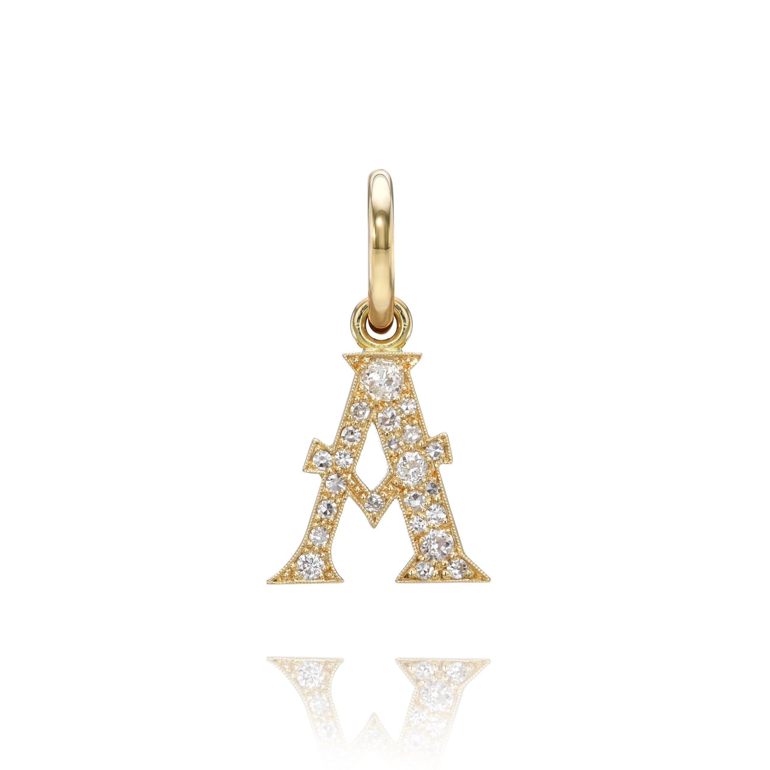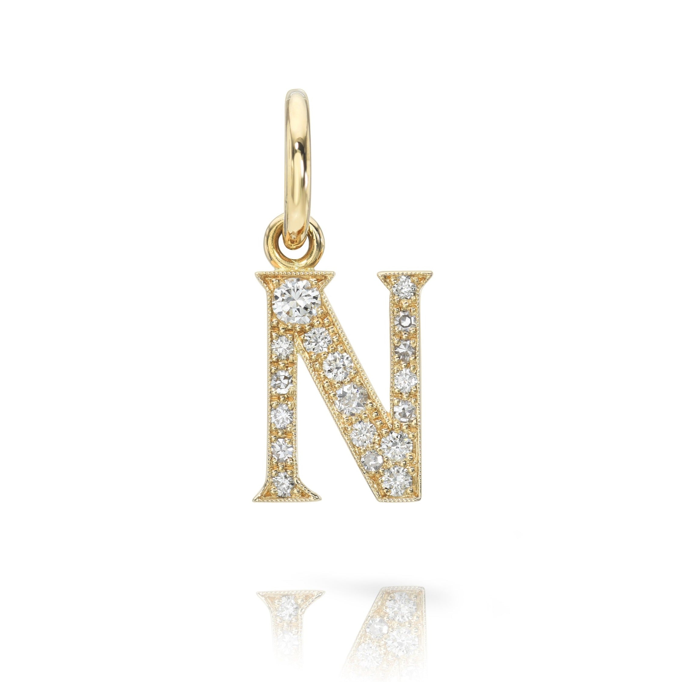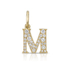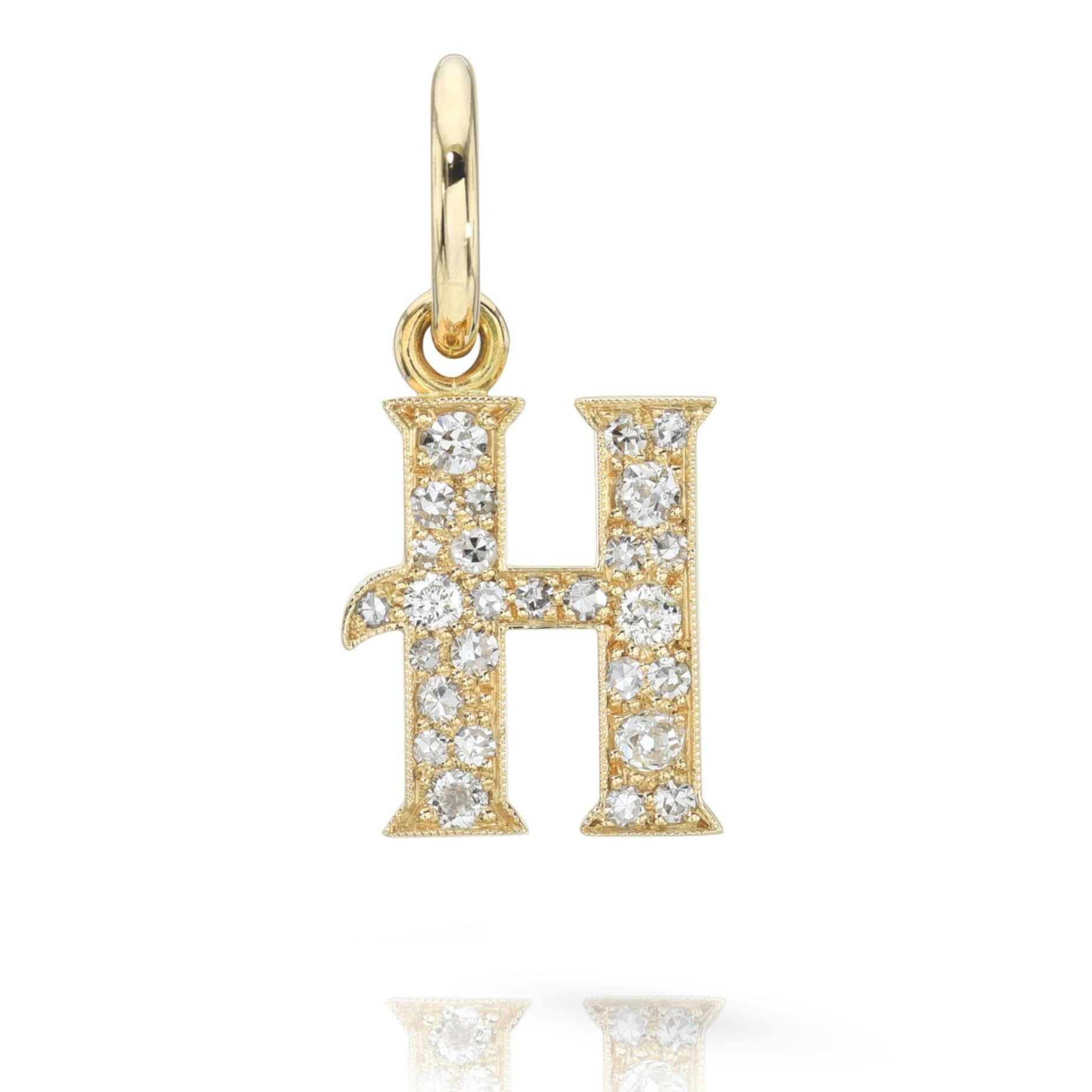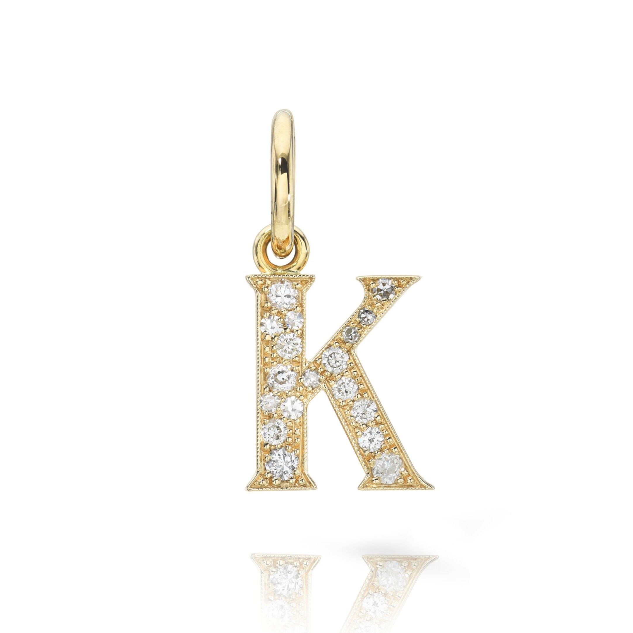 Approximately 0.15ctw-0.60ctw varying old and round brilliant cut diamonds set in a handcrafted 18K yellow gold letter pendant. Letters are approximately 1/2" tall. Available in an oxidized or polished finish. Please inquire for additional customization. Price does not include necklace, and may vary according to stone weight.