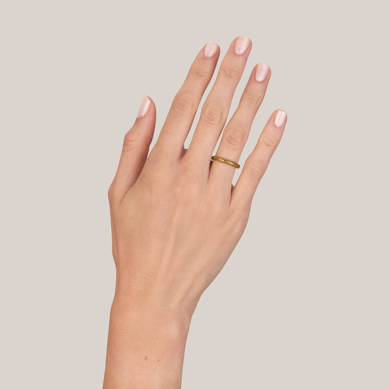 2.5mm handcrafted 18K oxidized yellow gold ladies' snake scale pattern band.