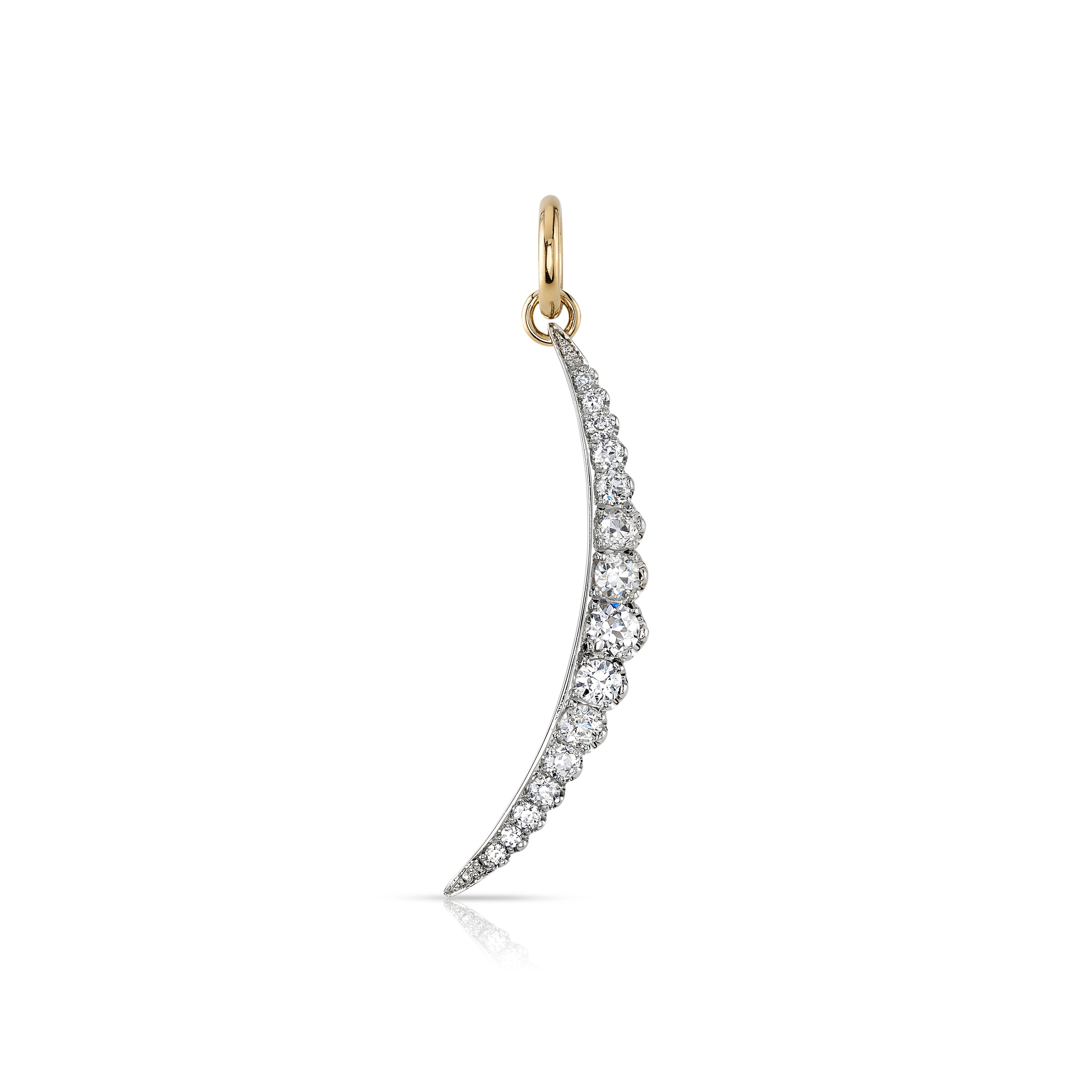 Approximately 0.30ctw old European cut diamonds set in a handcrafted 18K yellow gold and platinum crescent moon-shaped pendant.