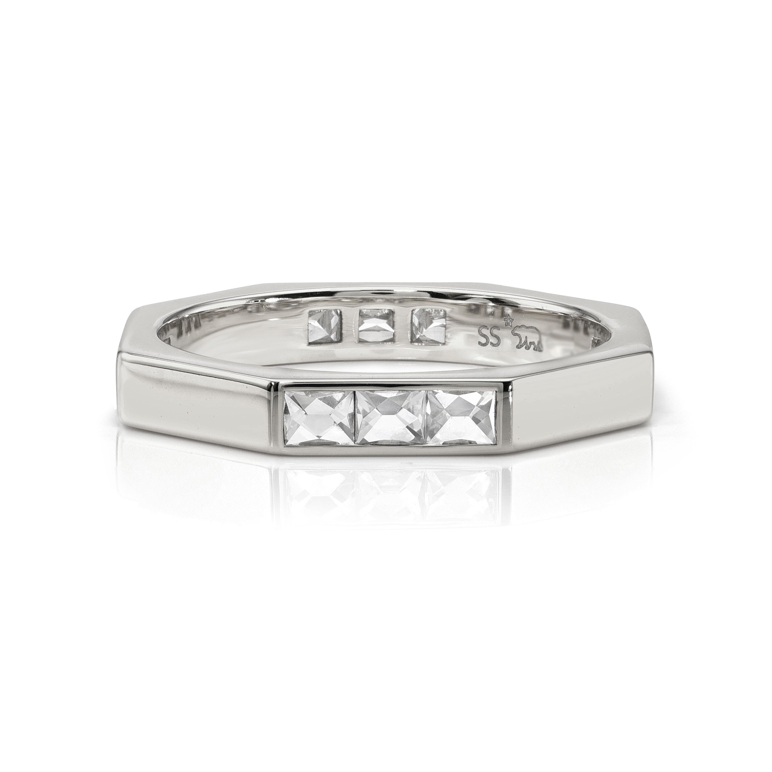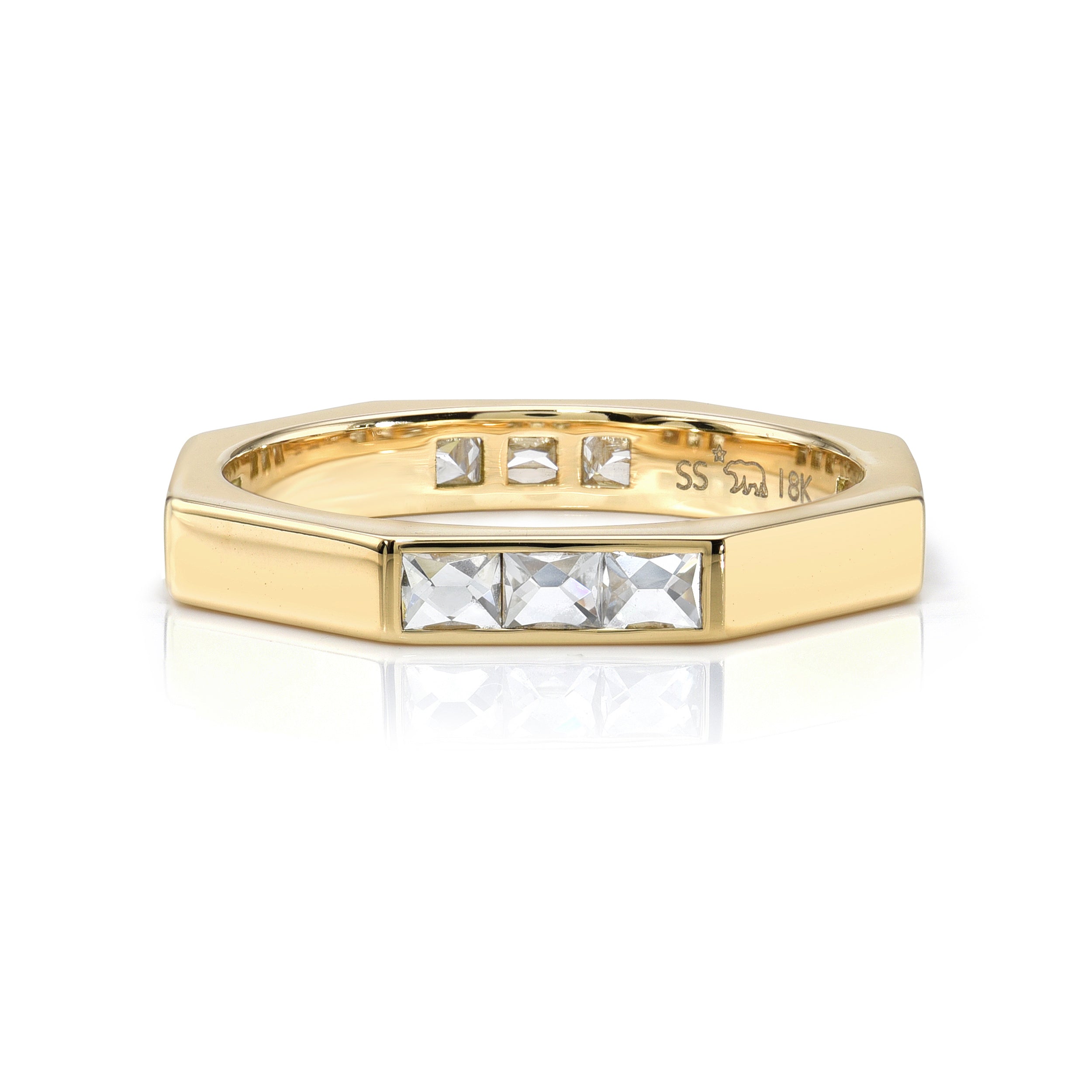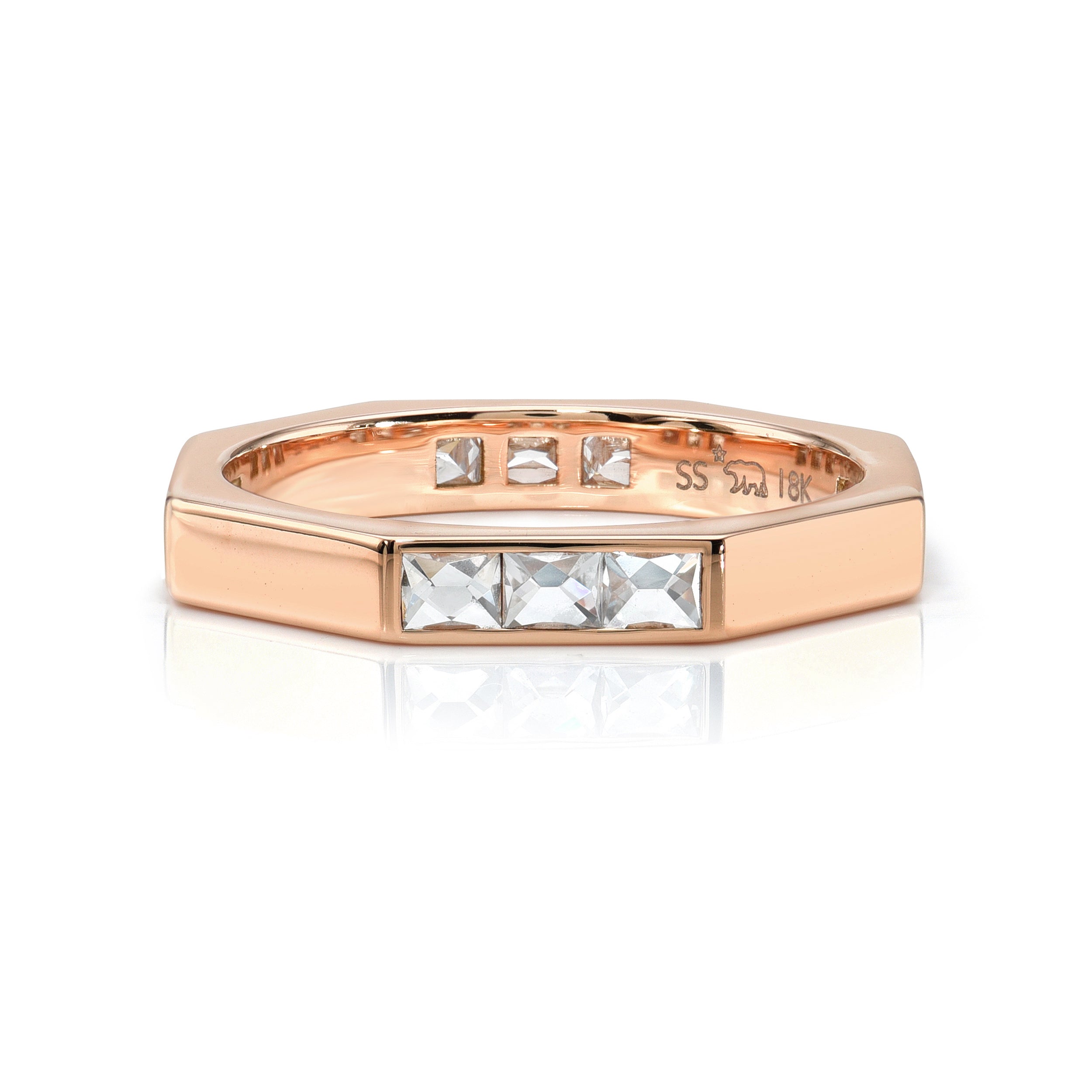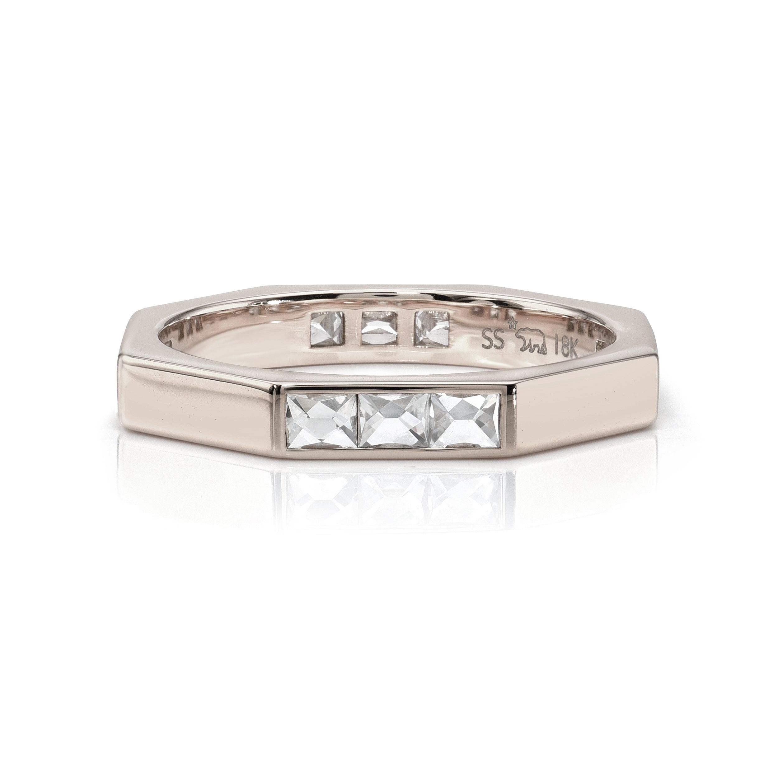 With their geometric lines, French cut diamonds reached their height of popularity in the Art Deco period. Square or rectangular in shape, French cuts feature a mix of step and triangular faceting, resulting in mirror-like flashes of brilliance. Our French cut diamonds are painstakingly hand-cut to order so that they fit seamlessly into our French cut diamond bands, or any of our other bespoke jewelry designs.