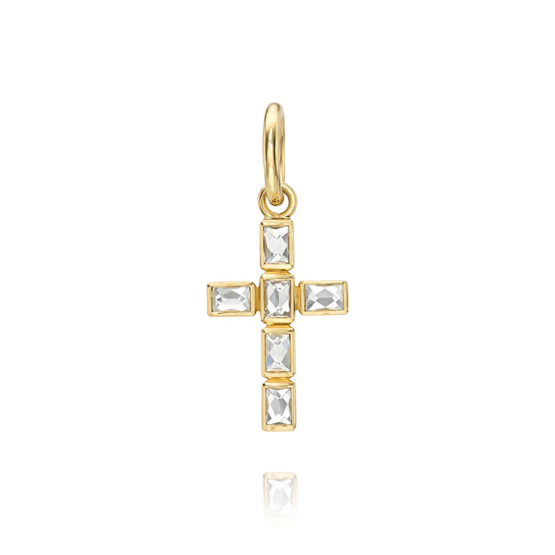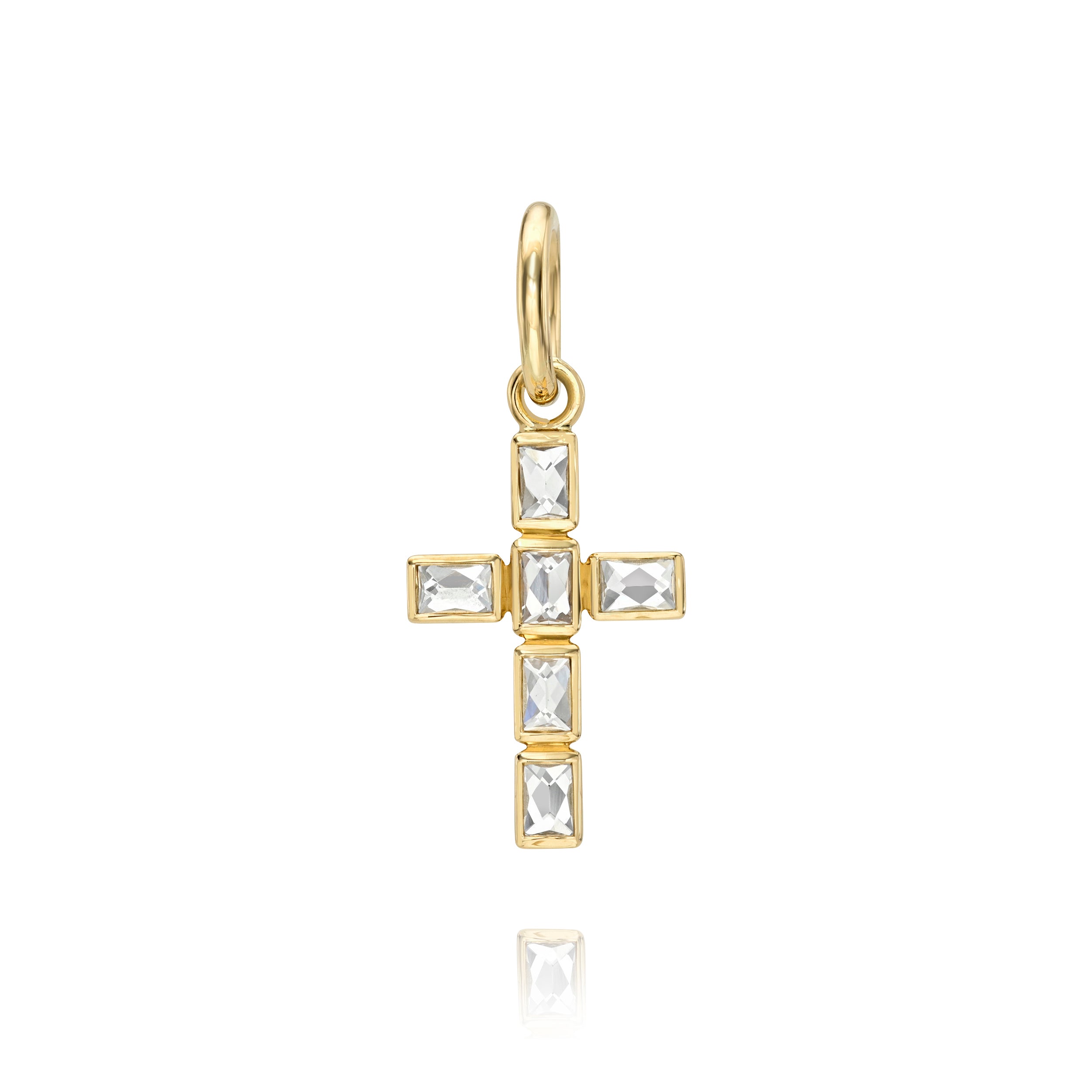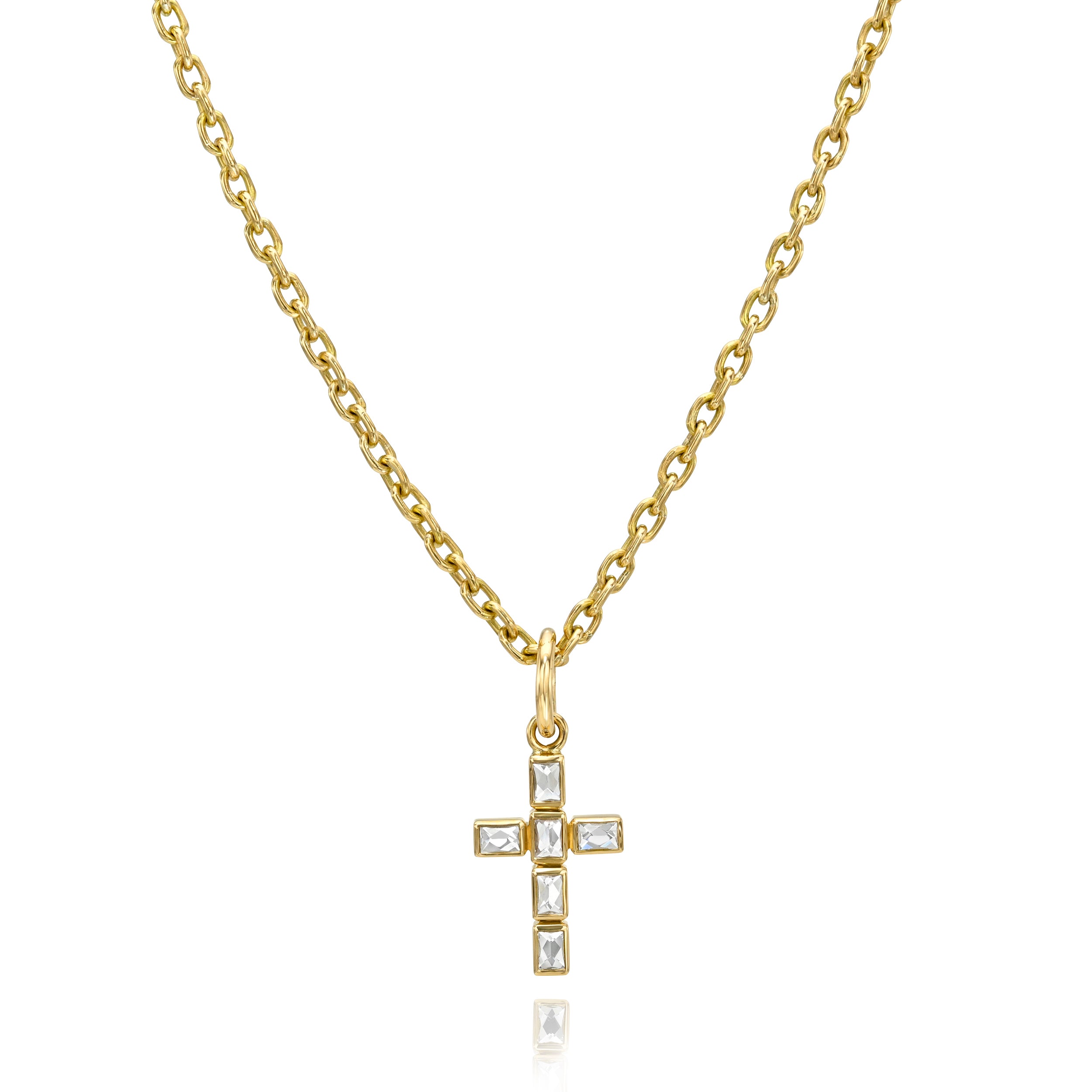 Approximately 0.65ctw G-H/VS French cut diamonds bezel set in a handcrafted 18K yellow gold cross pendant. Also shown here on our Kai chain.