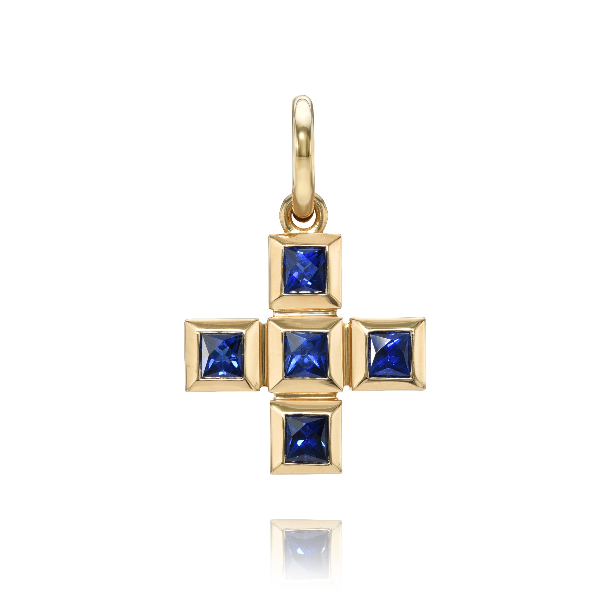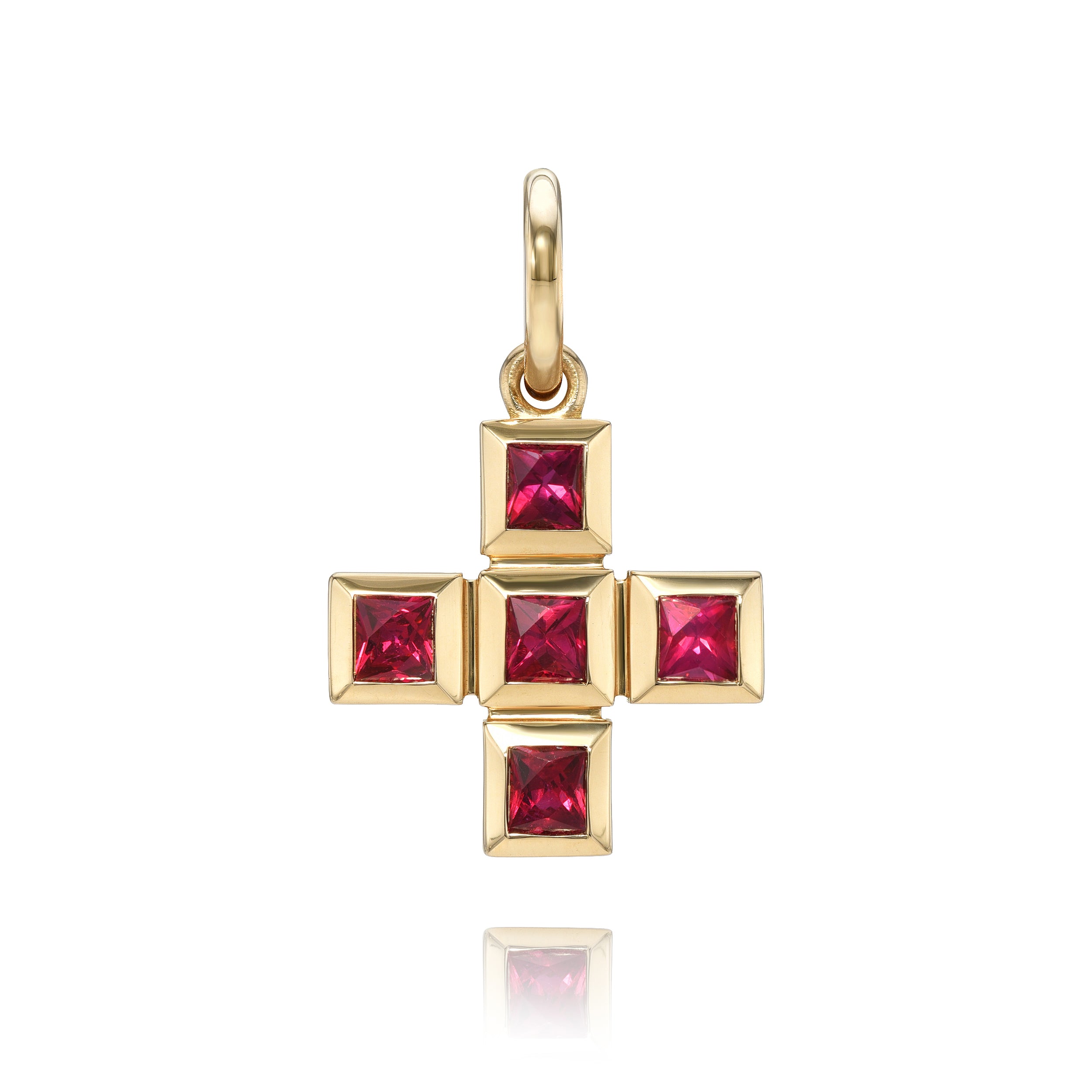 Approximately 1.20ctw-1.40ctw French cut gemstones bezel set in a handcrafted 18K yellow gold cross pendant.