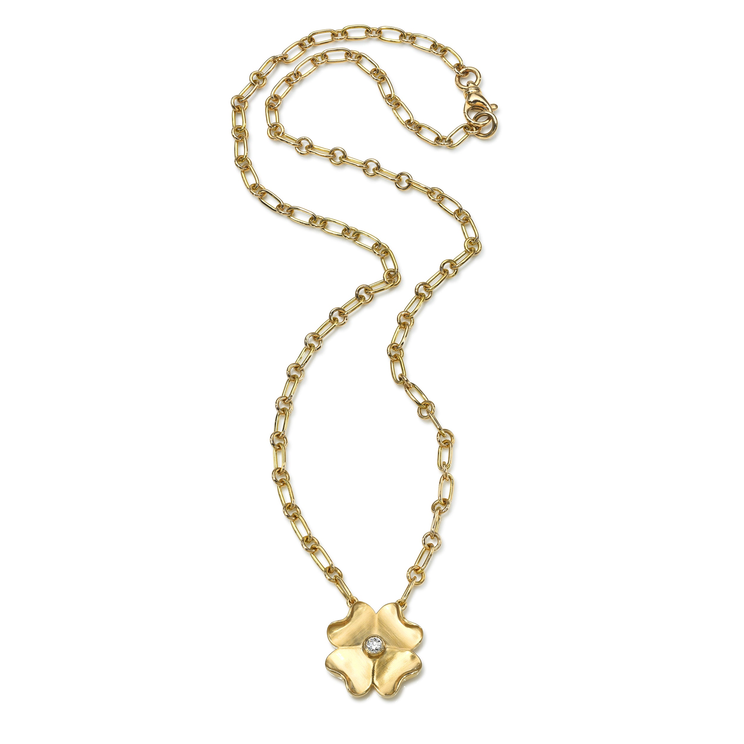 0.11ct G-H/VS old European cut diamond bezel set in a handcrafted 18K yellow gold clover shaped pendant mounted on our handcrafted 18K yellow gold Mini Lo necklace.