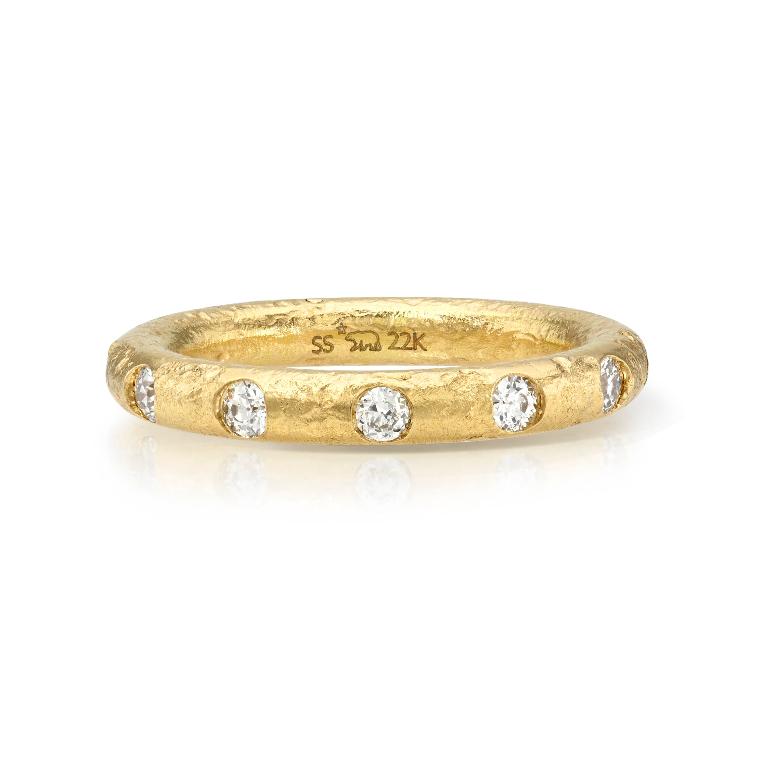 Approximately 0.55ctw G-H/VS old European cut diamonds flush set in a handcrafted 22K yellow gold hammer finished 3mm wide band.