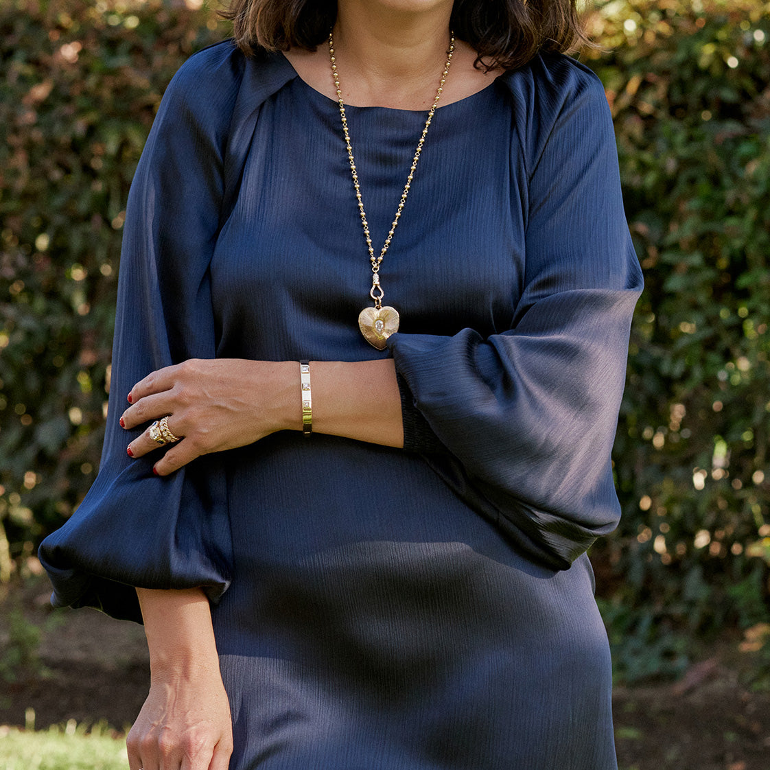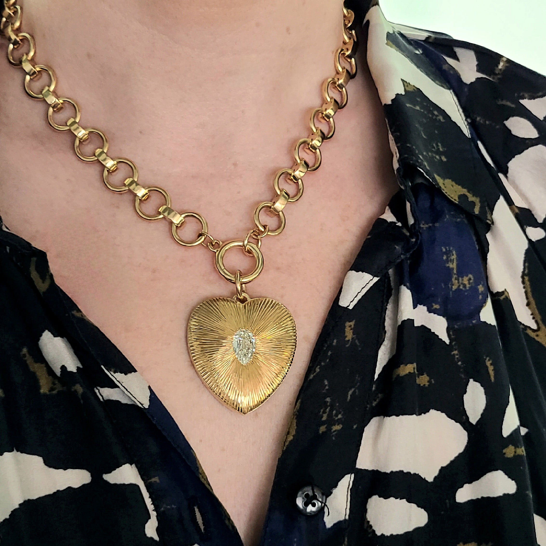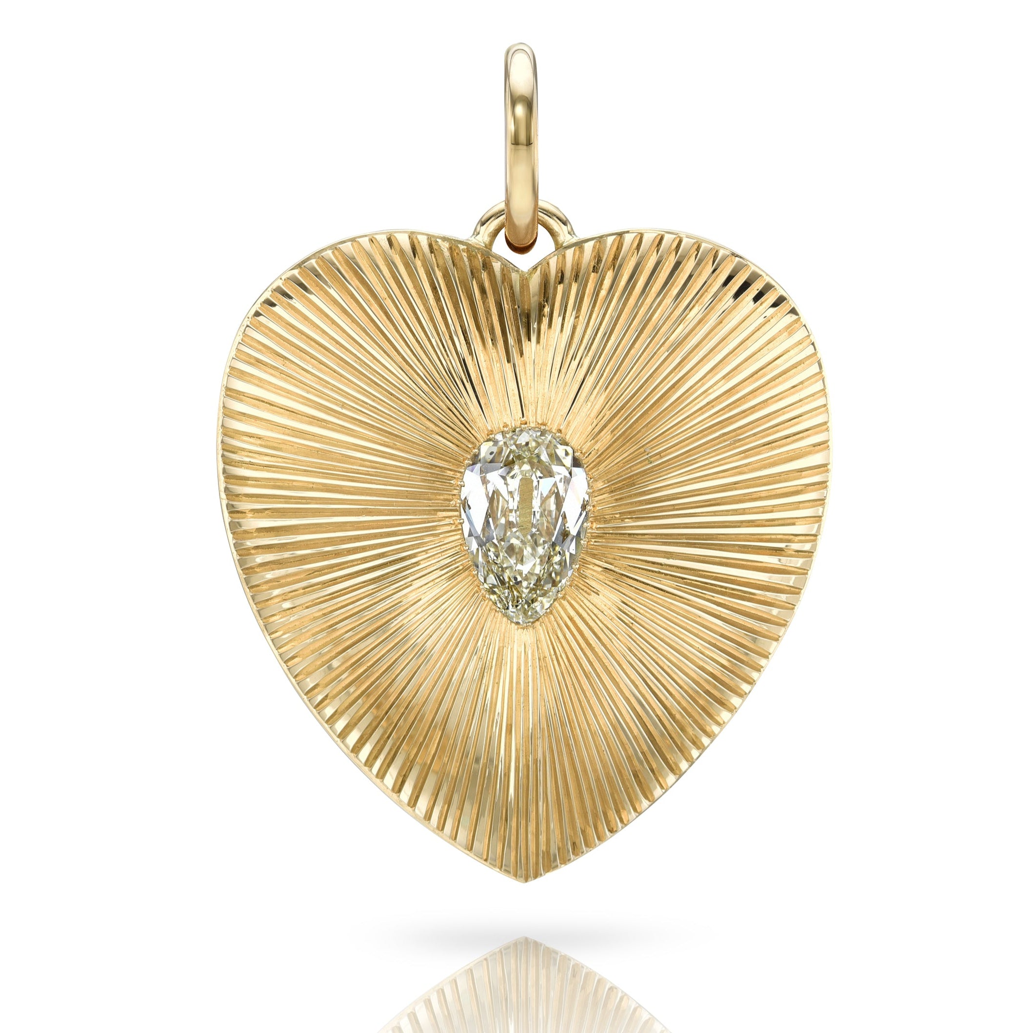 2.00ct L/SI1 GIA certified pear shape diamond prong set in a handcrafted 18K yellow gold heart-shaped pendant,