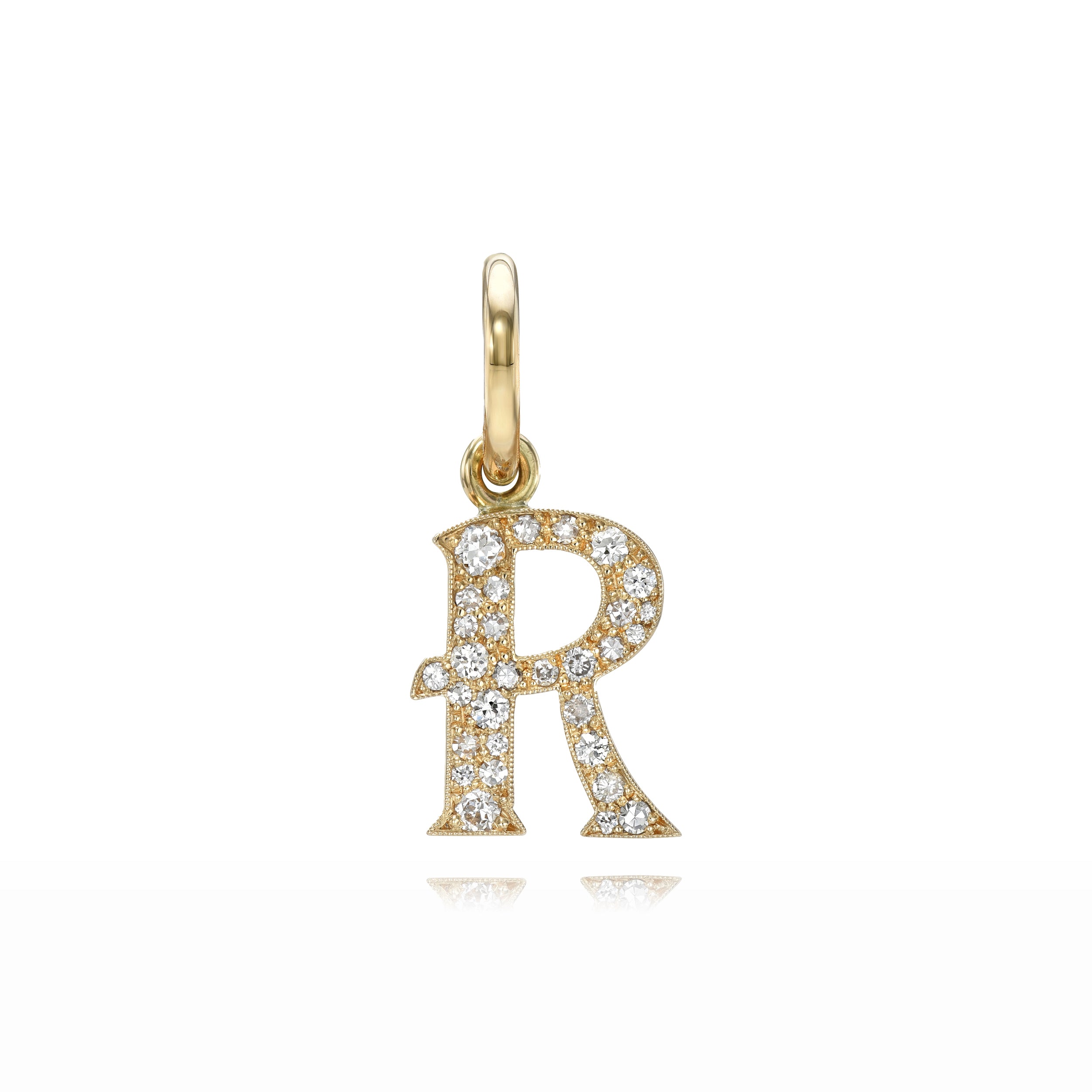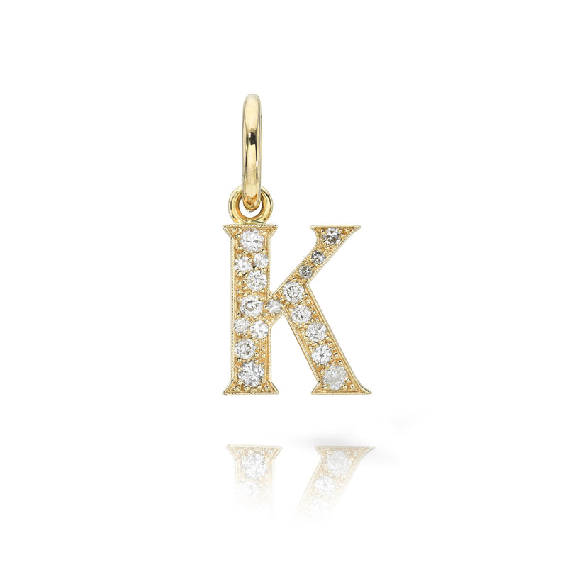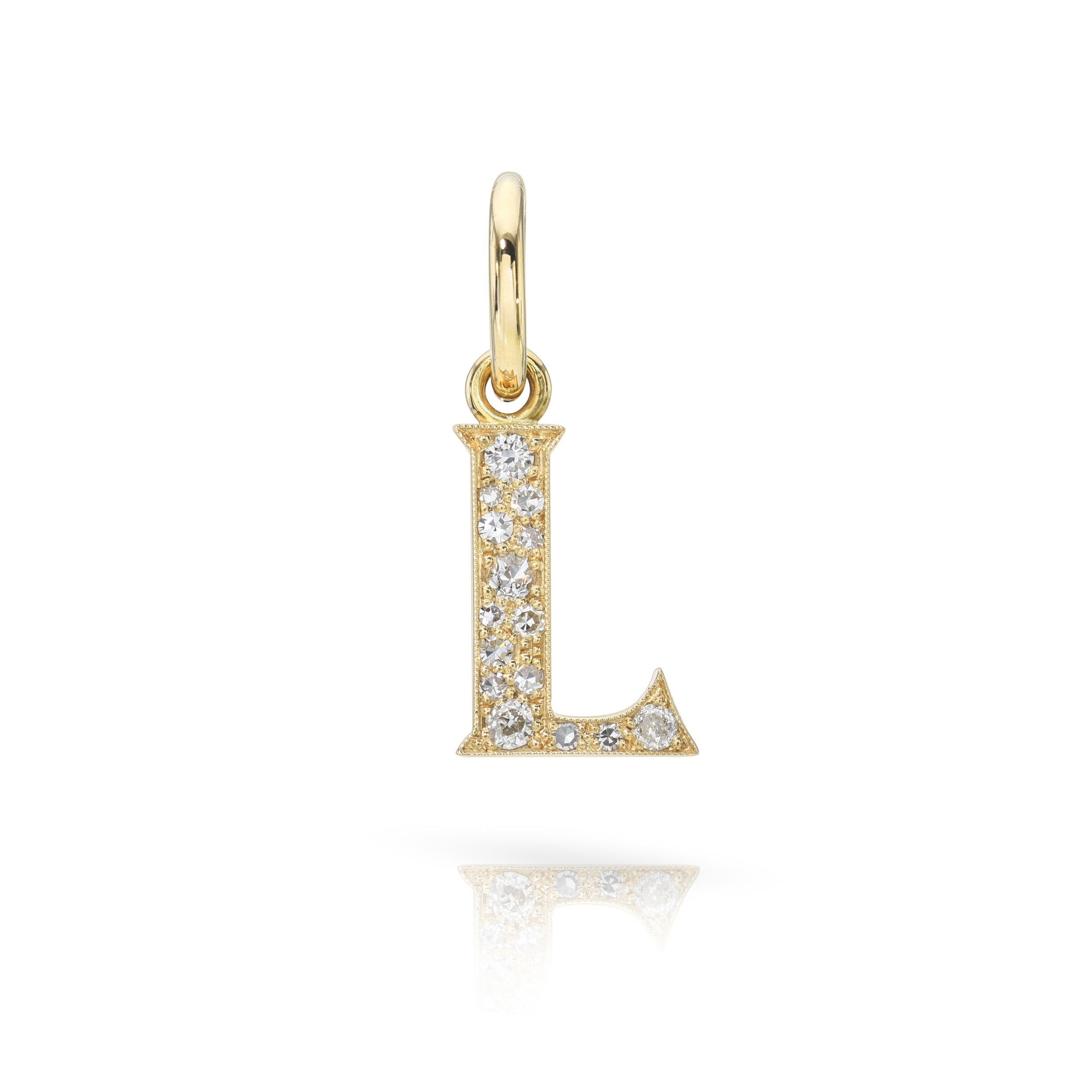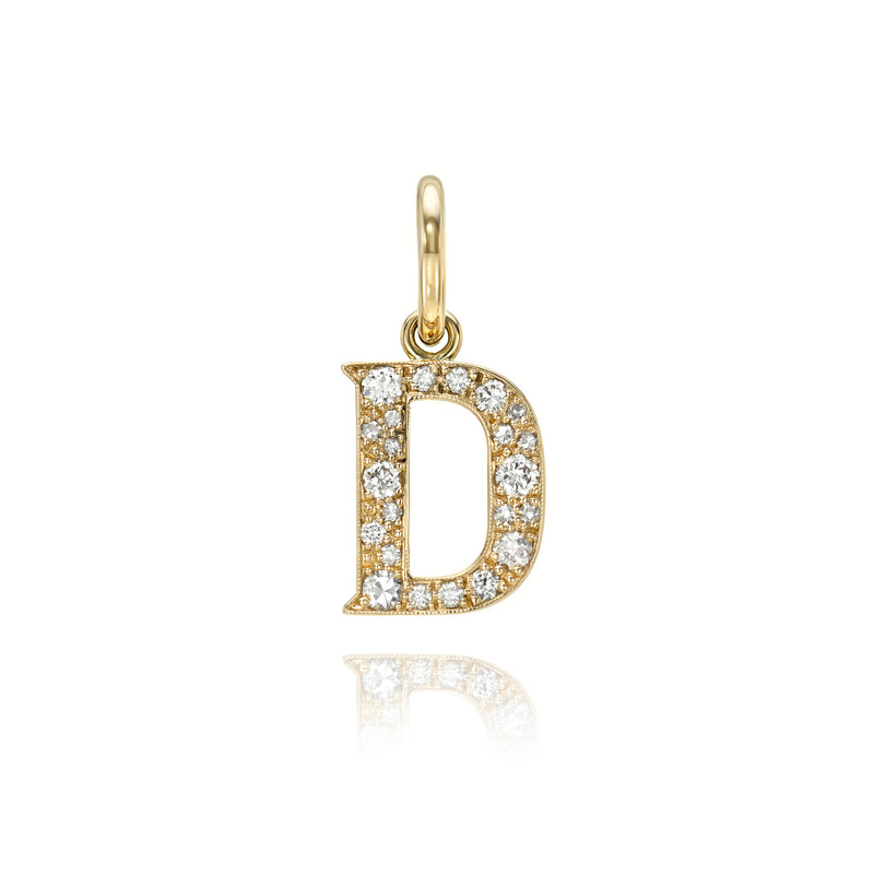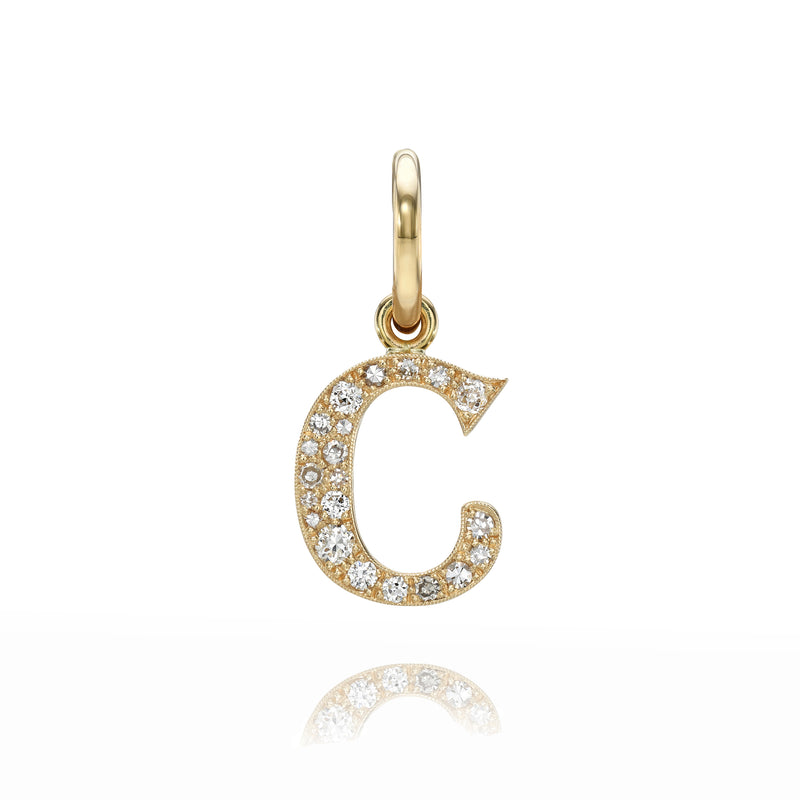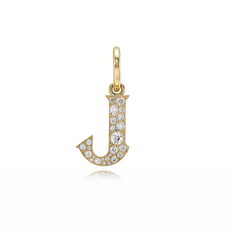 Approximately 0.15ctw-0.60ctw varying old and round brilliant cut diamonds set in a handcrafted 18K yellow gold letter pendant. Letters are approximately 1/2" tall. Available in an oxidized or polished finish. Please inquire for additional customization. Price does not include necklace, and may vary according to stone weight.