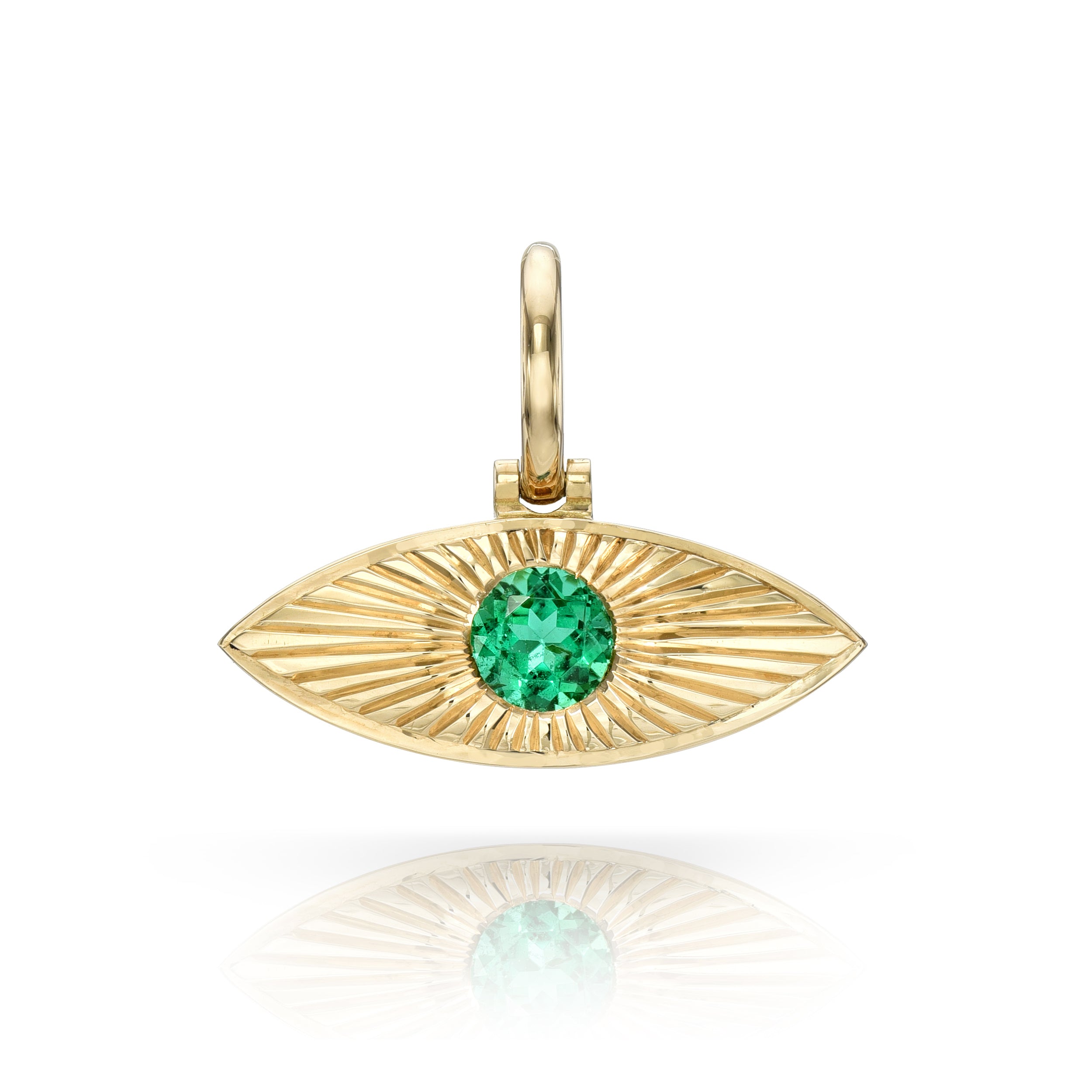 Approximately 0.35-0.40ct round cut green emerald set in a handcrafted 18K yellow gold semi-oval shaped pendant.