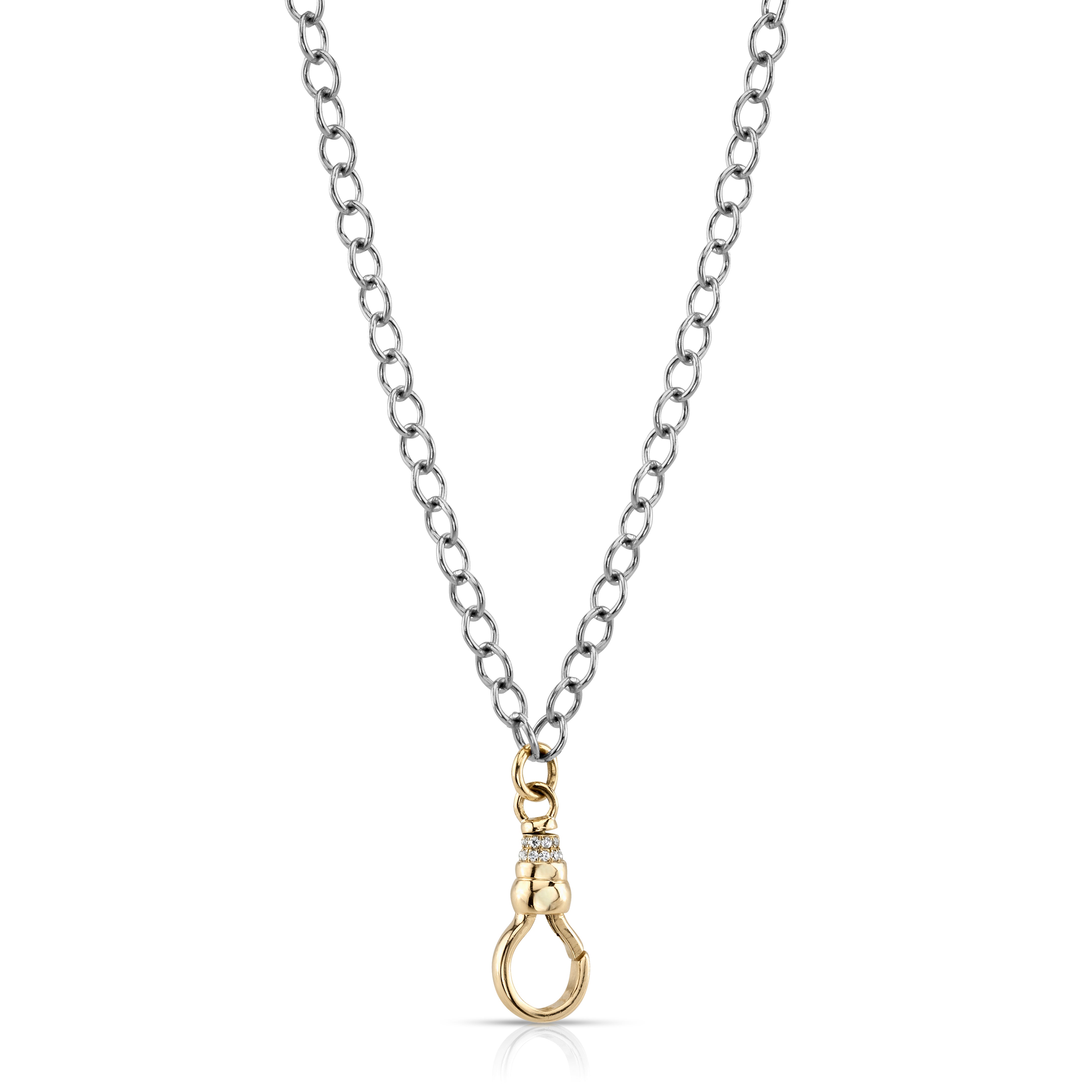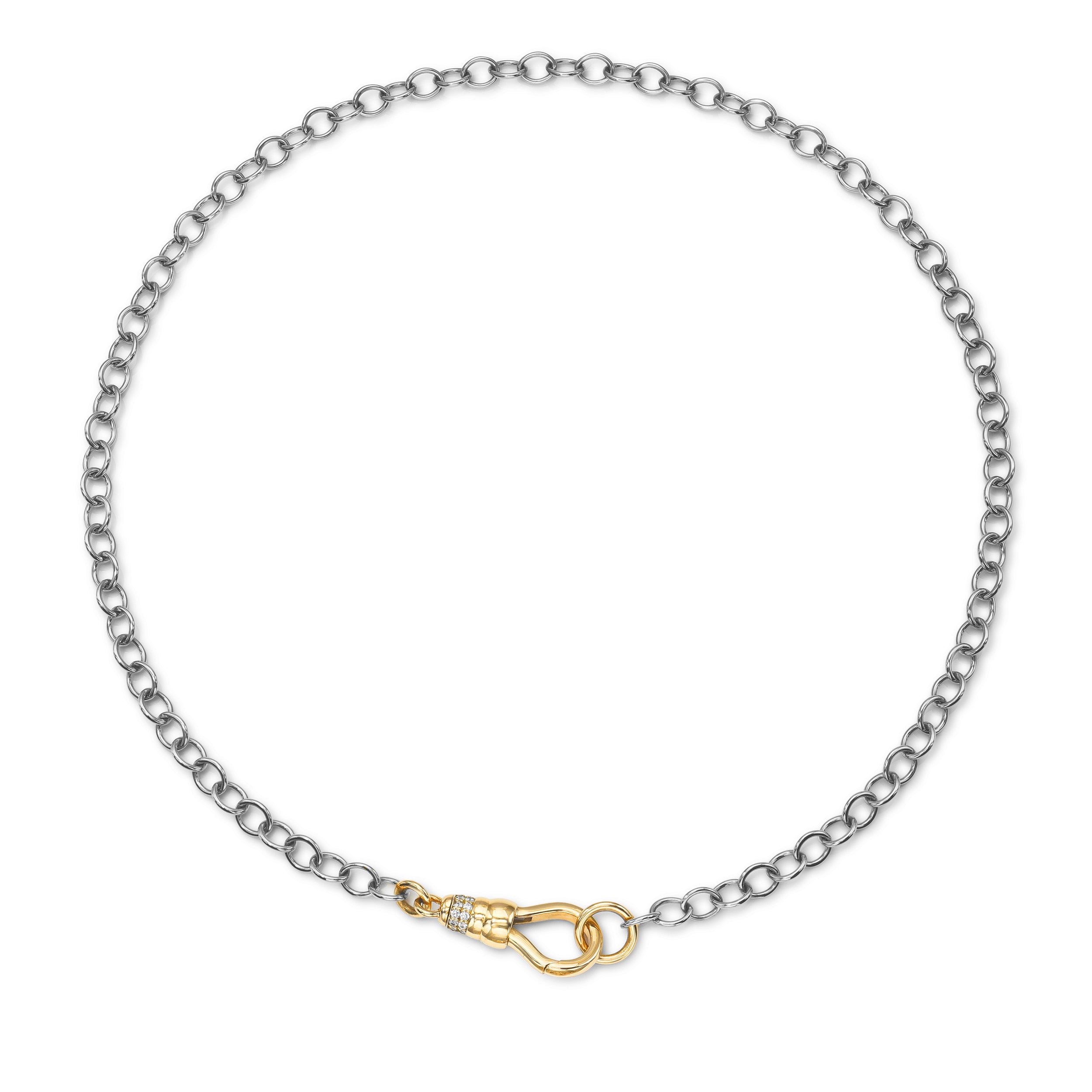 Handcrafted platinum Evren link chain featuring a 18K yellow gold fob clasp with approximately 0.20ctw G-H/VS pavé set old European cut accent diamonds.