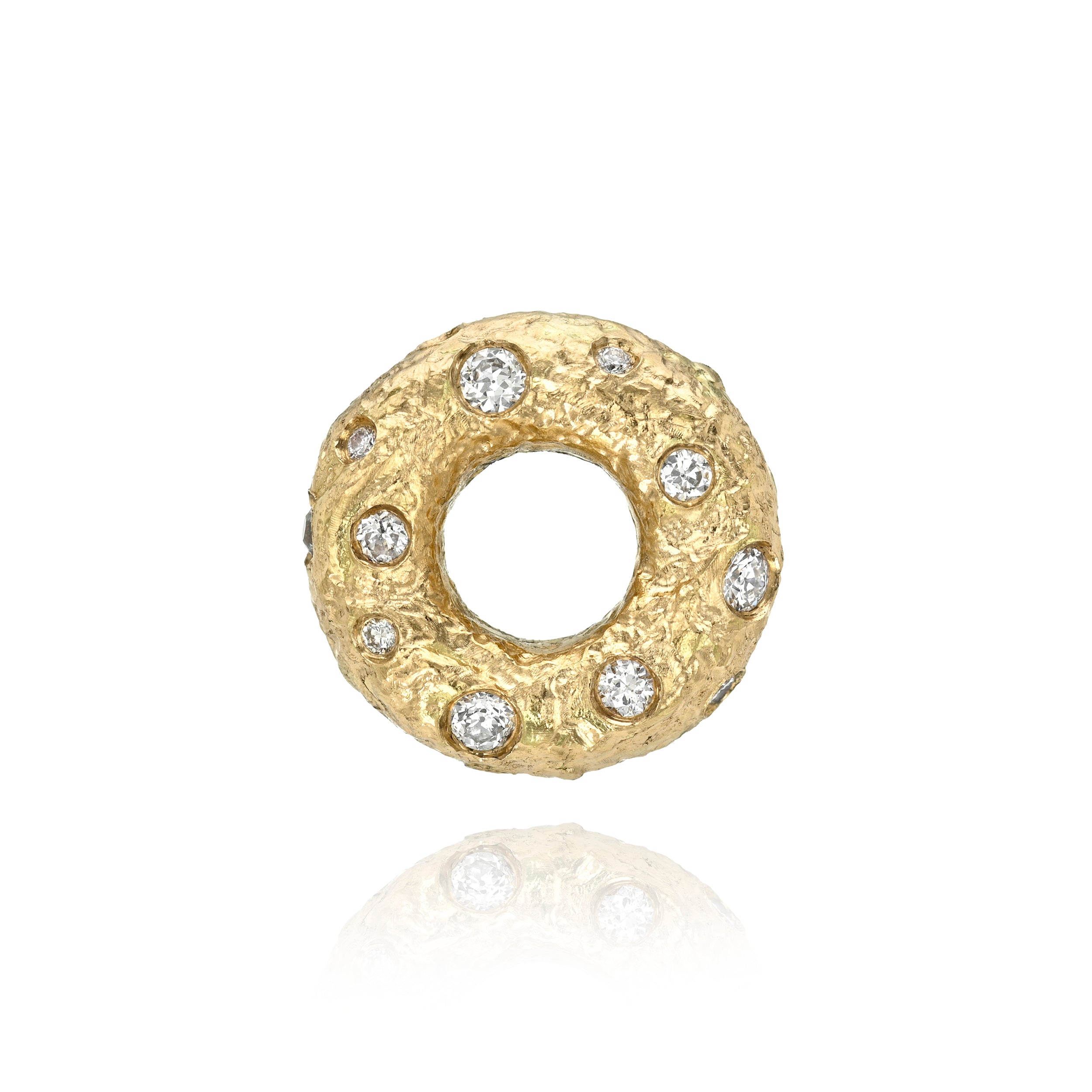 Handcrafted hammer finished 18K yellow gold rondel with approximately 1.00ctw flush set various old cut and round brilliant cut diamonds.