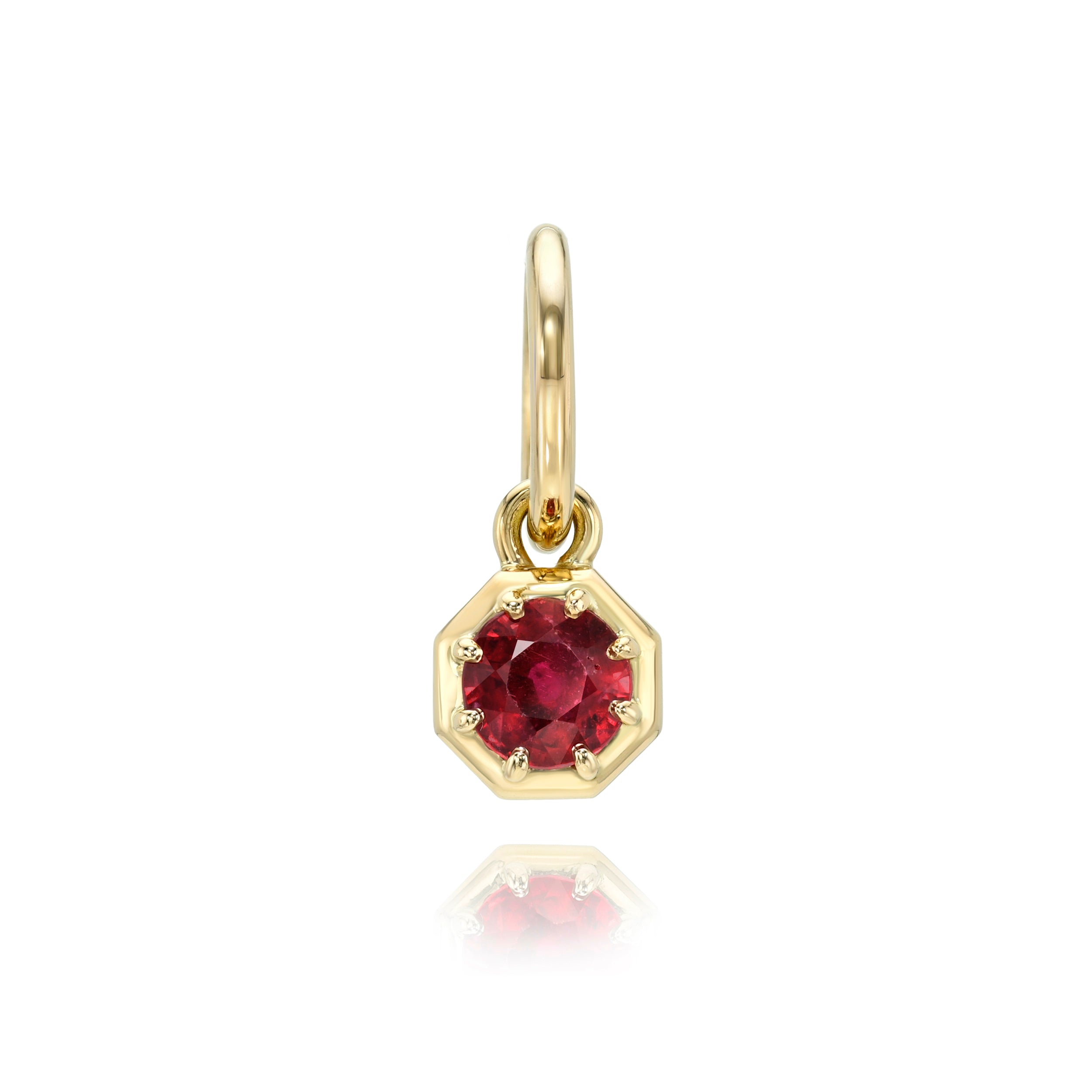 0.84ct round cut ruby prong set in a handcrafted 18K yellow gold pendant.