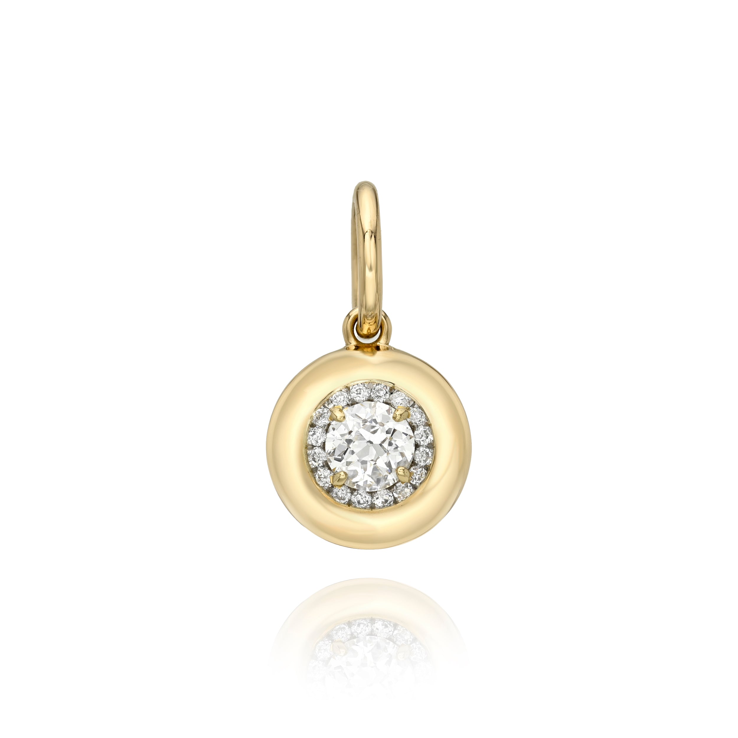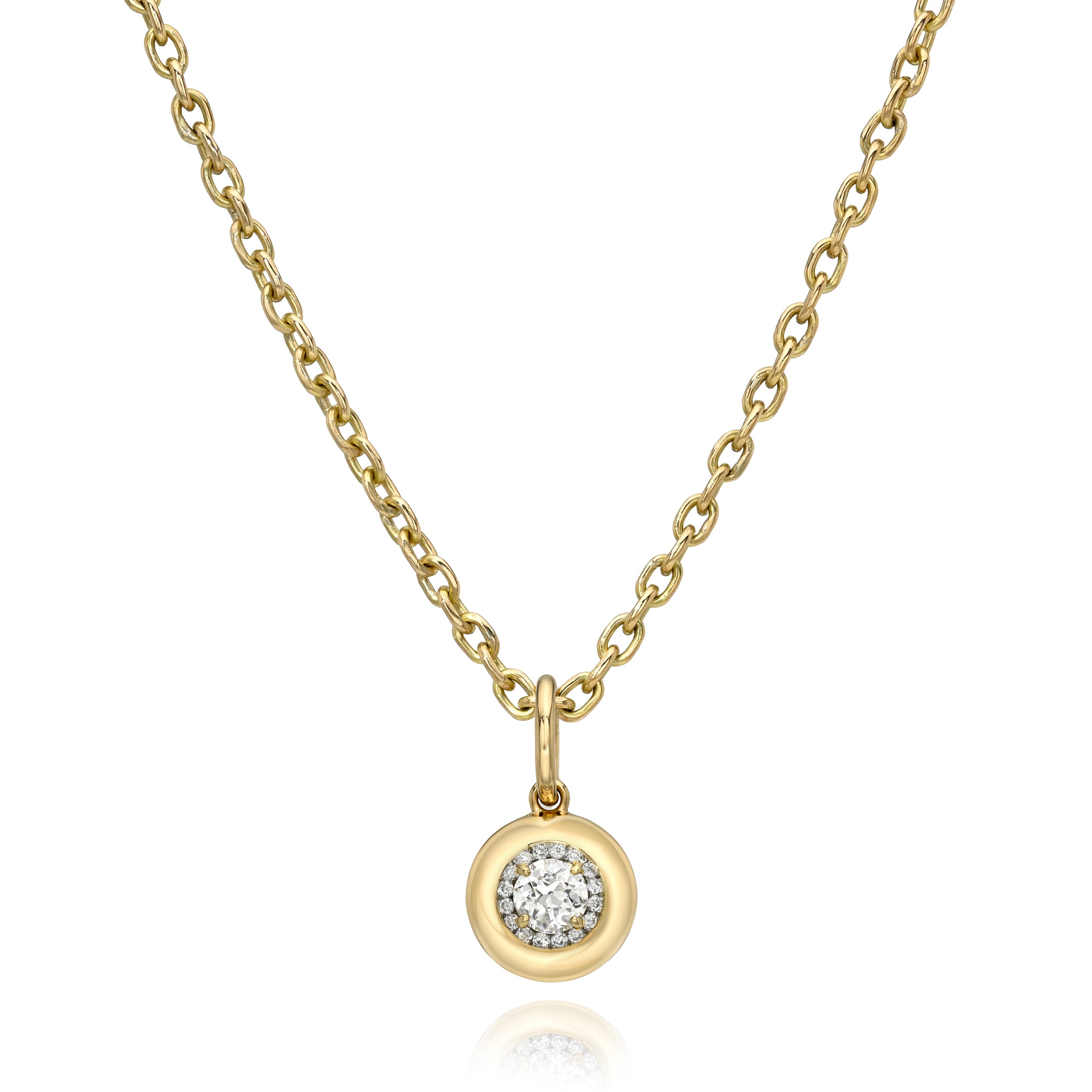 0.50ct I/VS2 GIA certified old European cut diamond surrounded by a platinum halo featuring 0.09ctw old European cut accent diamonds pavé set in a handcrafted 18K yellow gold pendant.