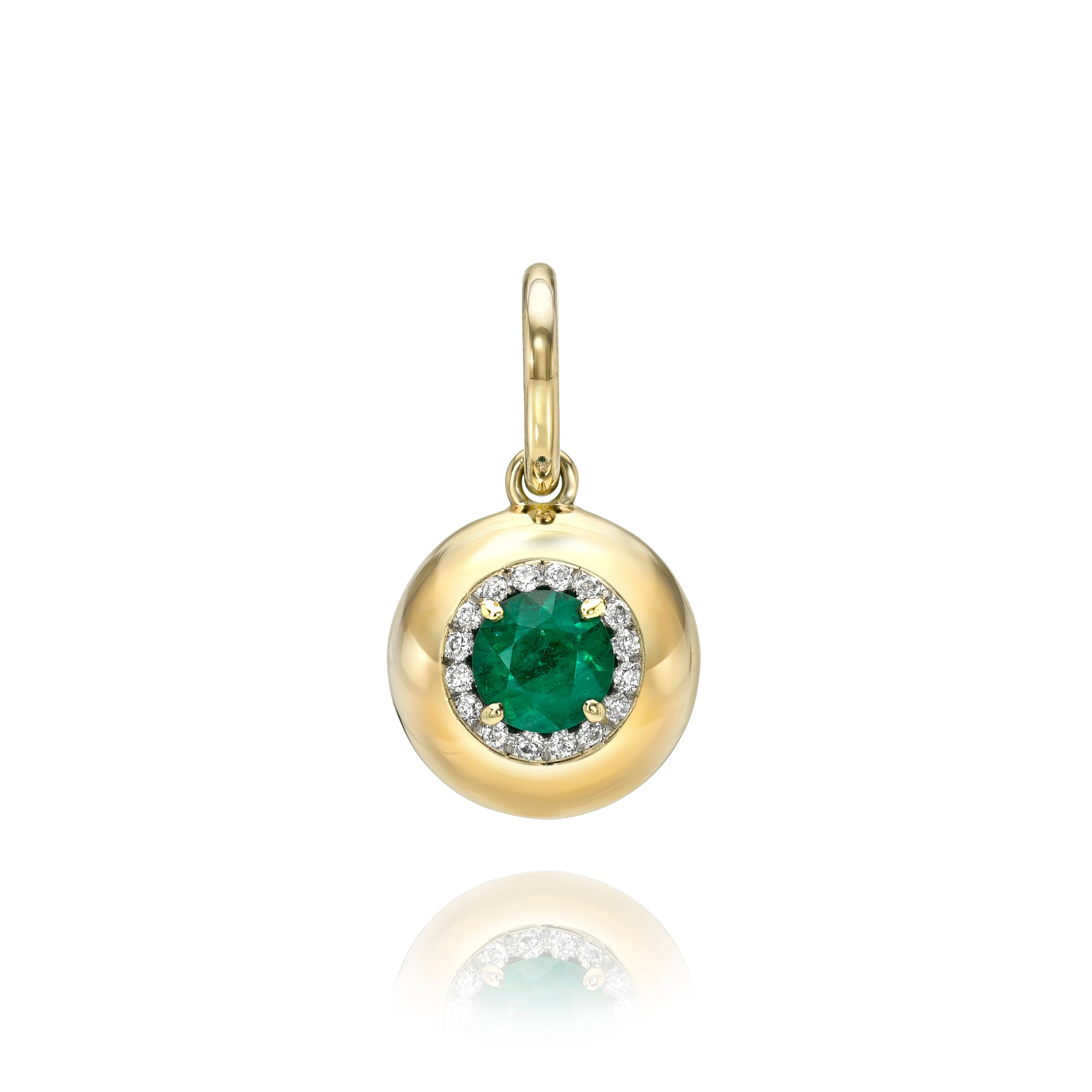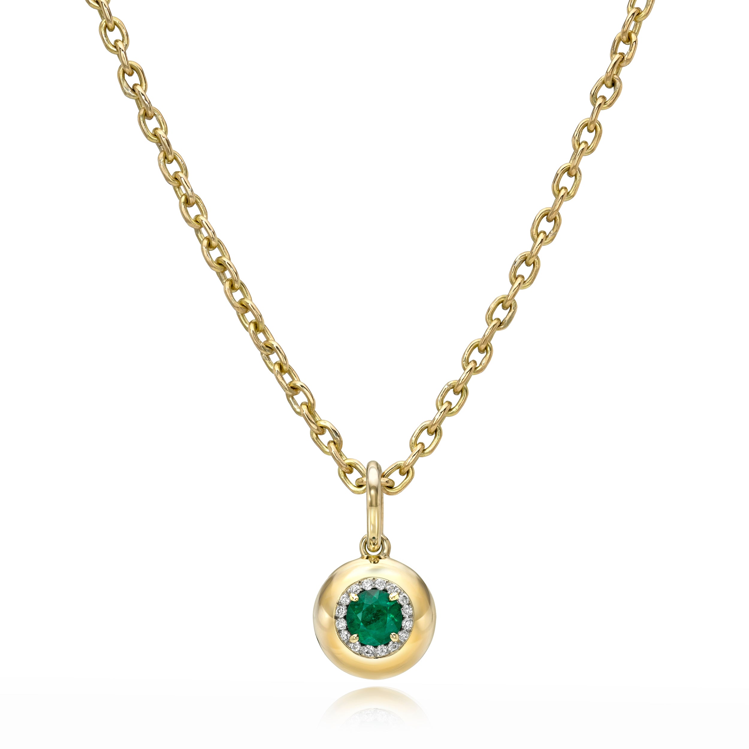 0.57ct round cut green emerald prong set, surrounded by a platinum halo featuring 0.09ctw pavé set old European cut accent diamonds in a handcrafted 18K yellow gold pendant.